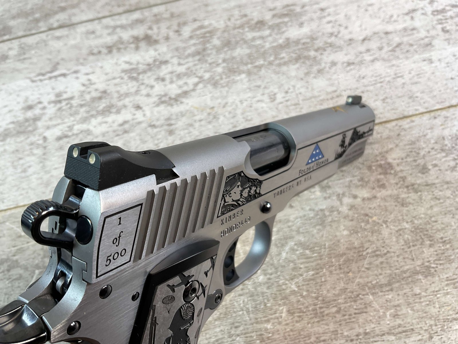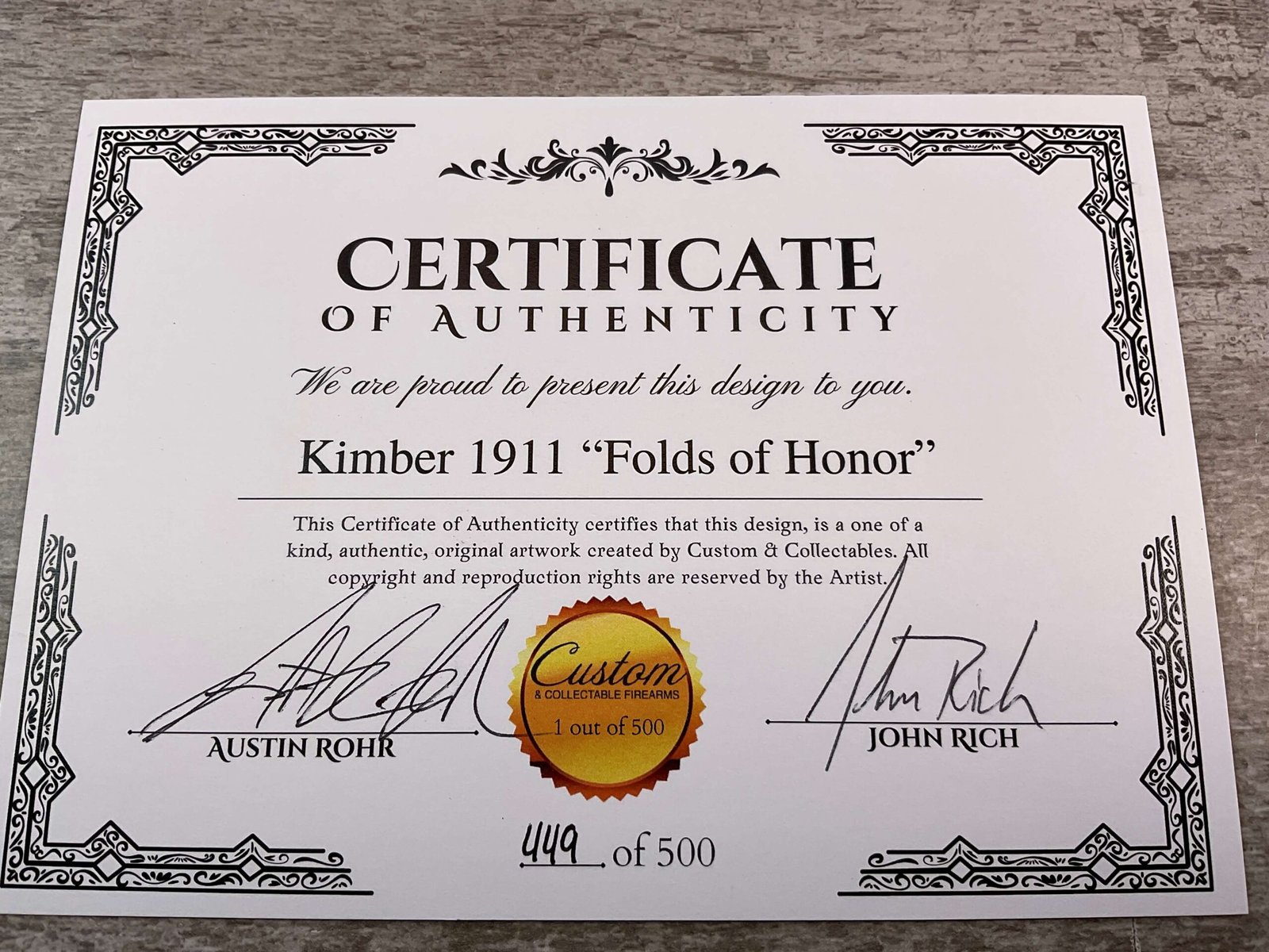 CNC KIMBER 1911 FOLDS OF HONOR COLLECTABLE 45 ACP, LIMITED SERIES #HONOR449 SEQUENTIAL NUMBERED SERIES, 449 OF 500, HISTORIC WAR SCENE ENGRAVED WITH BACKFILL ON SLIDE, DUST COVER AND GRIPS, GOLD STAR TRIBUTE ETCHED ON TOP OF SLIDE, BARREL AND TRIGGER HIGH POLISHED BLACK DLC, NEW IN BOX, PAPERWORK, CERTIFICATE OF AUTHENTICITY.
