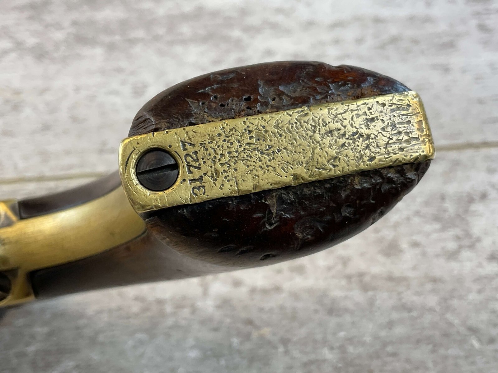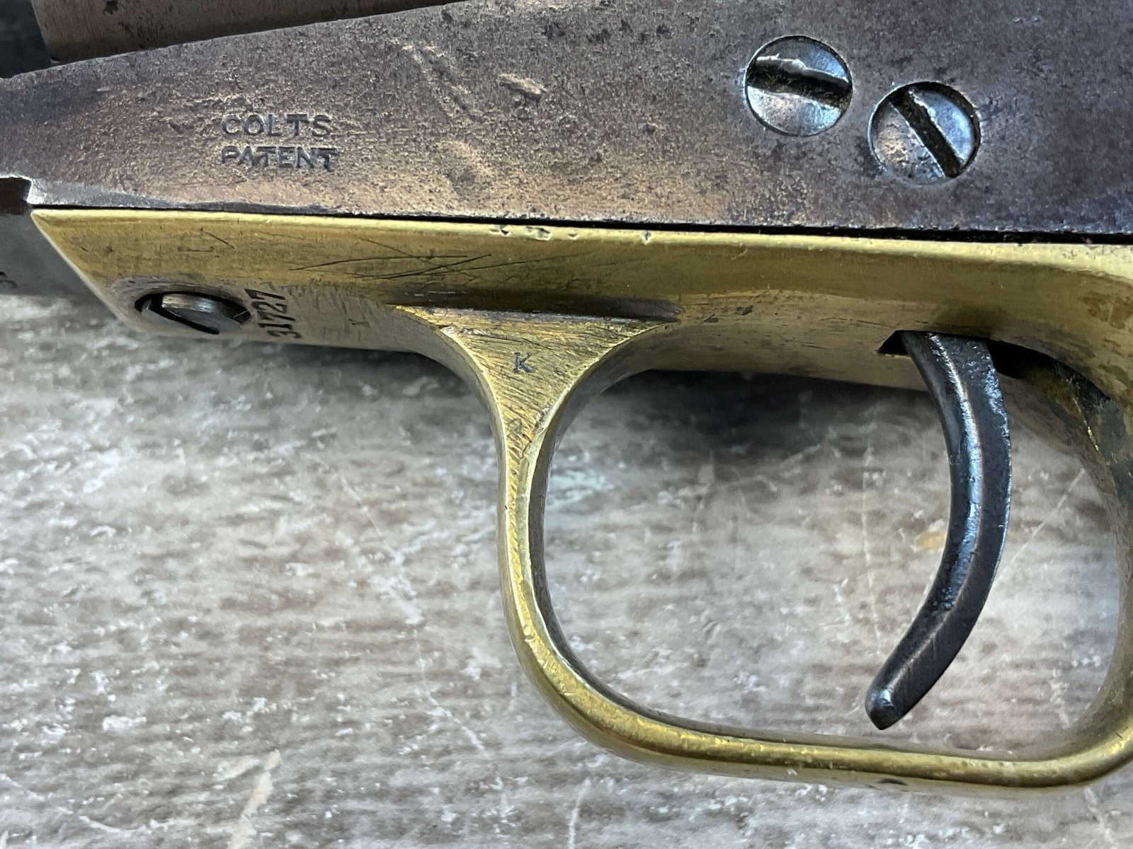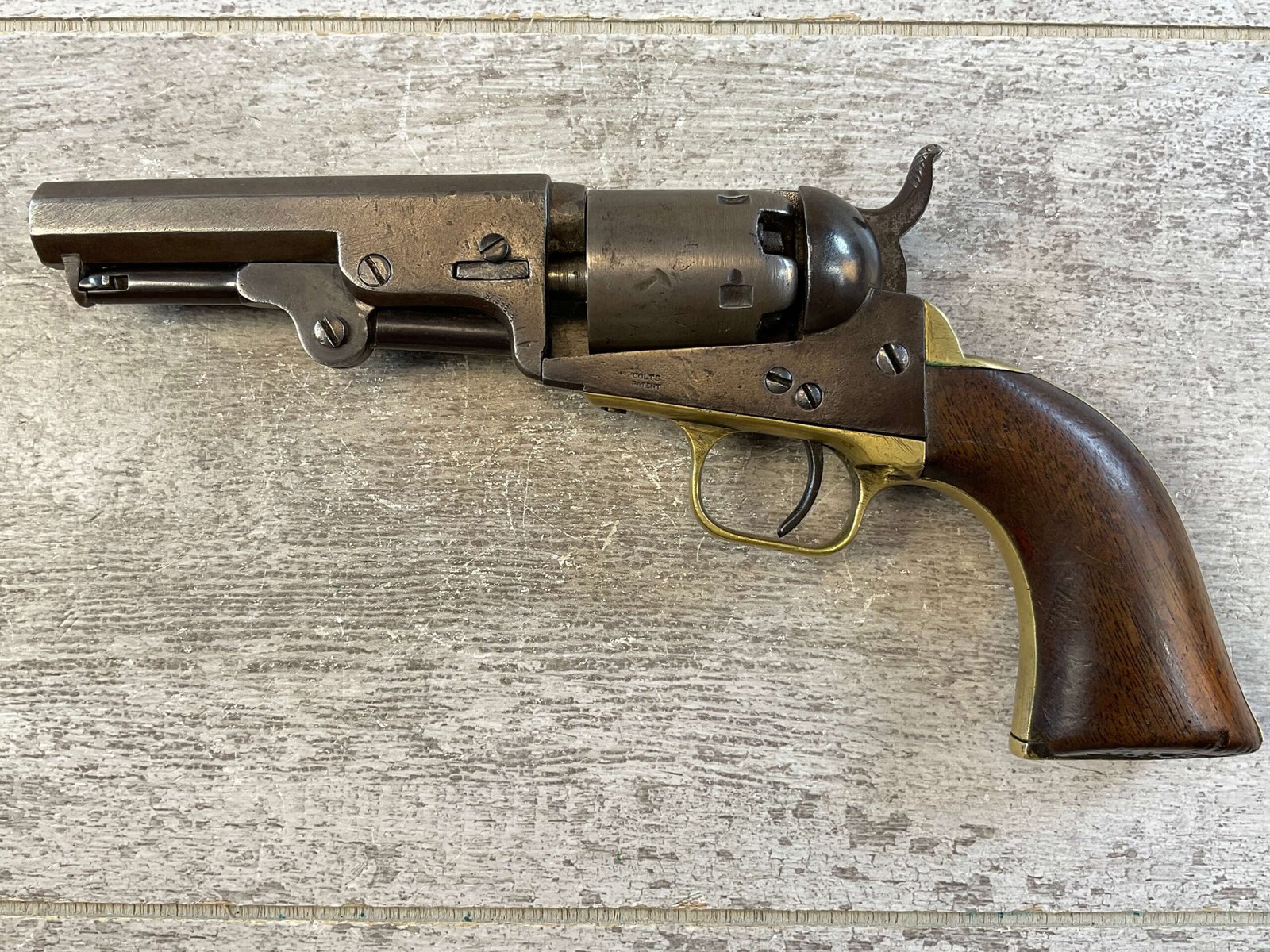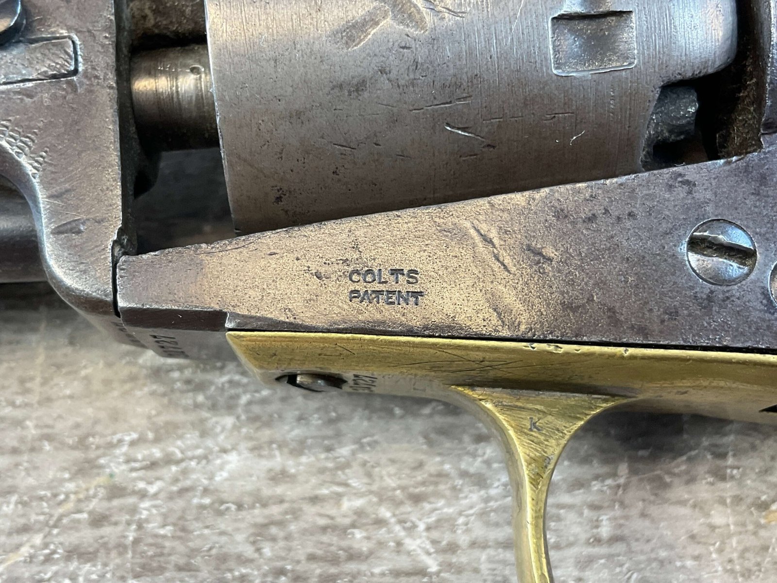 COLT 1849 STAGE COACH .31 CAL ANTIQUE REVOLVER, 1852 MFR #31727, .31 CAL, ALL MATCHING, 4″ OCTAGON BARREL, DARK FROSTED BORE W/LIGHT RIFLING, EXTREMELY FAINT STAGE COACH CYLINDER SCENE VISIBLE, GREY PATINA THROUGHOUT, BRASS BACKSTRAP & TRIGGER GUARD, GOOD SMOOTH WALNUT GRIPS W/BUTT USED AS A HAMMER AT ONE TIME, FULLY FUNCTIONING EXCEPT WILL NOT ROTATE PAST ONE CYLINDER, NOT A REPRODUCTION, CONDITION AS SHOWN IN PICTURES, FROM THE JAMES EARL JONES “FAVORITES” COLLECTION W/ CERTIFICATE OF AUTHENTICITY.