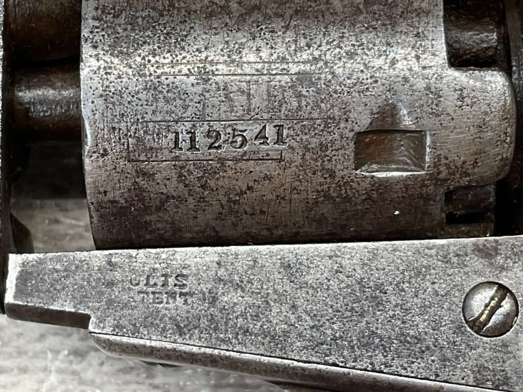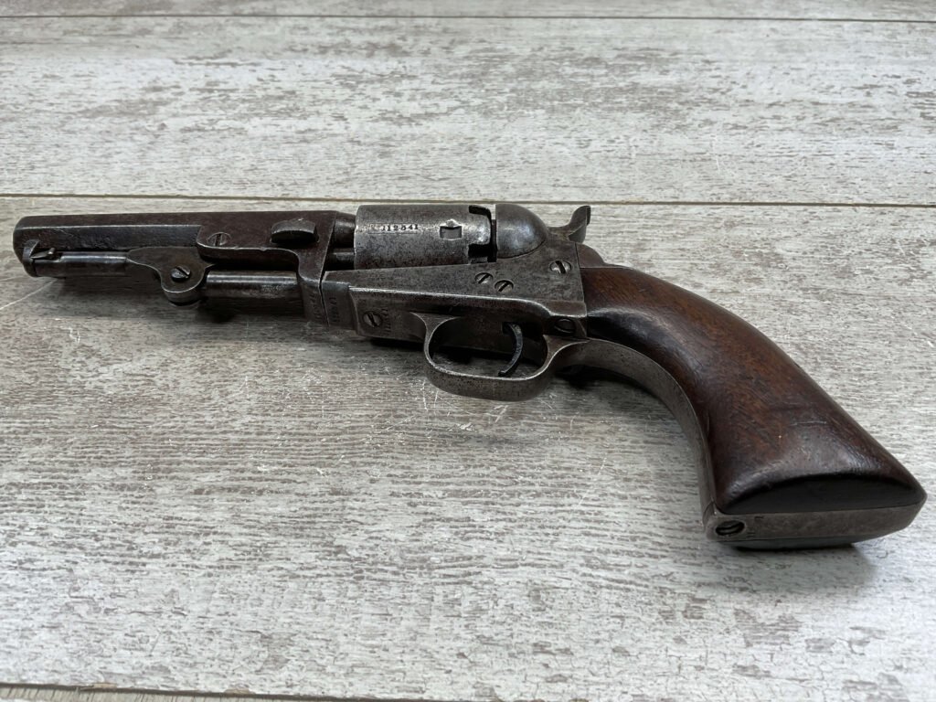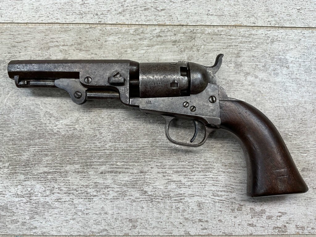 COLT 1849 STAGE COACH ANTIQUE REVOLVER, 1856 MFR, #112541, .31 CAL, ALL MATCHING, 4″ OCTAGON BARREL, WEAK CYLINDER STAGE COACH CYLINDER SCENE, BROWN PATINA, VG WALNUT SMOOTH GRIPS, NOT A REPRODUCTION, OVERALL CONDITION AS SEEN IN PHOTOS.