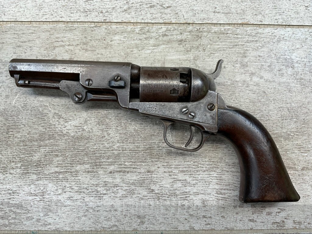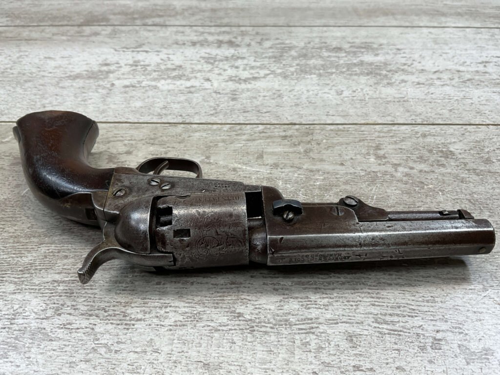 COLT 1849 STAGE COACH ANTIQUE REVOLVER, 1861 MFR #185739, .31 CAL, ALL MATCHING, 4″ OCTAGON BARREL, WEAK CYLINDER STAGE COACH CYLINDER SCENE, BROWN PATINA, VG WALNUT SMOOTH GRIPS, NOT A REPRODUCTION, OVERALL CONDITION AS SEEN IN PHOTOS.