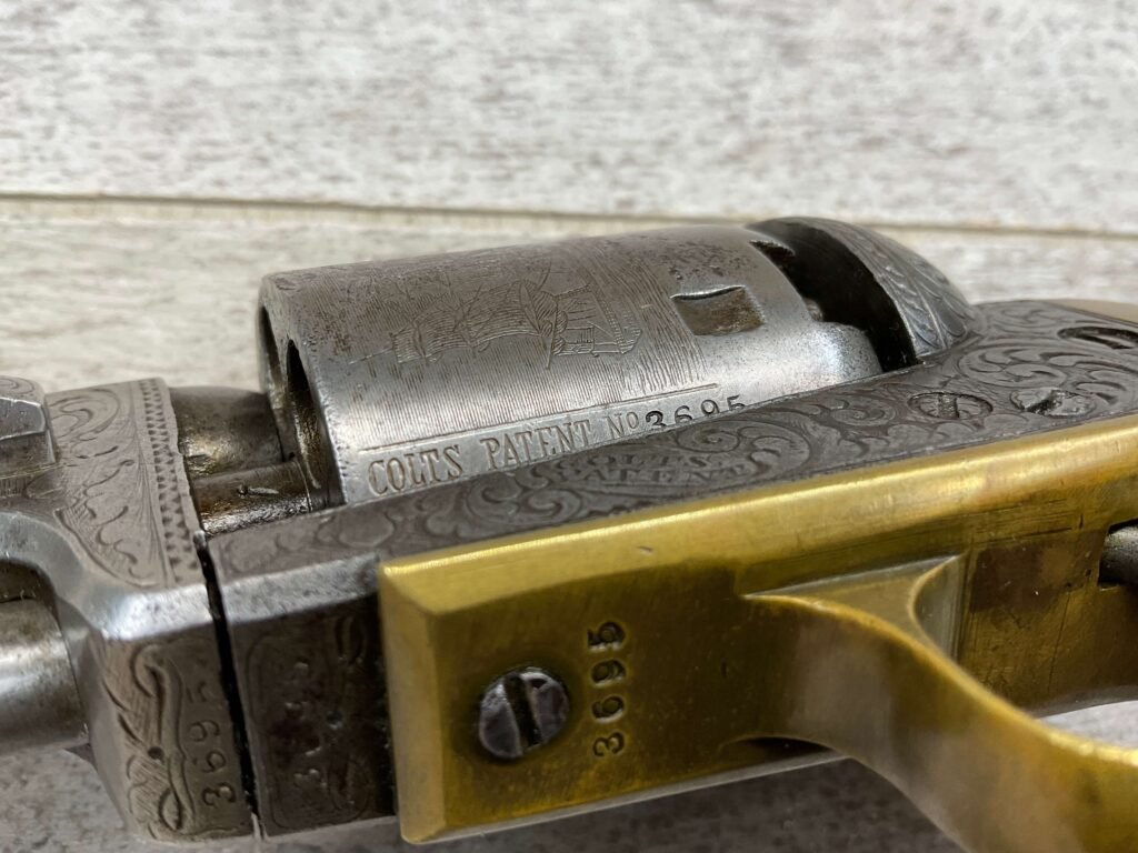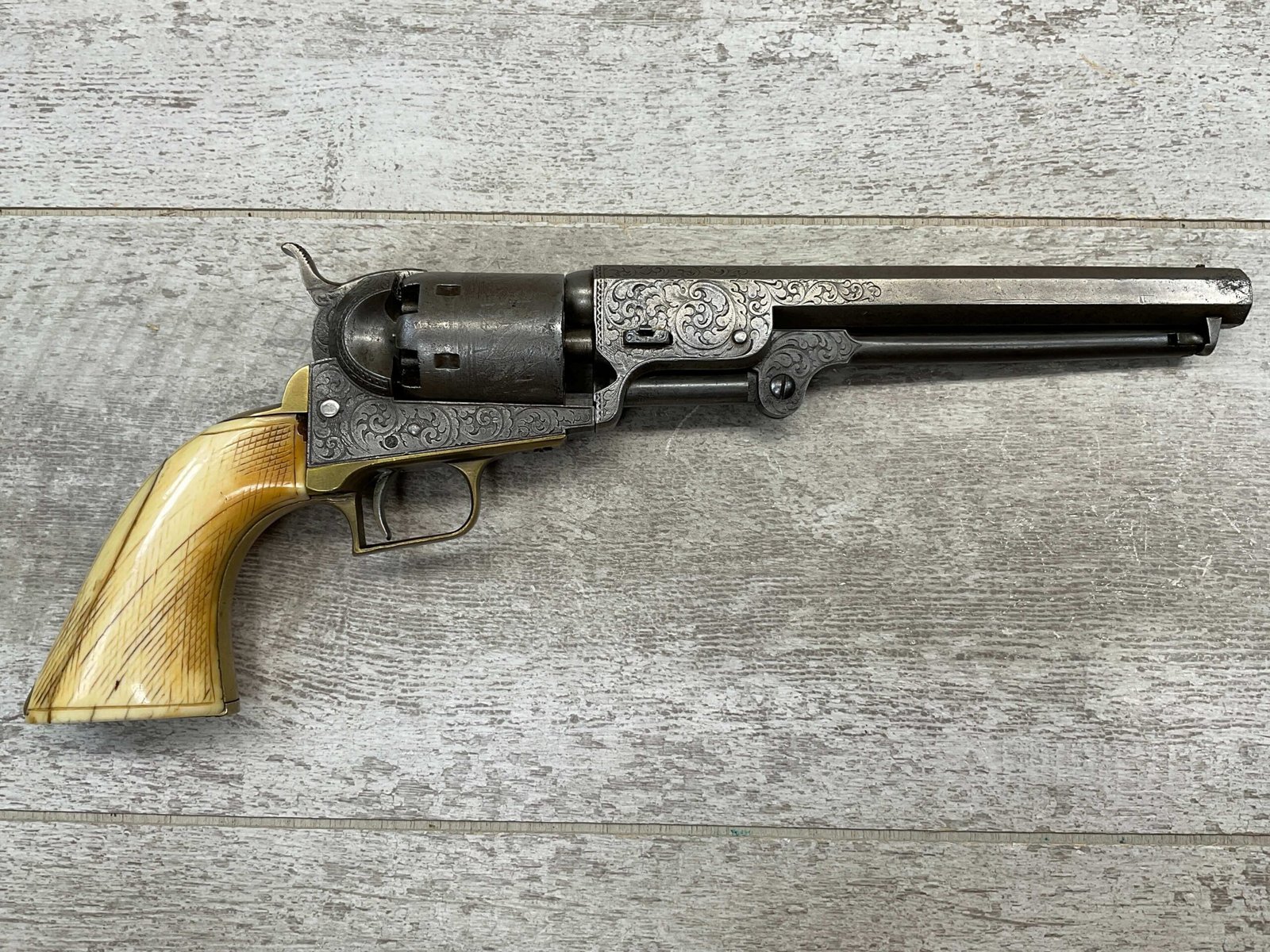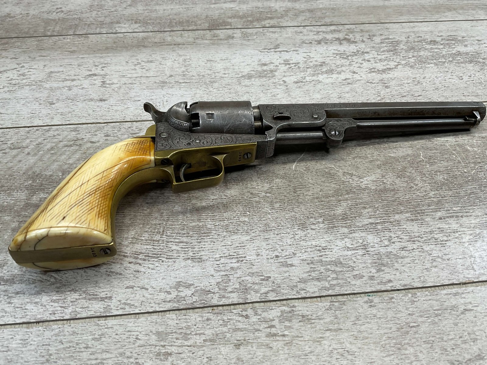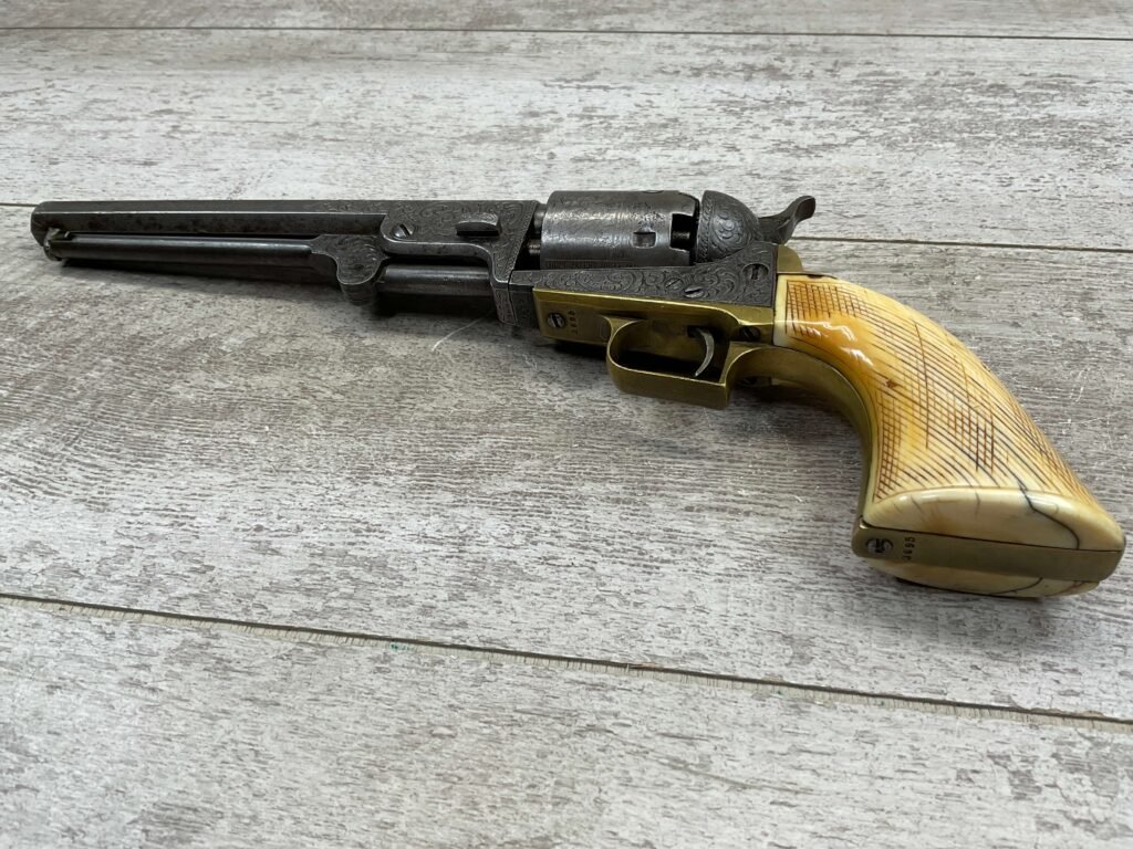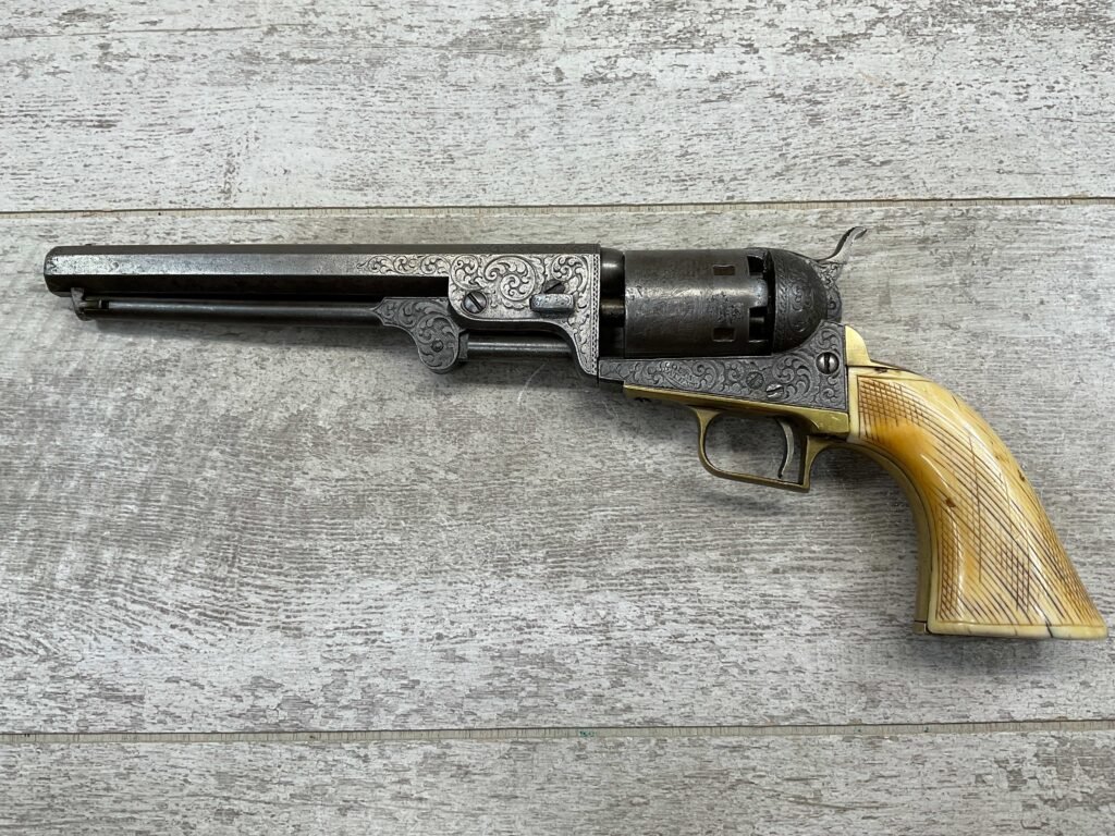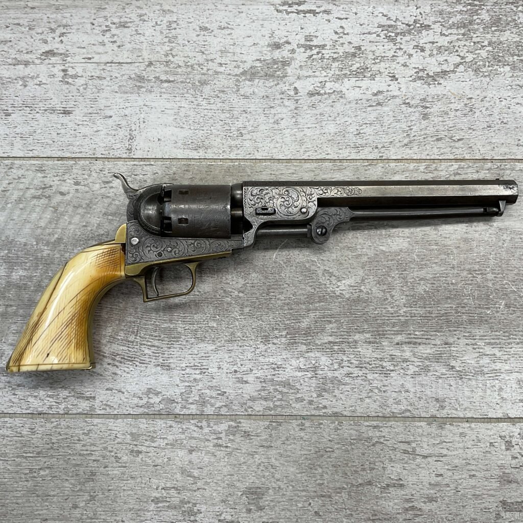 COLT 1851 NAVY .36 CAL ANTIQUE REVOLVER W/ IVORY GRIPS FULLY ENGRAVED, 1851 MFR #3695, .36 CAL, MATCHING W/ 7.5″ OCTAGON BARREL, LIGHT NAVY ENGAGEMENT CYLINDER SCENE VISIBLE, GREY PATINA ON BEAUTIFULLY ENGRAVED RECEIVER / BARREL & HAMMER, BRASS BACKSTRAP & TRIGGER GUARD, GOOD SMOOTH IVORY GRIPS, FULLY FUNCTIONING, NOT A REPRODUCTION, OVERALL CONDITION AS SEEN IN PHOTOS.