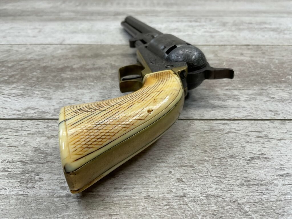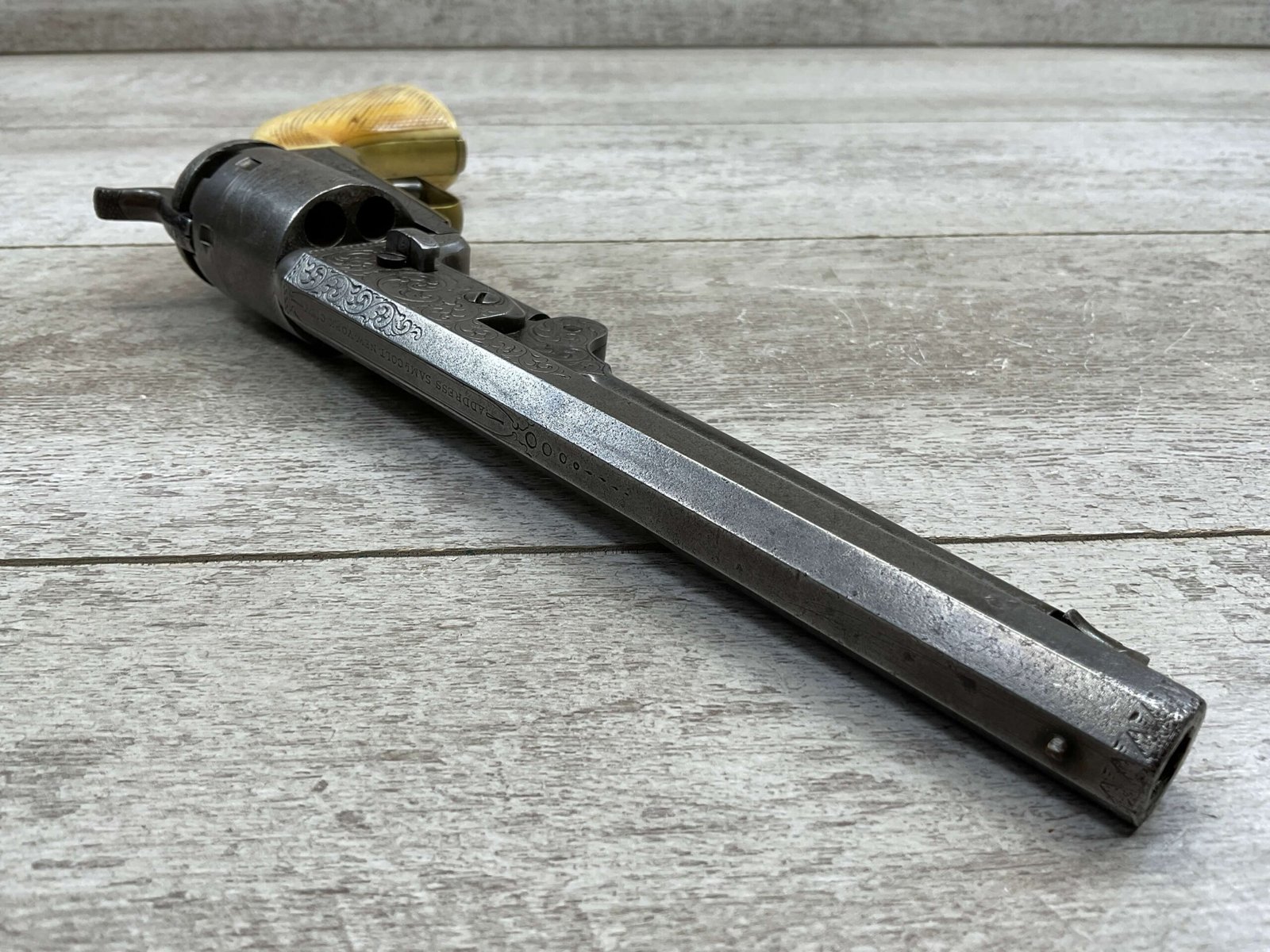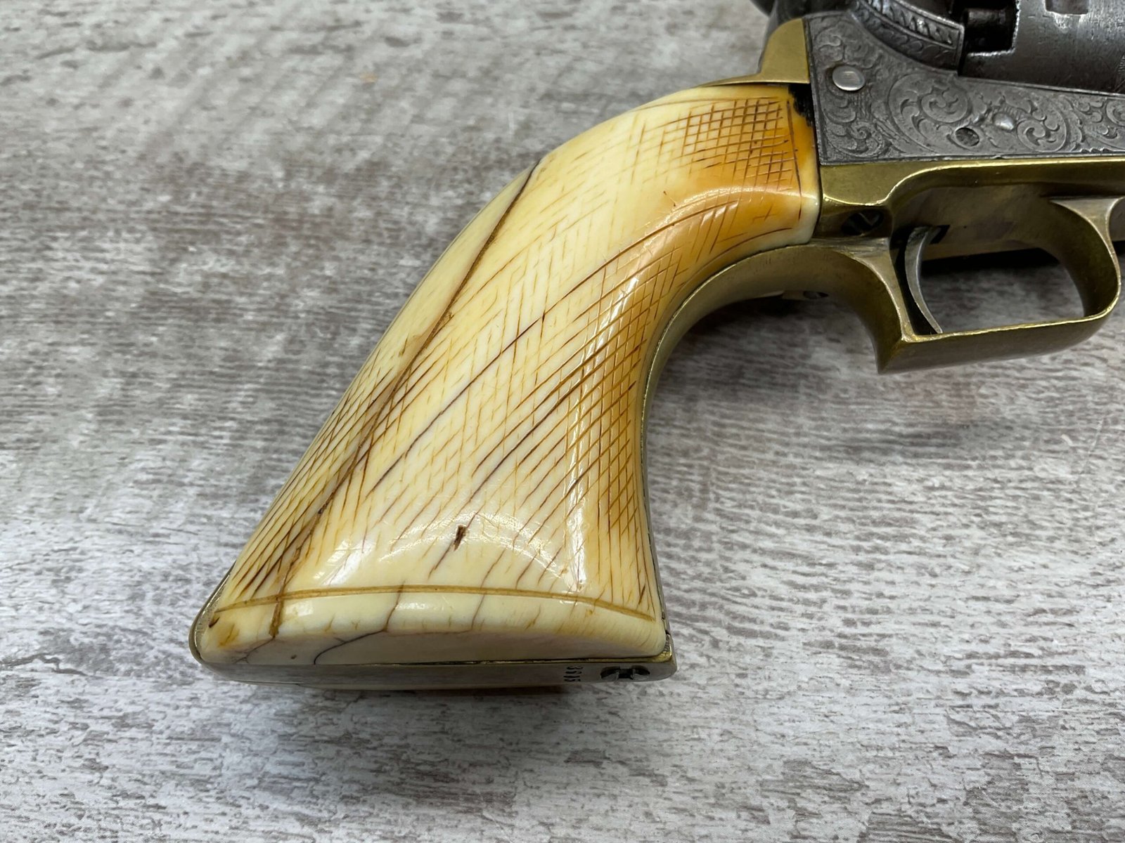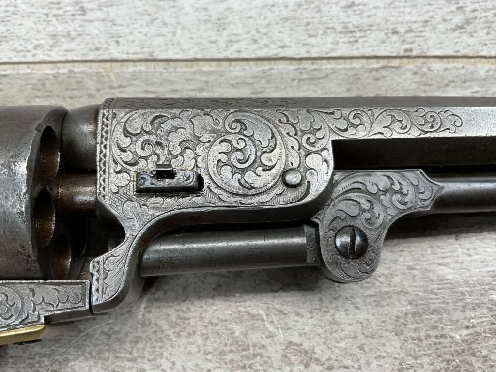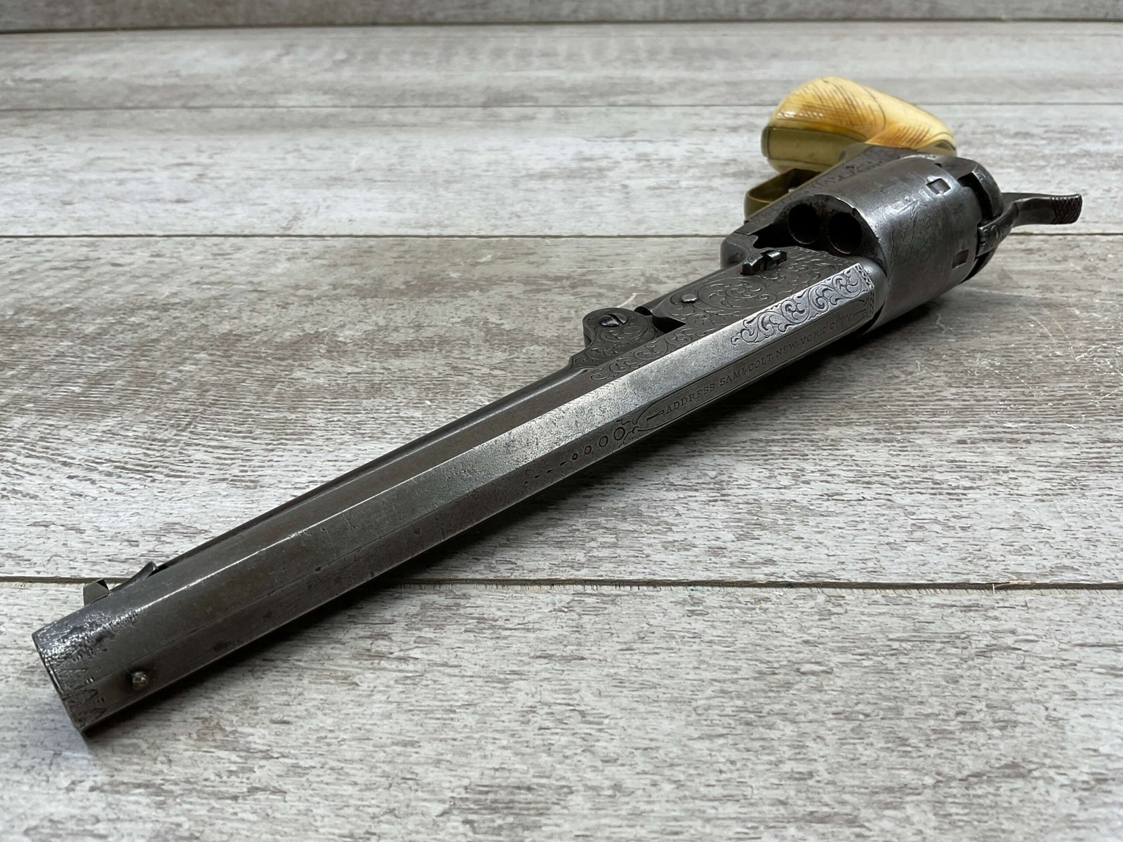 COLT 1851 NAVY .36 CAL ANTIQUE REVOLVER W/ IVORY GRIPS FULLY ENGRAVED, 1851 MFR #3695, .36 CAL, MATCHING W/ 7.5″ OCTAGON BARREL, LIGHT NAVY ENGAGEMENT CYLINDER SCENE VISIBLE, GREY PATINA ON BEAUTIFULLY ENGRAVED RECEIVER / BARREL & HAMMER, BRASS BACKSTRAP & TRIGGER GUARD, GOOD SMOOTH IVORY GRIPS, FULLY FUNCTIONING, NOT A REPRODUCTION, OVERALL CONDITION AS SEEN IN PHOTOS.