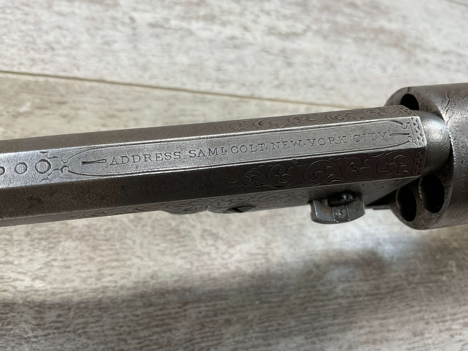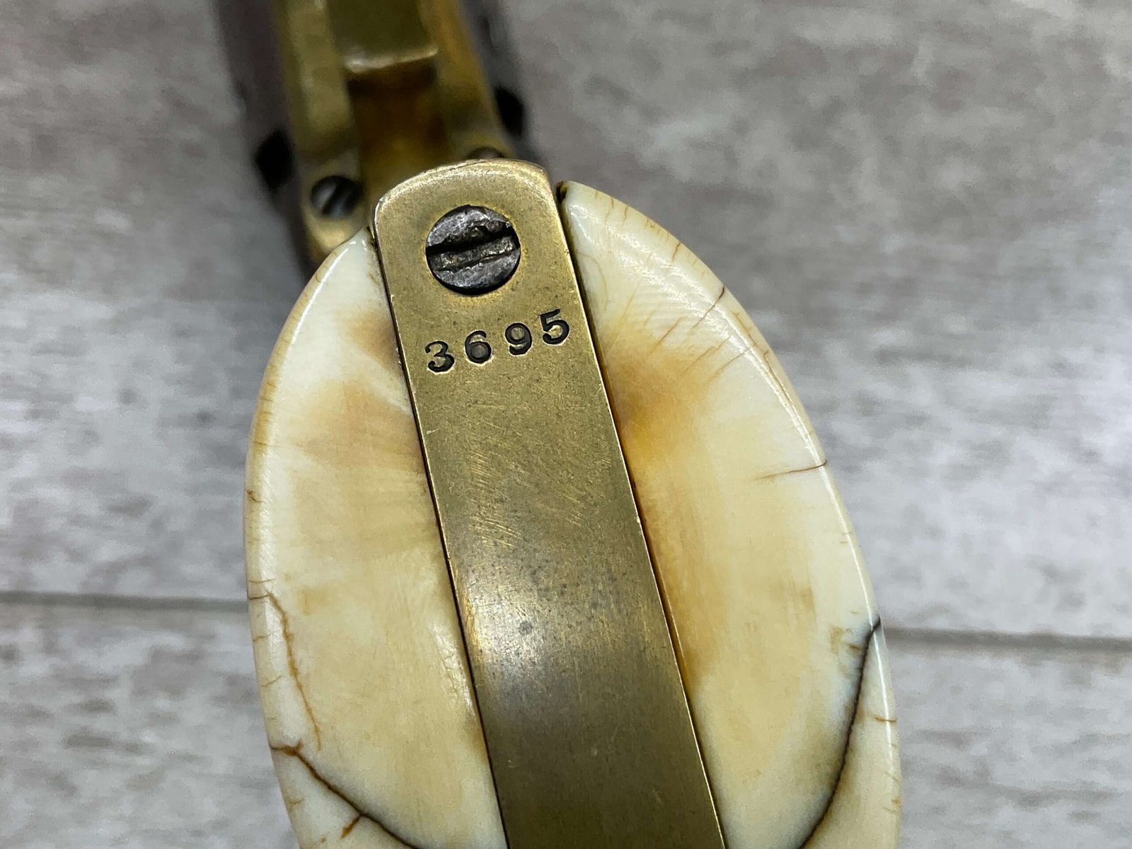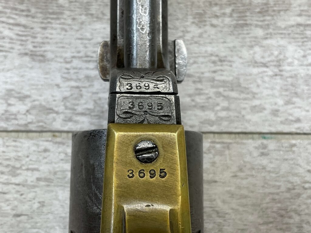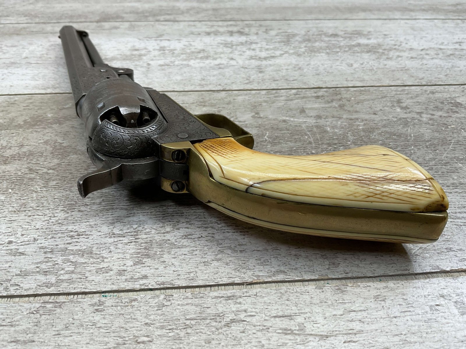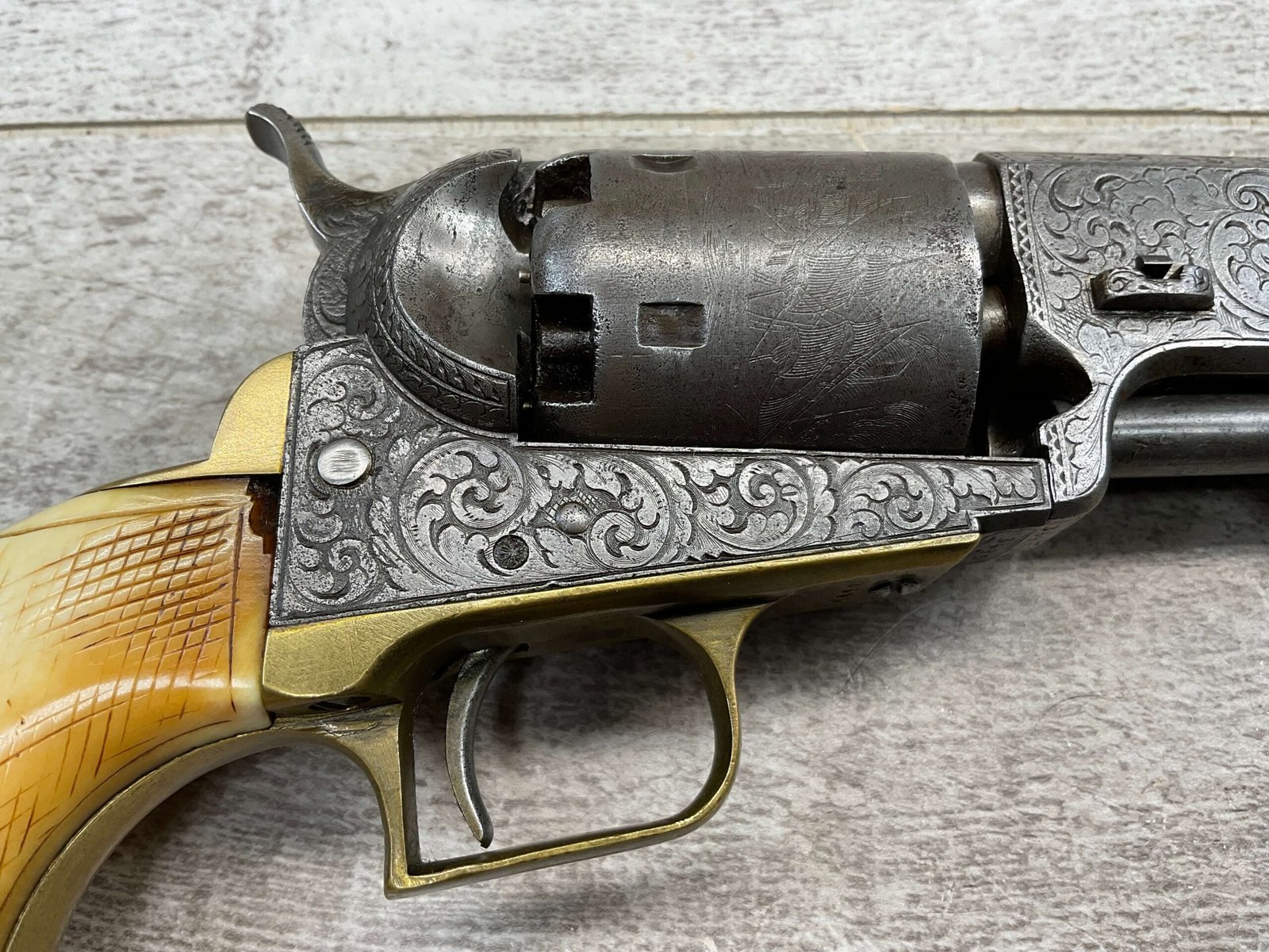 COLT 1851 NAVY .36 CAL ANTIQUE REVOLVER W/ IVORY GRIPS FULLY ENGRAVED, 1851 MFR #3695, .36 CAL, MATCHING W/ 7.5″ OCTAGON BARREL, LIGHT NAVY ENGAGEMENT CYLINDER SCENE VISIBLE, GREY PATINA ON BEAUTIFULLY ENGRAVED RECEIVER / BARREL & HAMMER, BRASS BACKSTRAP & TRIGGER GUARD, GOOD SMOOTH IVORY GRIPS, FULLY FUNCTIONING, NOT A REPRODUCTION, OVERALL CONDITION AS SEEN IN PHOTOS.