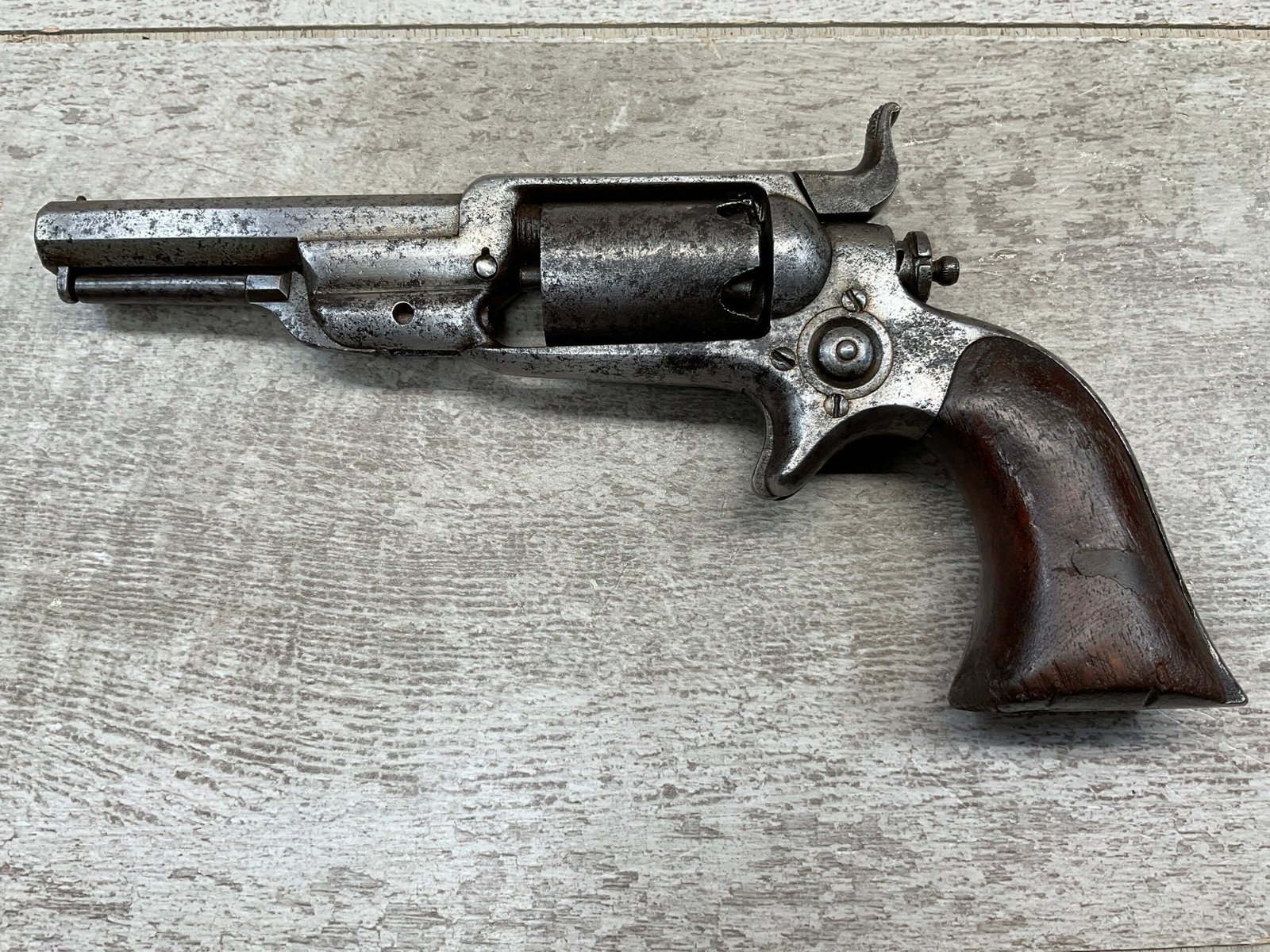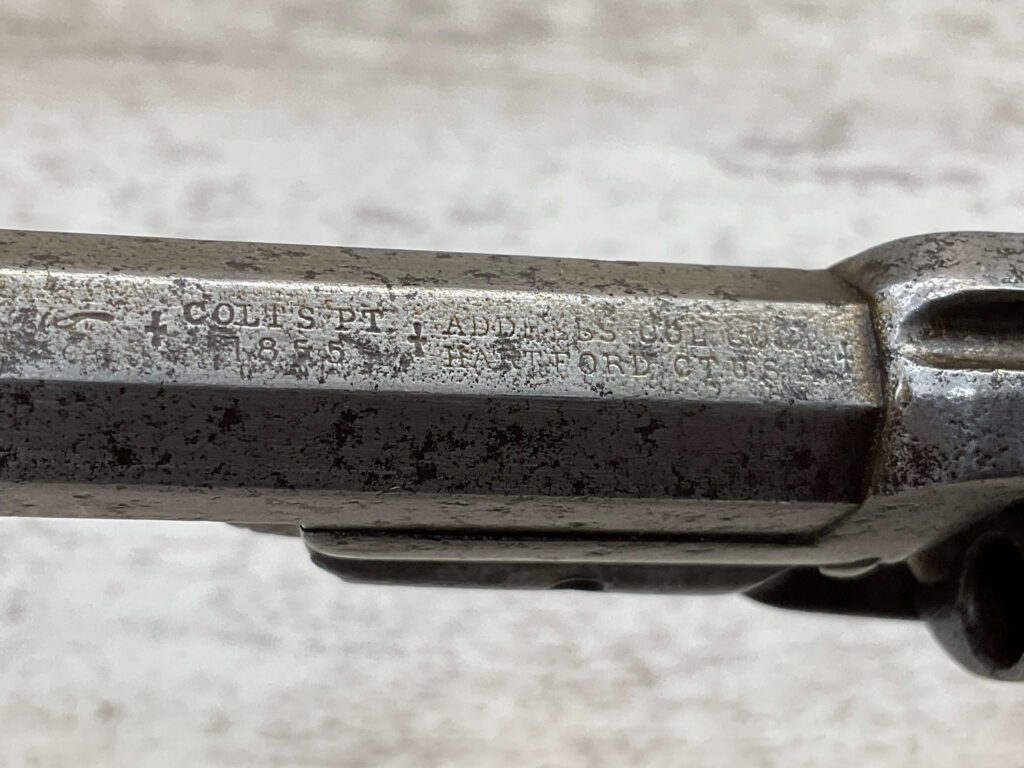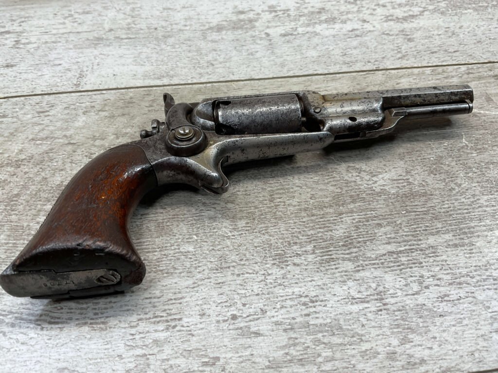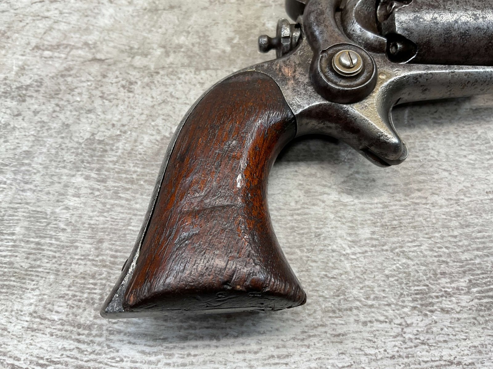 The Colt Model 1855 side-hammer, also known as the Colt Root Revolver—named after Elisha K. Root, who was Colt’s factory foreman and general superintendent—was Colt’s only percussion handgun built on the solid frame principle and featured a side-hammer, mounted on the right side of the frame, a spur trigger, a cylinder pin entering from the rear, and one-piece grips secured to the back-strap. The Root was manufactured between 1855 to 1870