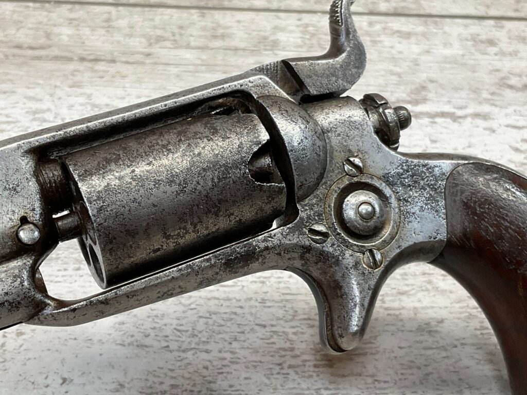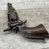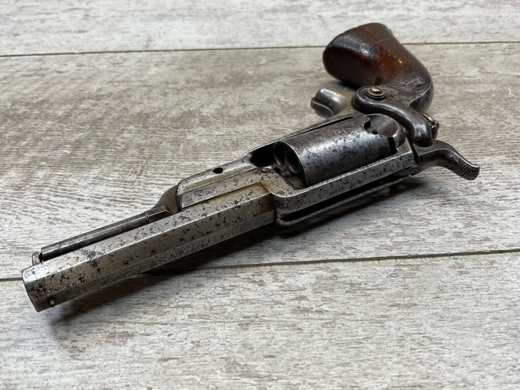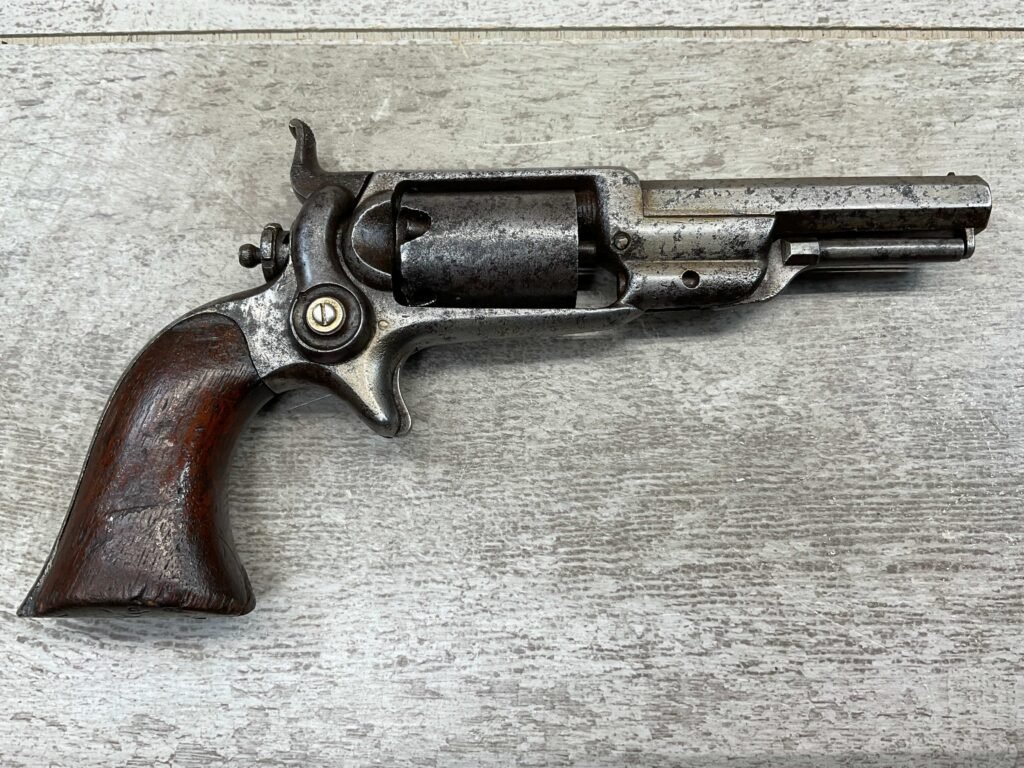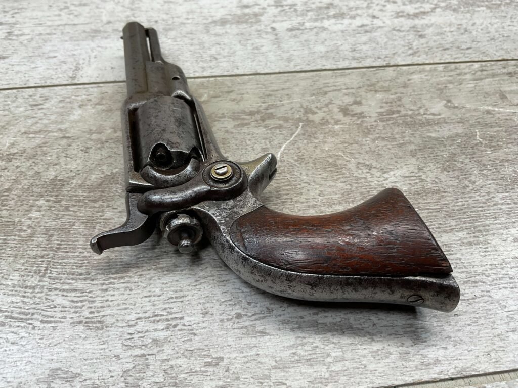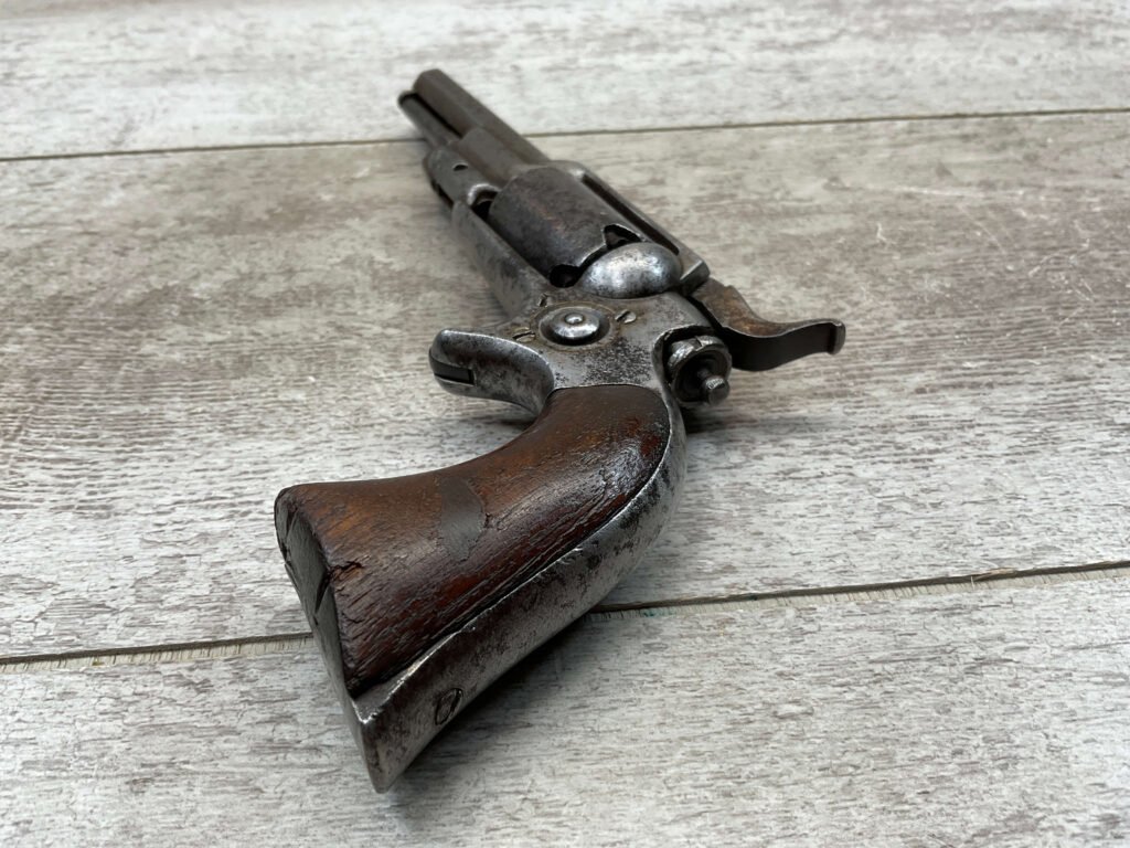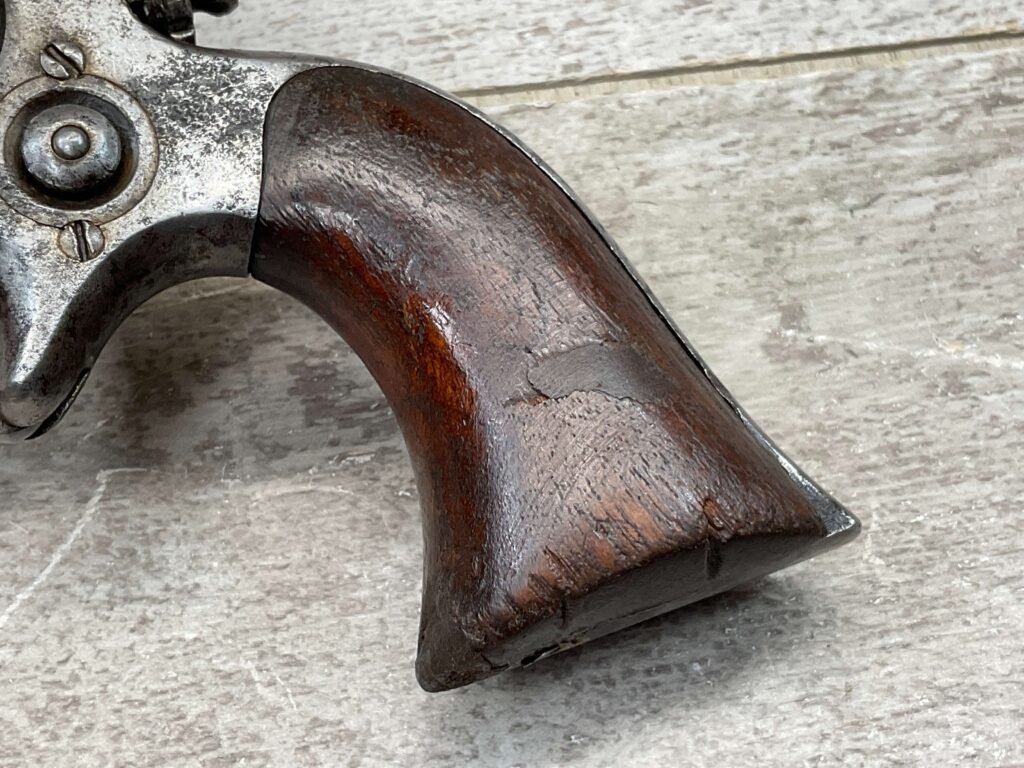 The Colt Model 1855 side-hammer, also known as the Colt Root Revolver—named after Elisha K. Root, who was Colt’s factory foreman and general superintendent—was Colt’s only percussion handgun built on the solid frame principle and featured a side-hammer, mounted on the right side of the frame, a spur trigger, a cylinder pin entering from the rear, and one-piece grips secured to the back-strap. The Root was manufactured between 1855 to 1870