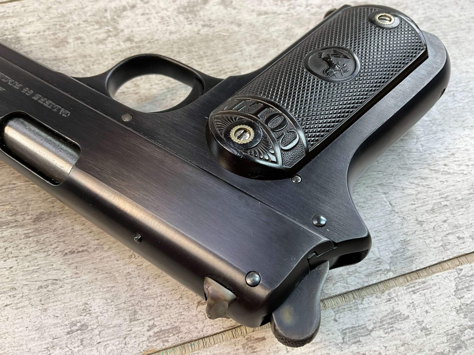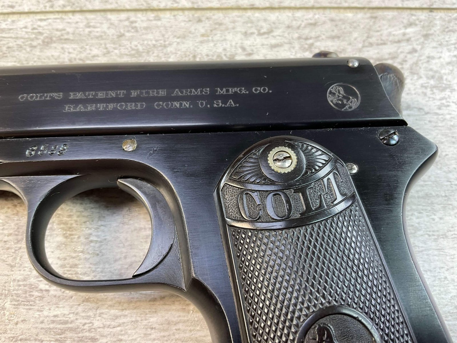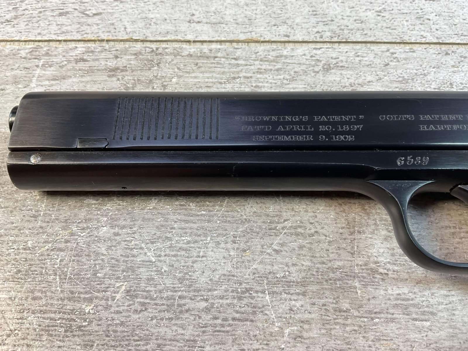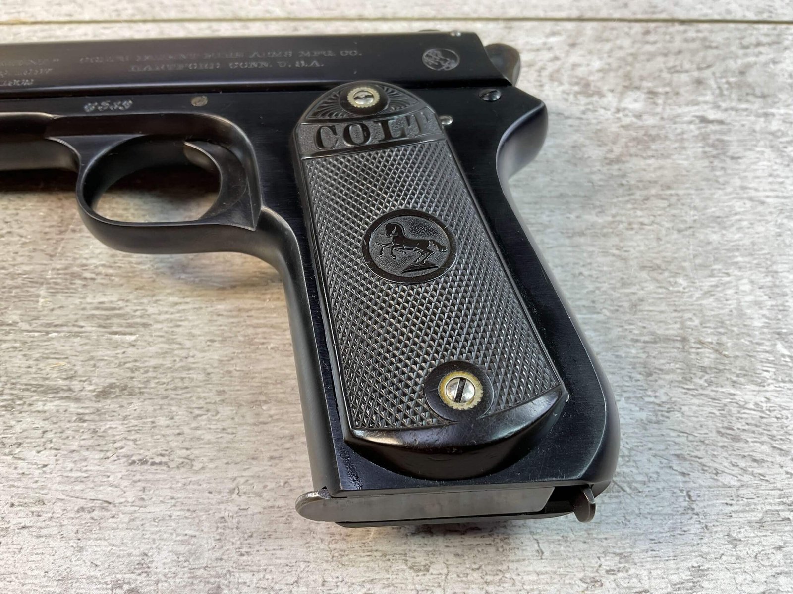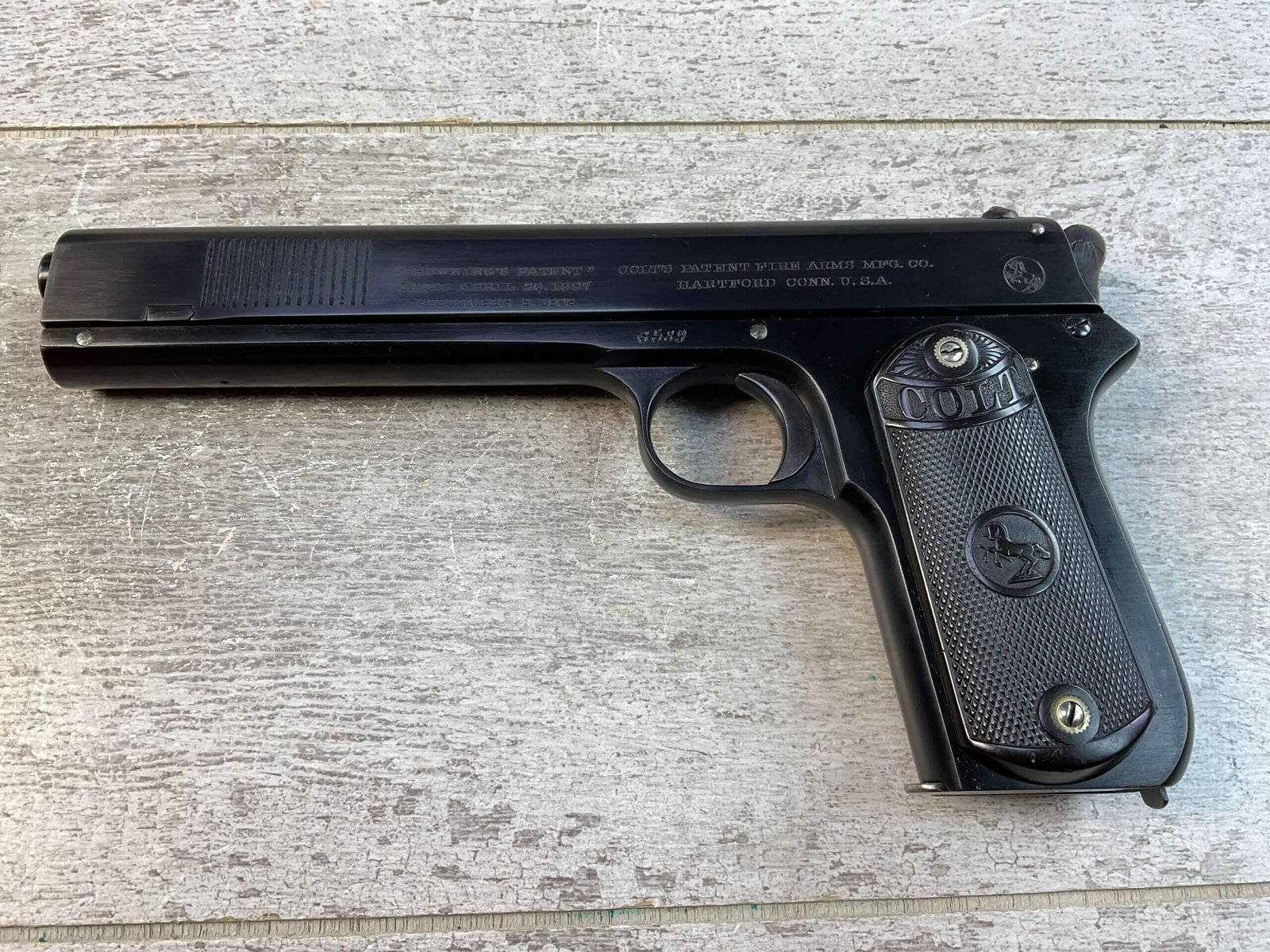 COLT 1902 .38 RIMLESS SEMI AUTO PISTOL, JAMES EARL JONES “FAVORITES” COLLECTION #6589, 6″ BARREL, EXC BORE & RIFLING, EXC RESTORED BLUE FINISH, FIXED SIGHTS, ORIGINAL BLACK CHECKERED PLASTIC GRIPS, NO SAFETY, ROUND HAMMER, 1903 MFR, PROFESSIONALLY RESTORED, CONDITION AS SHOWN IN PICTURES, FROM THE JAMES EARL JONES “FAVORITES” COLLECTION W/ CERTIFICATE OF AUTHENTICITY.