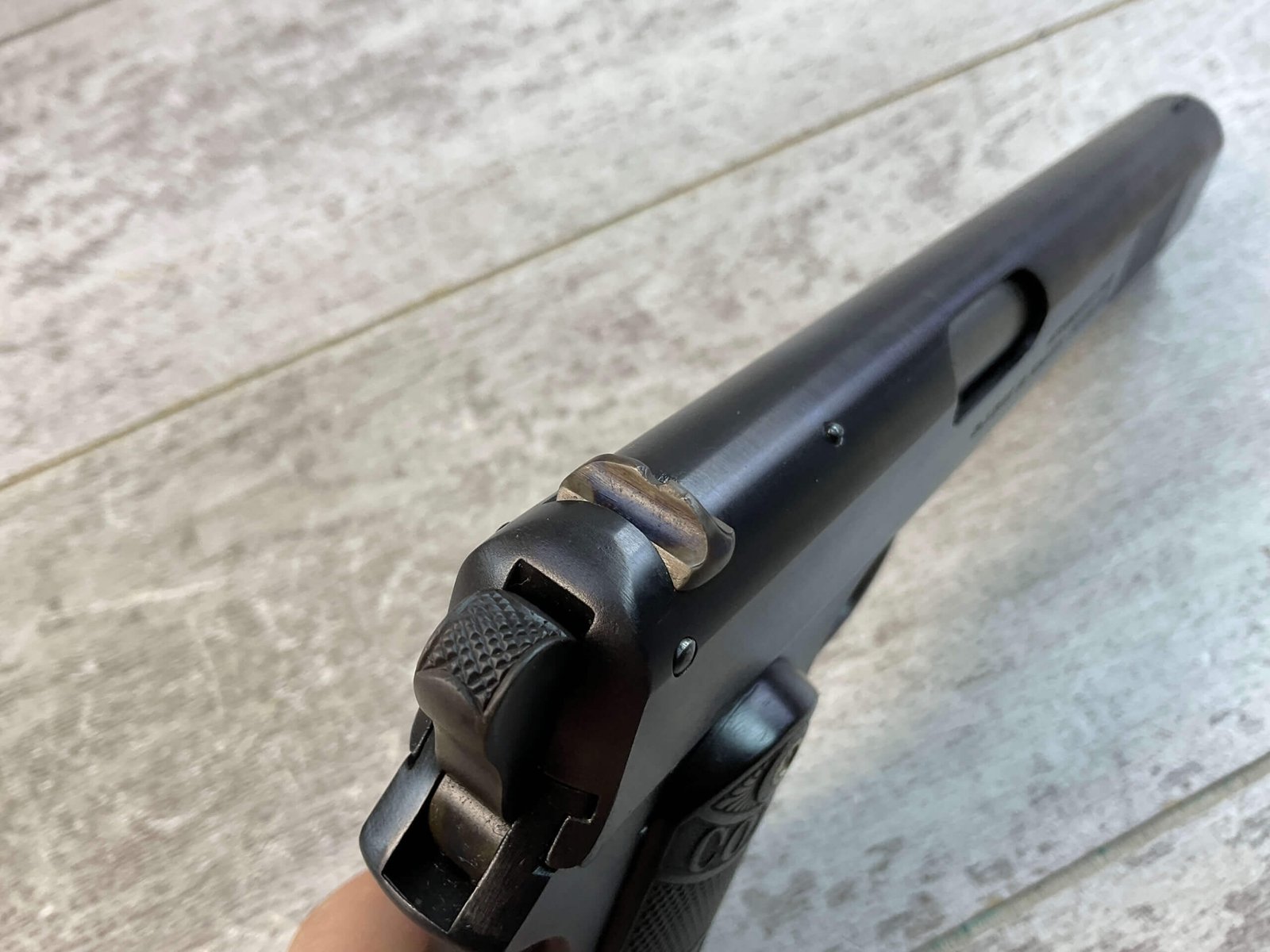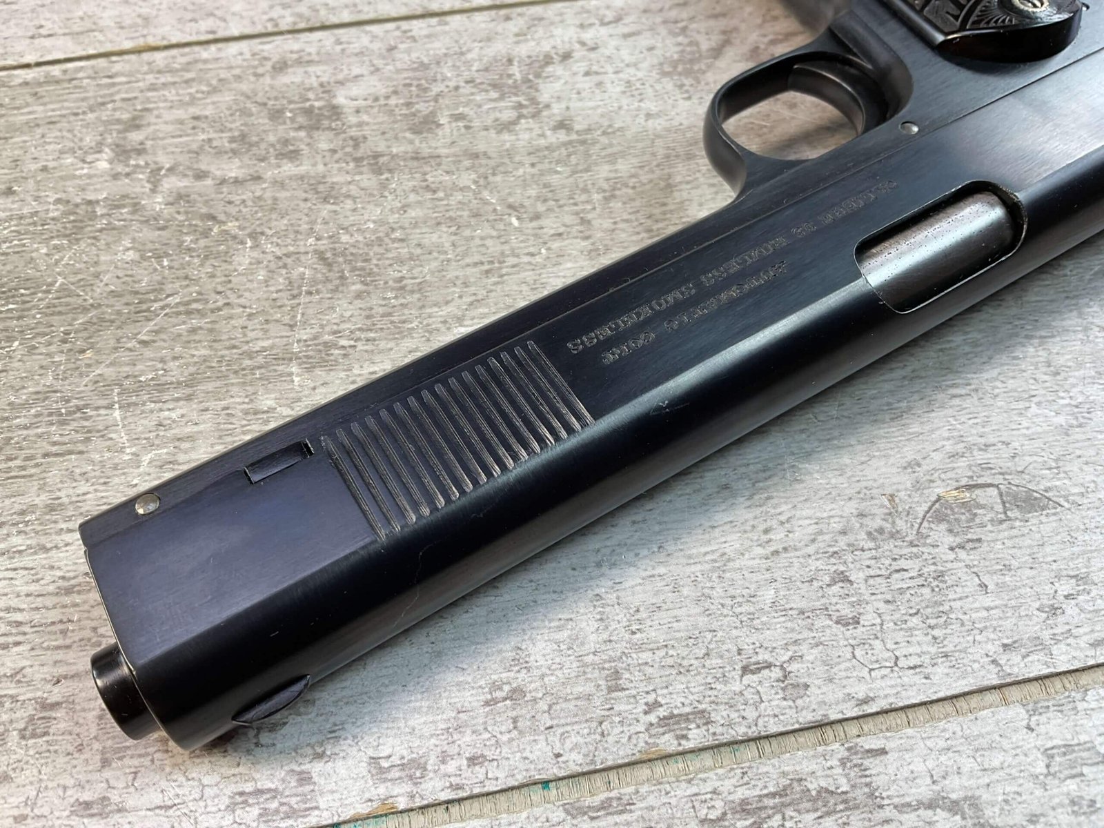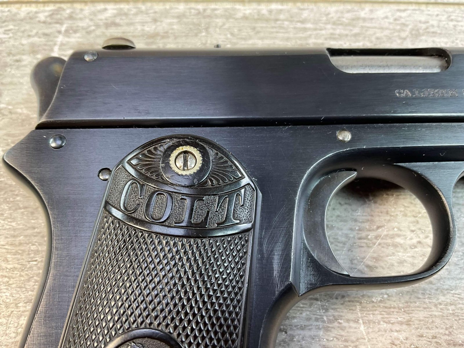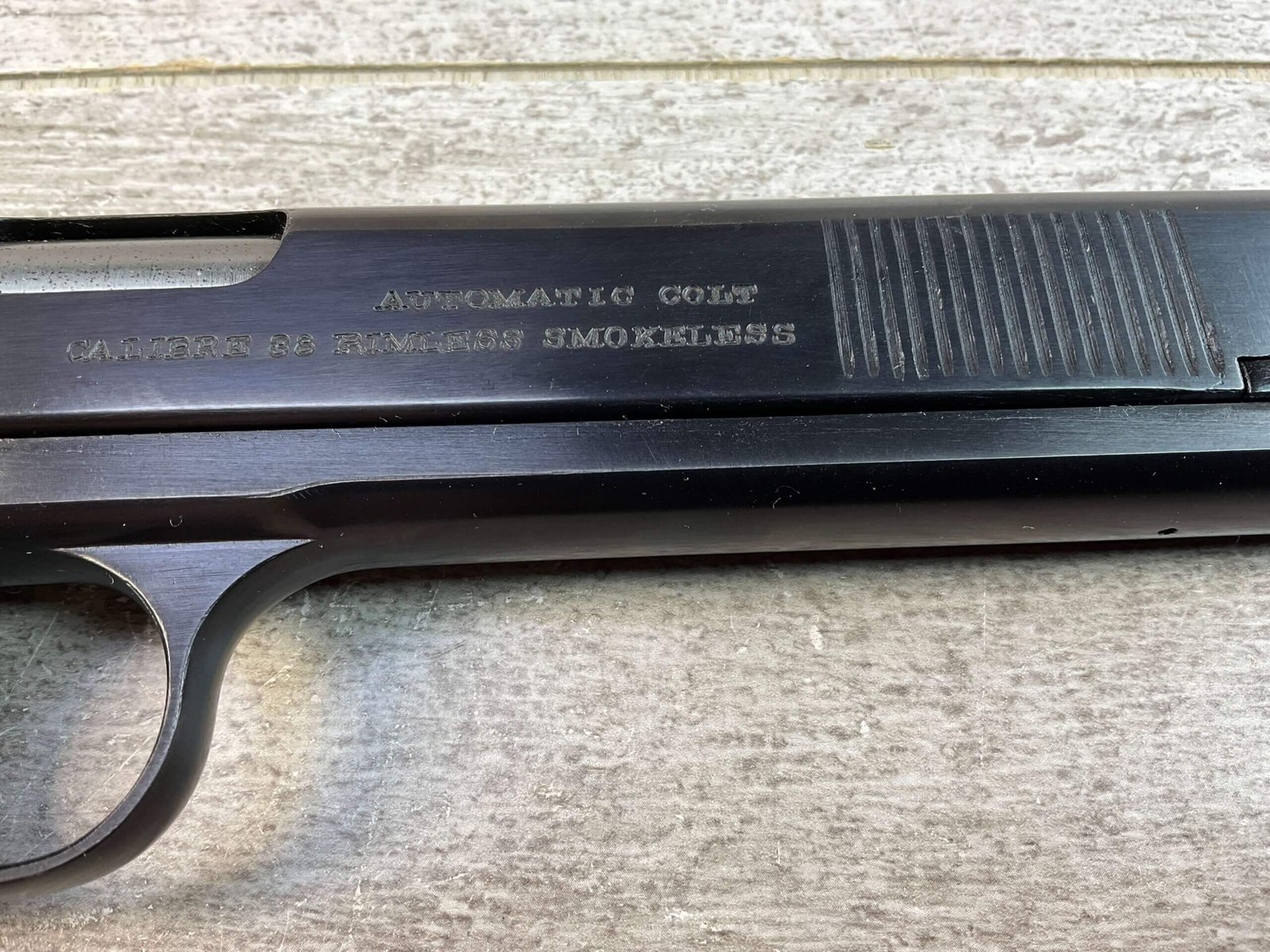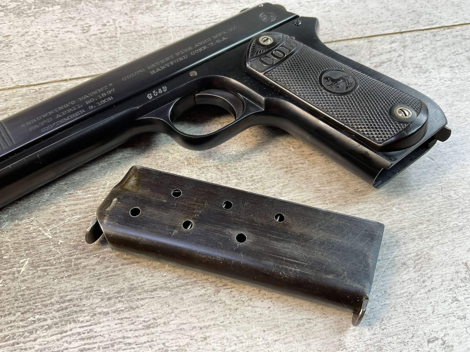 COLT 1902 .38 RIMLESS SEMI AUTO PISTOL, JAMES EARL JONES “FAVORITES” COLLECTION #6589, 6″ BARREL, EXC BORE & RIFLING, EXC RESTORED BLUE FINISH, FIXED SIGHTS, ORIGINAL BLACK CHECKERED PLASTIC GRIPS, NO SAFETY, ROUND HAMMER, 1903 MFR, PROFESSIONALLY RESTORED, CONDITION AS SHOWN IN PICTURES, FROM THE JAMES EARL JONES “FAVORITES” COLLECTION W/ CERTIFICATE OF AUTHENTICITY.