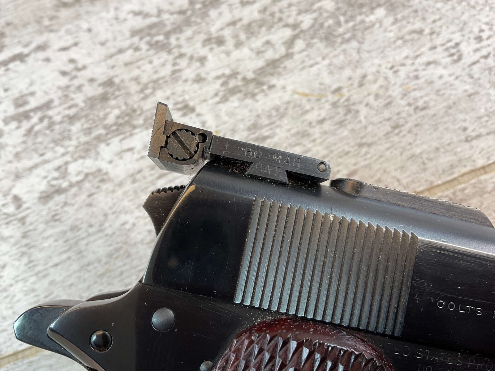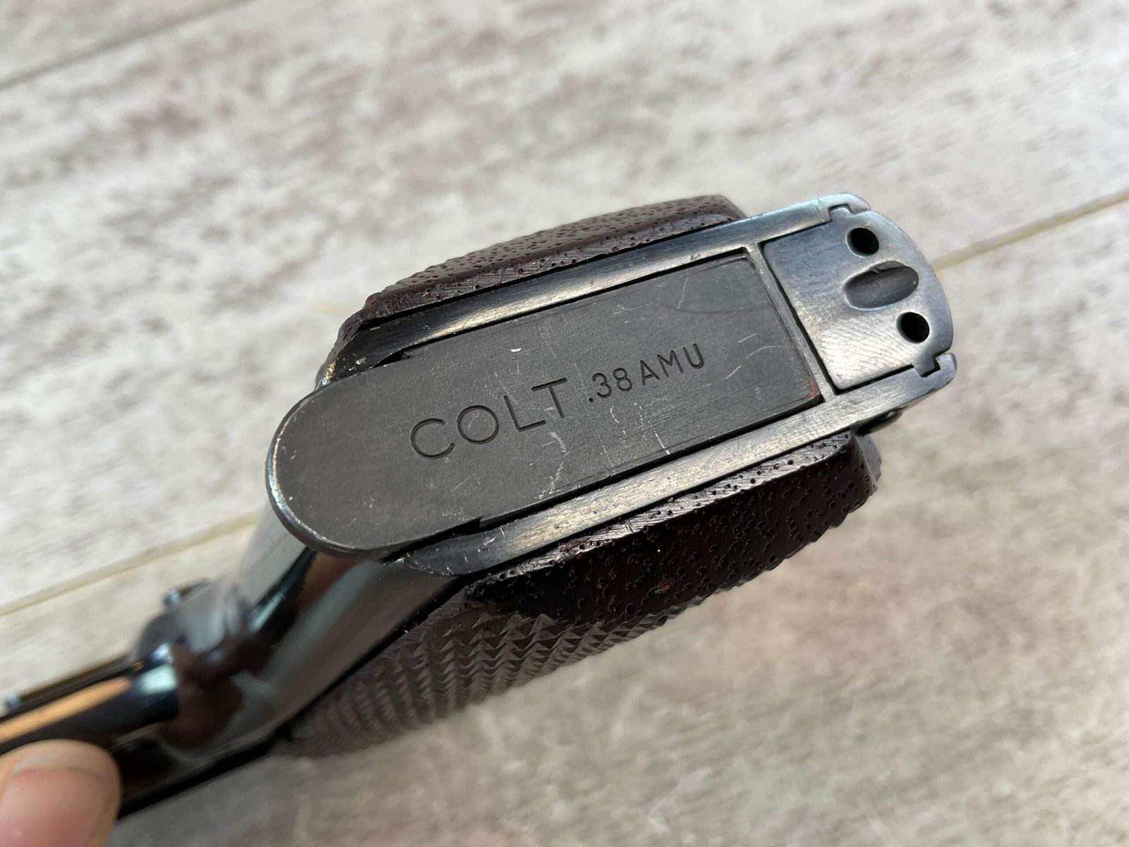 COLT 1911 .38 AMU SEMI AUTO PISTOL, 1918 MFR, JAMES EARL JONES COLLECTION #548427, 5″ BARREL, EXC BORE & RIFLING, .38 AMU CALIBER (AMU STANDS FOR ARMY MARKSMANSHIP UNIT), FRAME MADE IN 1918, EXC WALNUT CHECKERED GRIPS, BO MAR ADJ REAR SIGHT, MADE FROM A .38 AMU CONVERSION KIT, EXTENDED FRONT SIGHT, 1 – COLT 38 AMU MARKED MAGAZINE, CONDITION AS SHOWN IN PICTURES (REFURB BLUE), VERY NICE!! FROM THE JAMES EARL JONES “FAVORITES” COLLECTION W/ CERTIFICATE OF AUTHENTICITY.