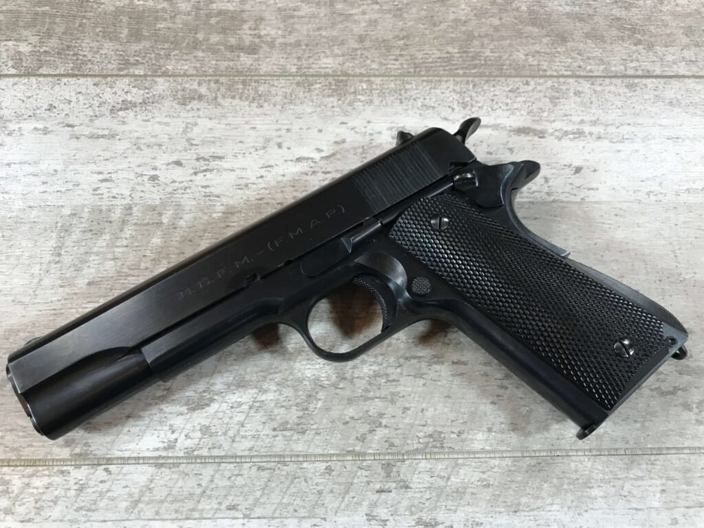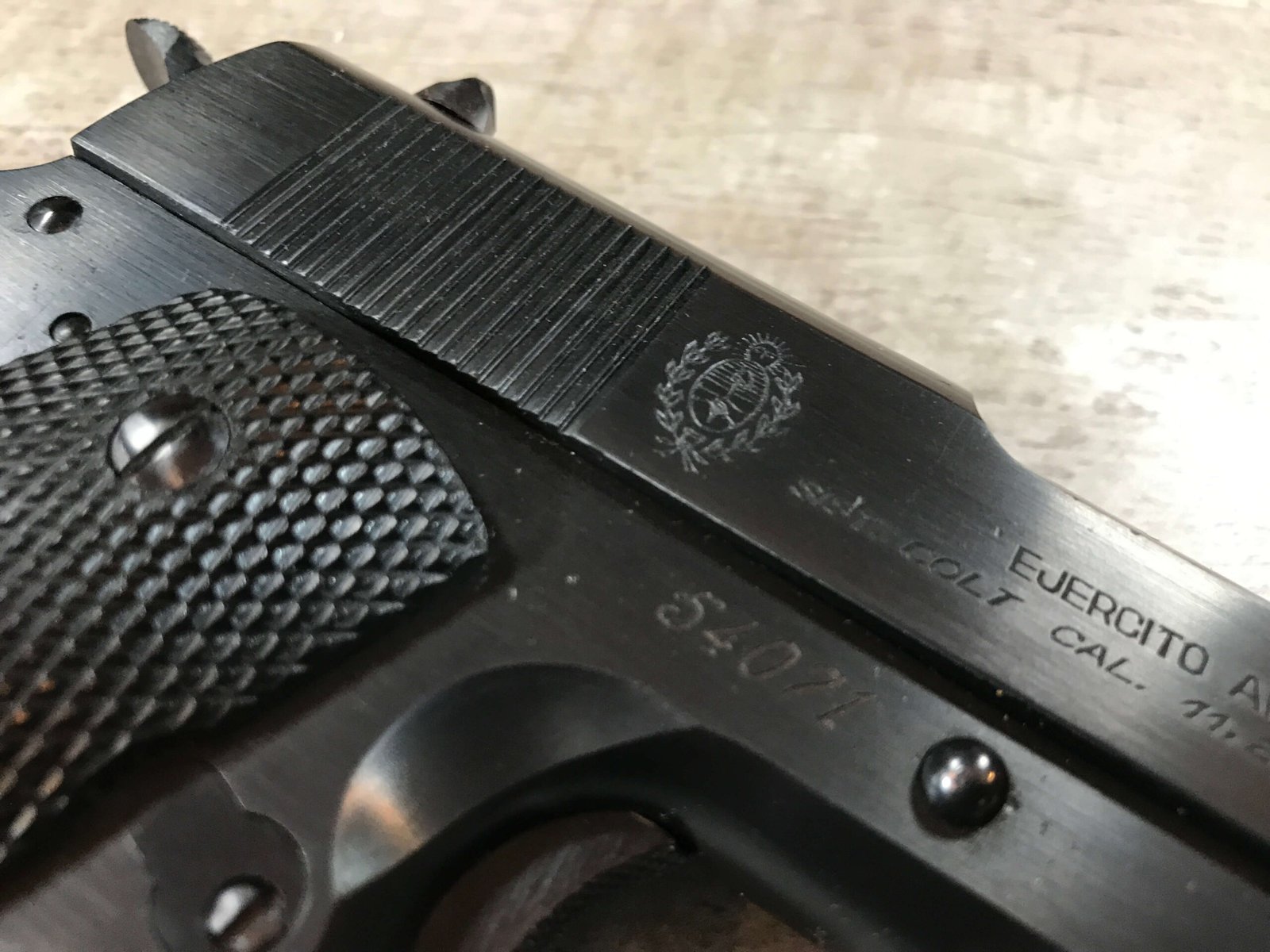From Blue Book of Gun Values: in 1927, the Argentina Arsenal “DGFM-FMAP” began manufacturing the Model 1911A1. The slide marking is two lines and reads “EJERCITO ARGENTINO SIST.COLT.CAL. 11.25mm MOD.1927”, these guns were made in Argentina under license from Colt, with Colt machinery, and with help from Colt engineers, and are known as Model 1927 Systema Colt.
