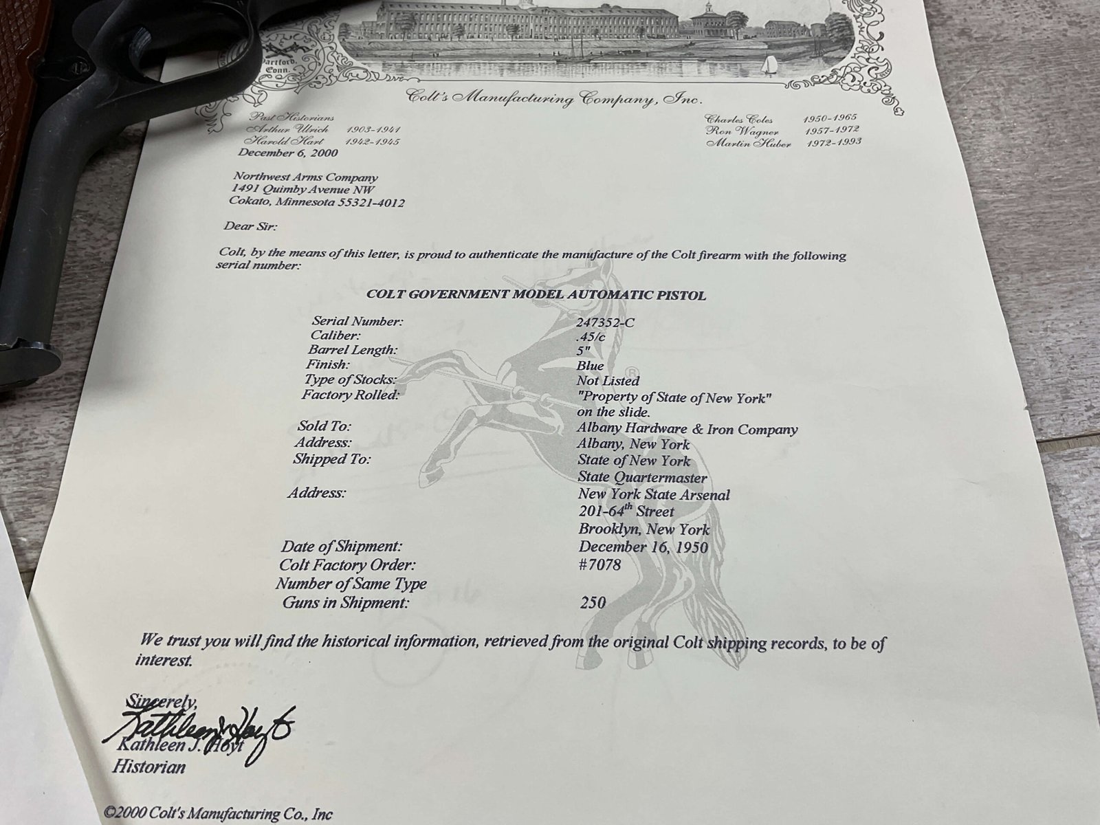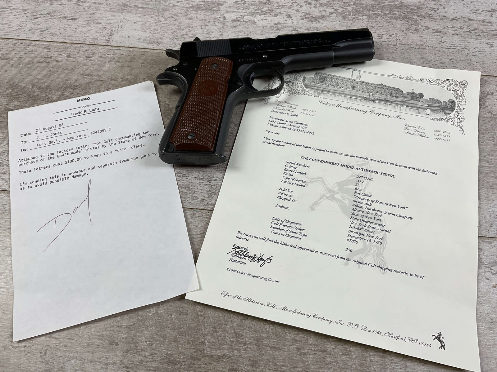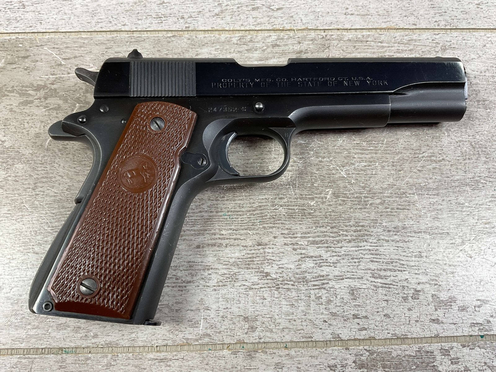COLT 1911A1 GOVT MOD – NEW YORK 45 ACP SEMI AUTO PISTOL, JAMES EARL JONES COLLECTION #247352-C, EXC BORE & RIFLING, EXC GRIPS, EXC 98% OVERALL CONDITION, 1950 MFR, COLT CERTIFICATE LETTER, ONE OF THE 250 SHIPPED TO THE STATE OF NEW YORK, “PROPERTY OF THE STATE OF NEW YORK” MARKED SLIDE, 98% OVERALL, CONDITION AS SHOWN IN PICTURES, FROM THE JAMES EARL JONES “FAVORITES” COLLECTION W/ CERTIFICATE OF AUTHENTICITY.