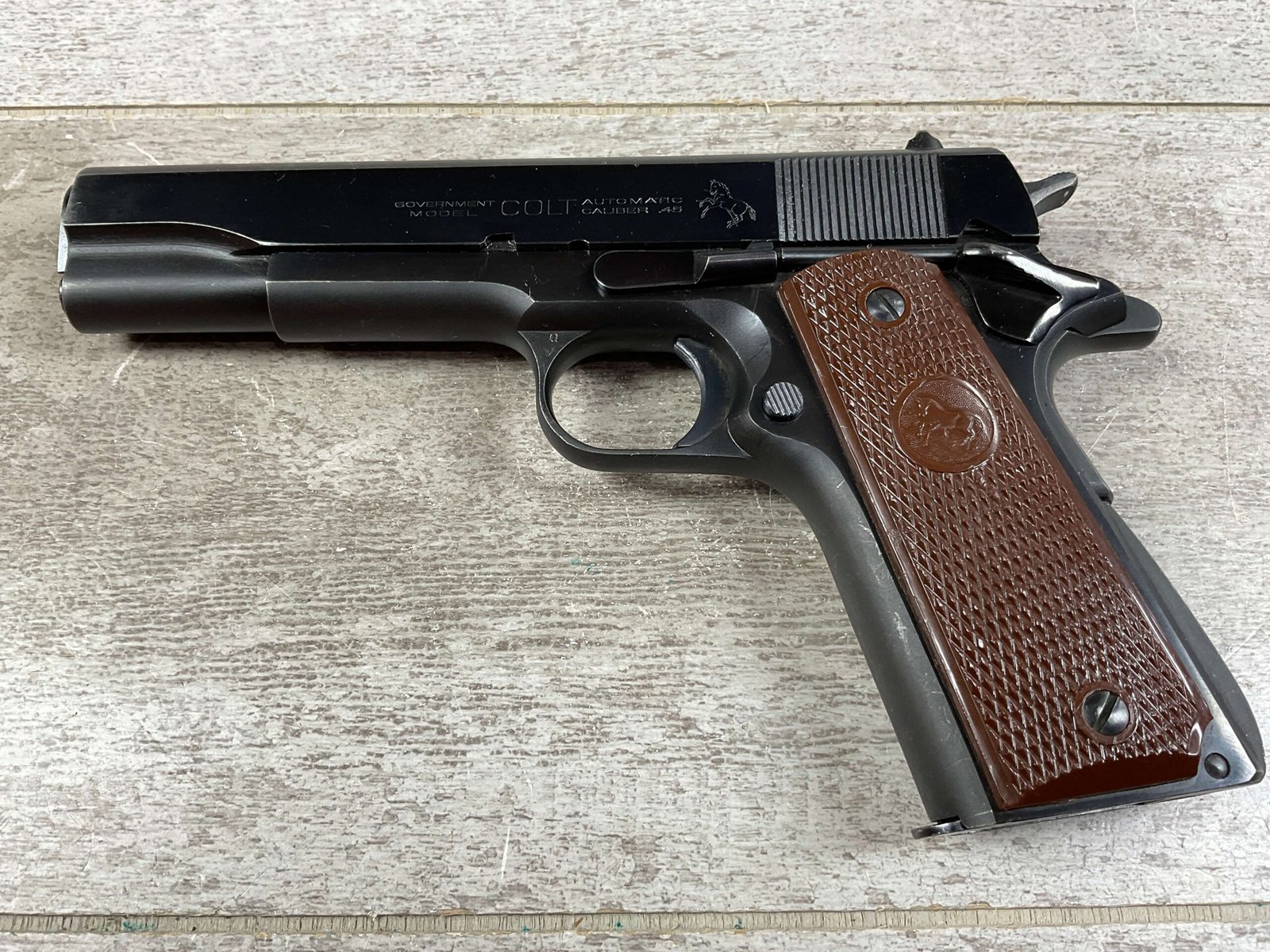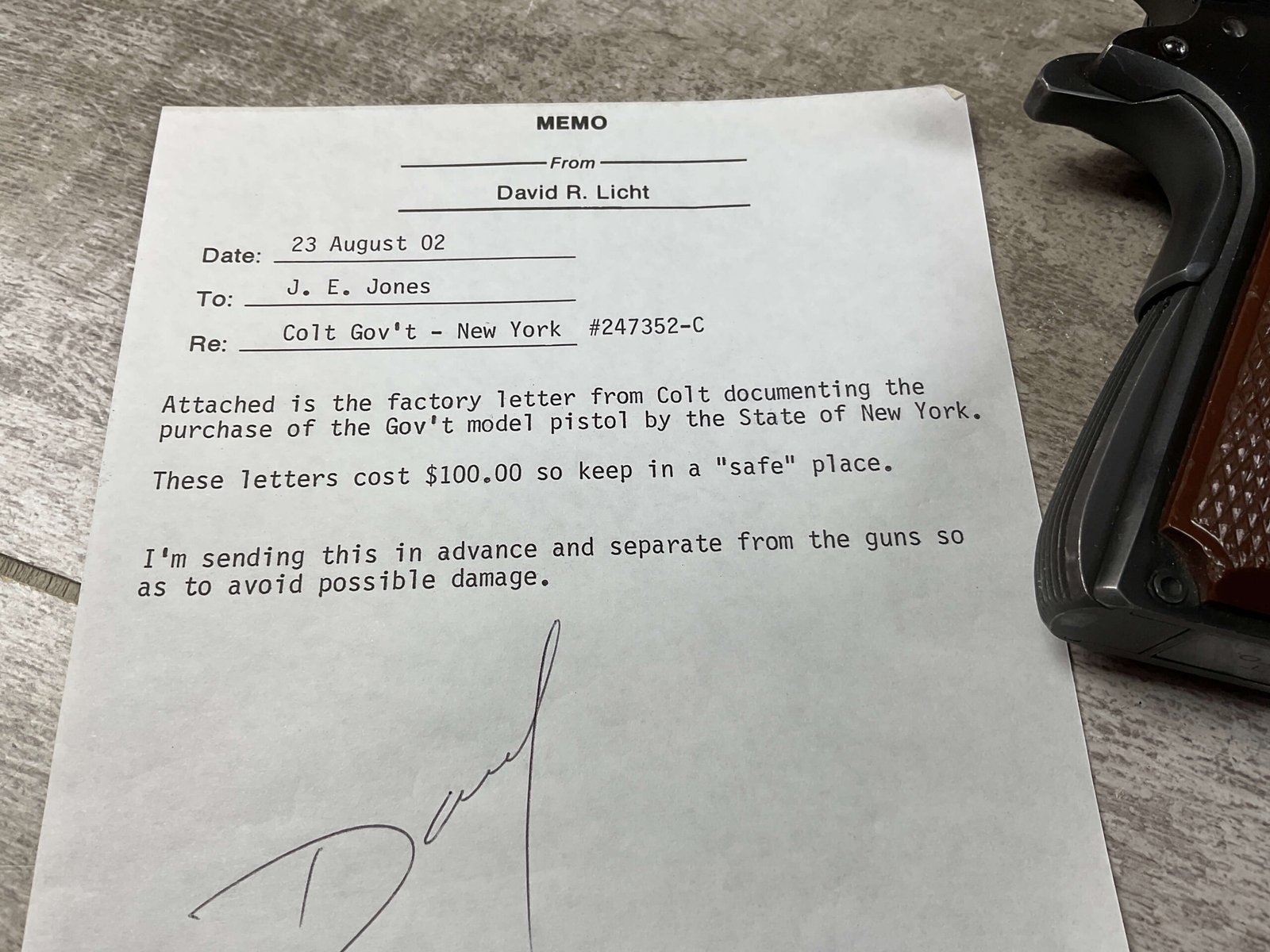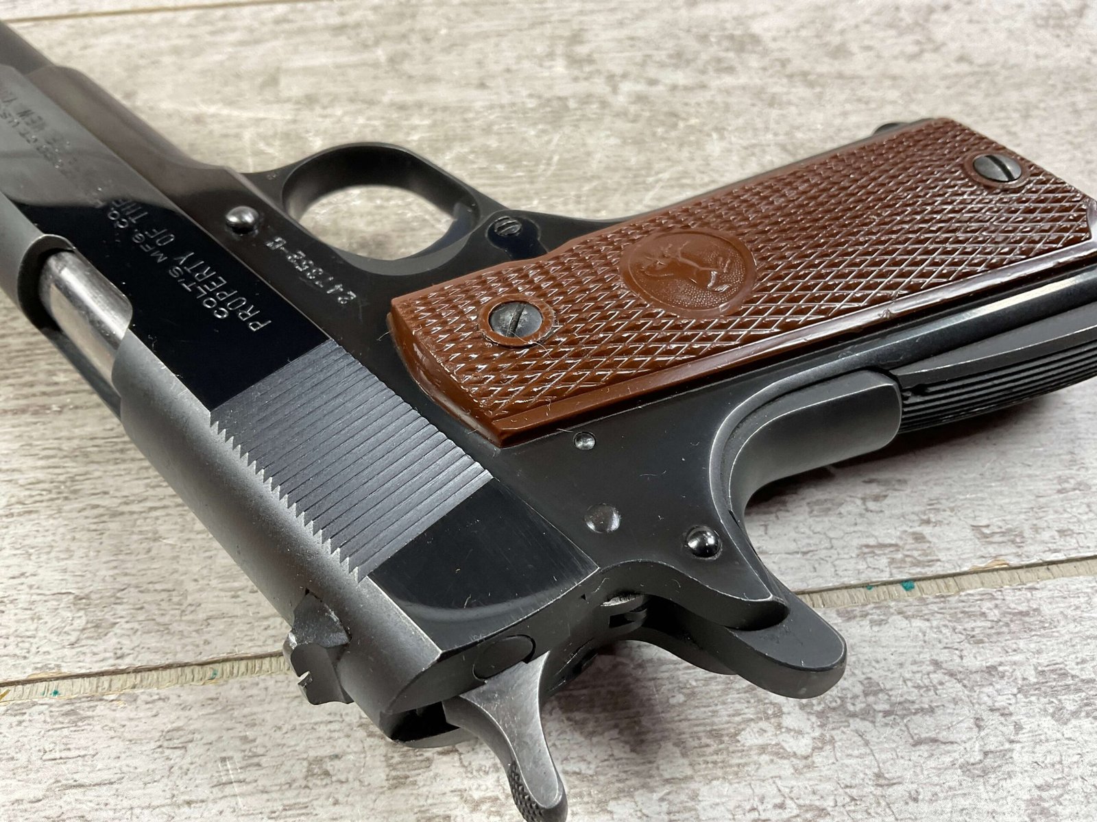 COLT 1911A1 GOVT MOD – NEW YORK 45 ACP SEMI AUTO PISTOL, JAMES EARL JONES COLLECTION #247352-C, EXC BORE & RIFLING, EXC GRIPS, EXC 98% OVERALL CONDITION, 1950 MFR, COLT CERTIFICATE LETTER, ONE OF THE 250 SHIPPED TO THE STATE OF NEW YORK, “PROPERTY OF THE STATE OF NEW YORK” MARKED SLIDE, 98% OVERALL, CONDITION AS SHOWN IN PICTURES, FROM THE JAMES EARL JONES “FAVORITES” COLLECTION W/ CERTIFICATE OF AUTHENTICITY.