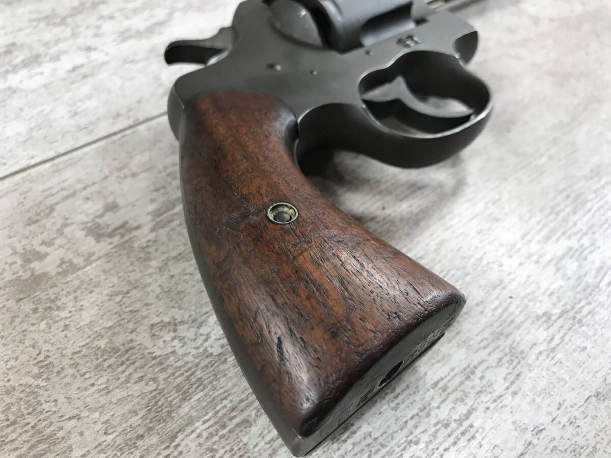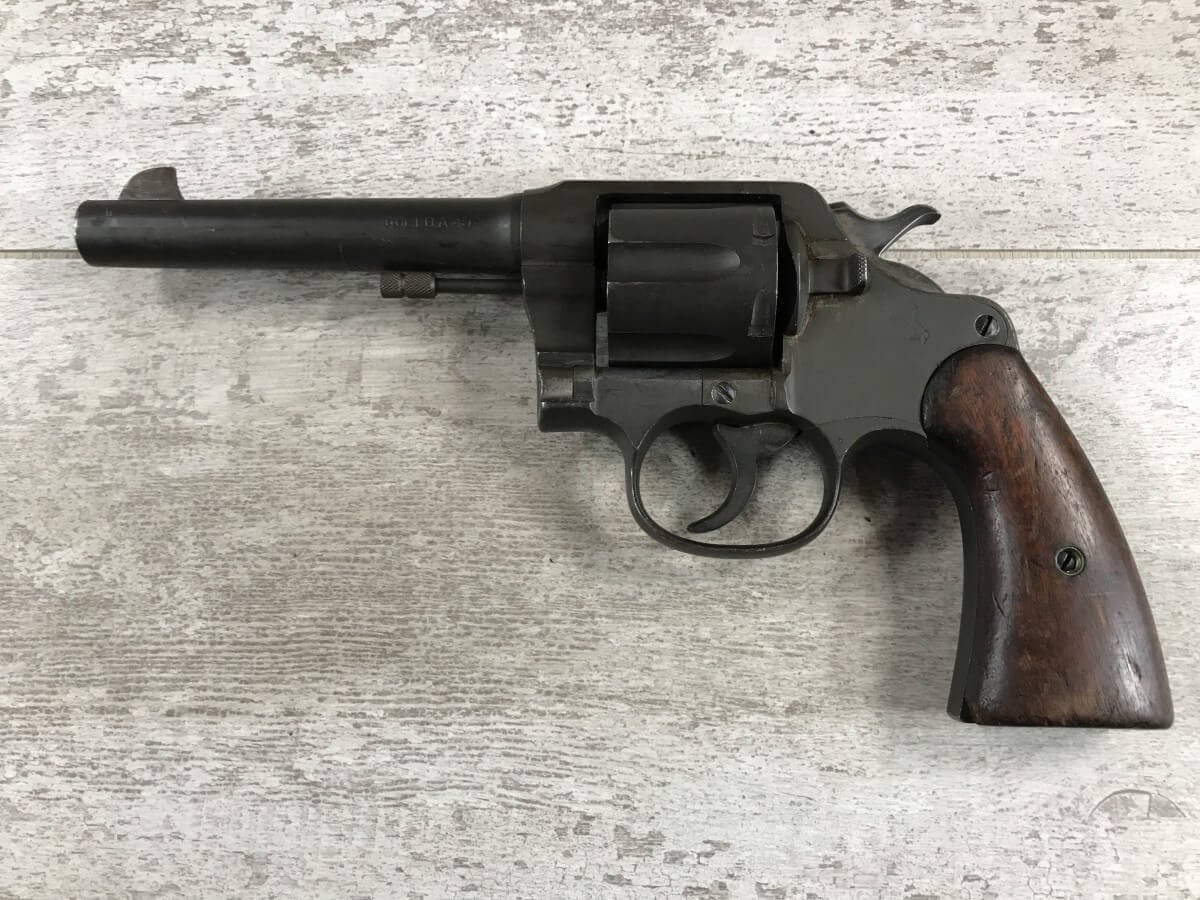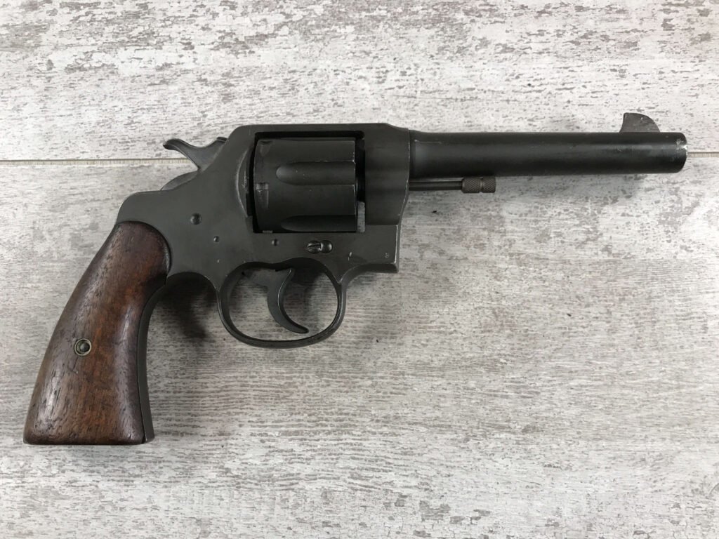 COLT 1917 DA .45 ACP REVOLVER WWII REWORK SCARCE #146853, 1918 MFR, 5 1/2″ BARREL STAMPED “UNITED STATES PROPERTY”, REFINISHED, BUTT ENGRAVED WITH “U.S./ARMY/MODEL/1917” & “No /146/853”, MISSING LANYARD LOOP ON BUTT, EXC WOODEN GRIPS, BRIGHT W/SOME FROST BORE, 90%