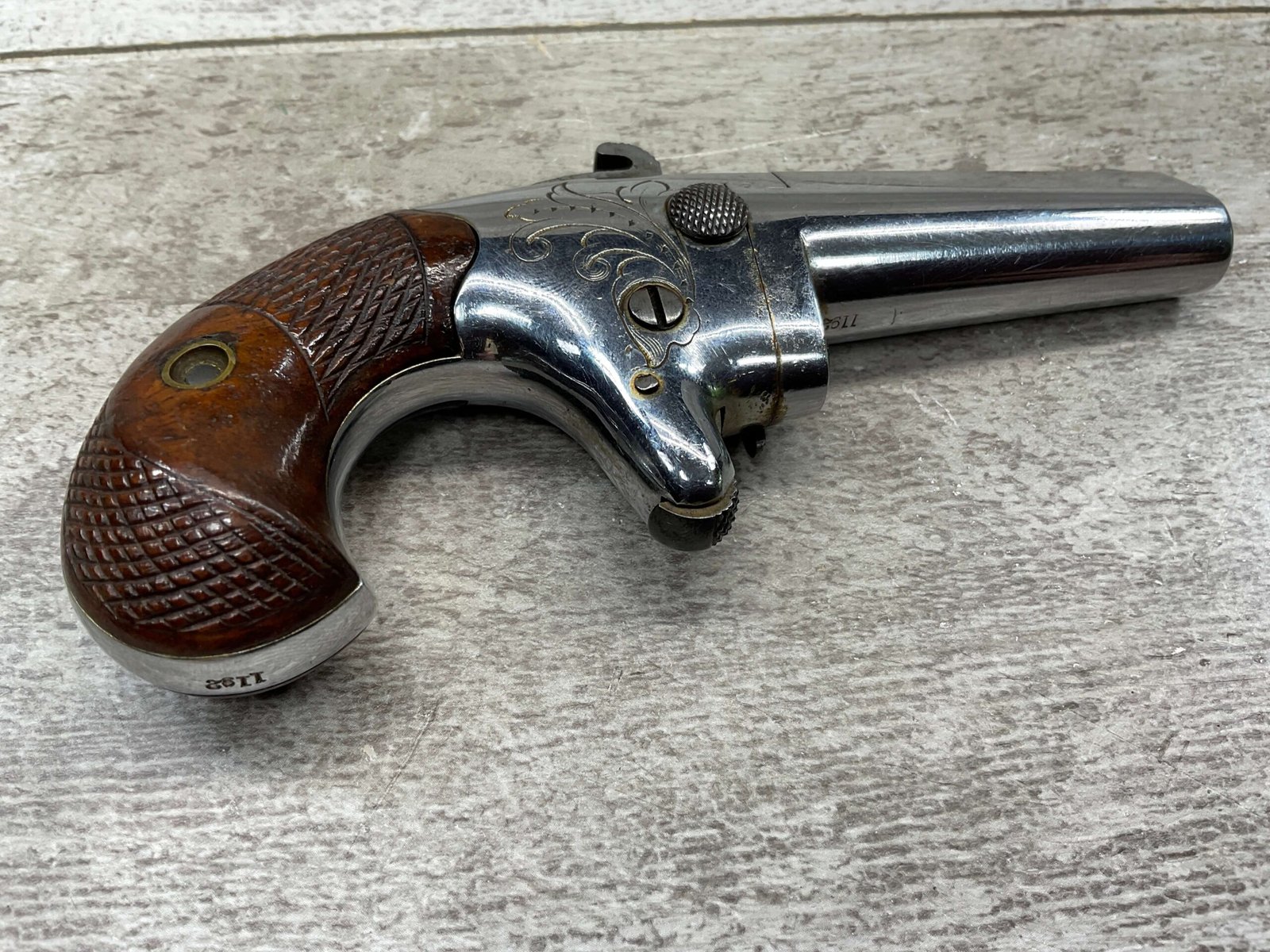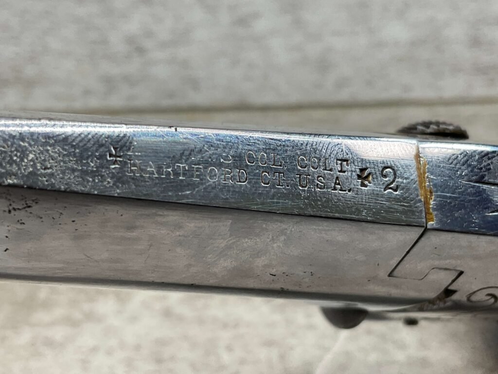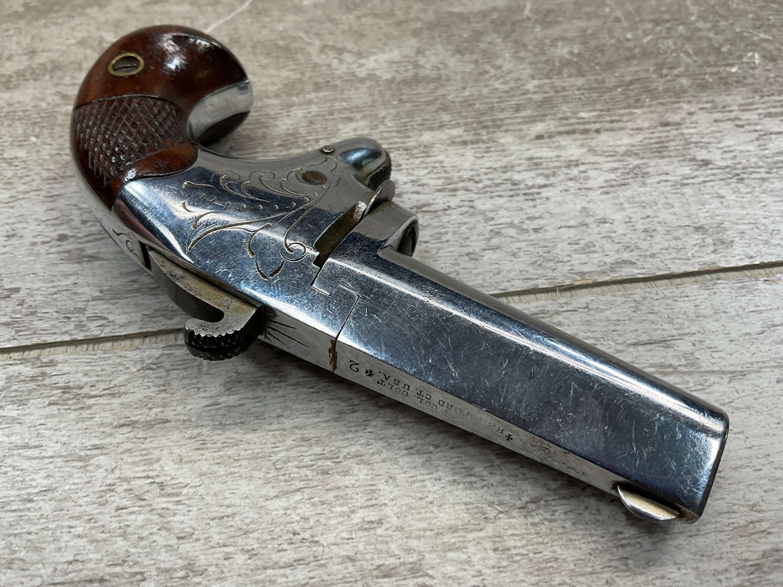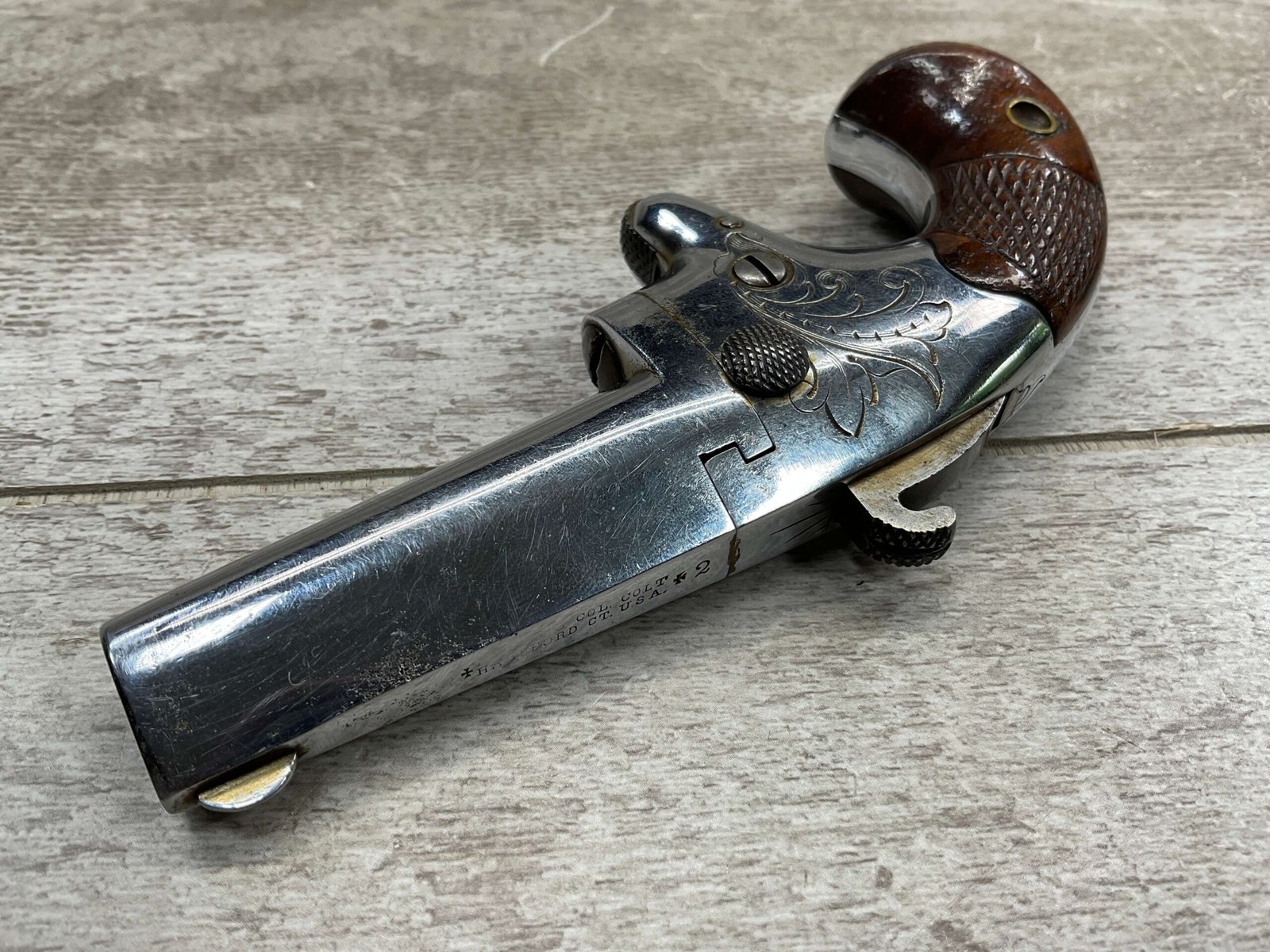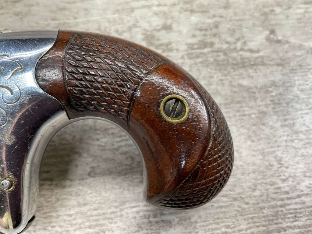 COLT 2nd MODEL .41RF SINGLE SHOT DERRINGER POCKET PISTOL, ANTIQUE #1192, ALL MATCHING, EXC NICKEL FINISH W/ LIGHT SCRATCHES FROM USE/AGE, EXC ORIGINAL CHECKERED WALNUT GRIPS W/ 1192, FAIR BORE W/ FROSTING & VG RIFLING, SPUR TRIGGER, COLTS ADDRESS IN TWO LINES FOLLOW BY “2” ON TOP OF BARREL, NOT A REPRODUCTION, OVERALL CONDITION AS SEEN IN PHOTOS, ACTION IS EXCELLENT & THIS ONE IS A BEAUTY!!