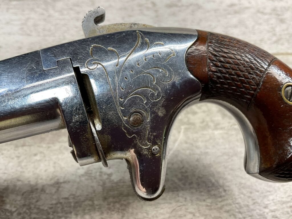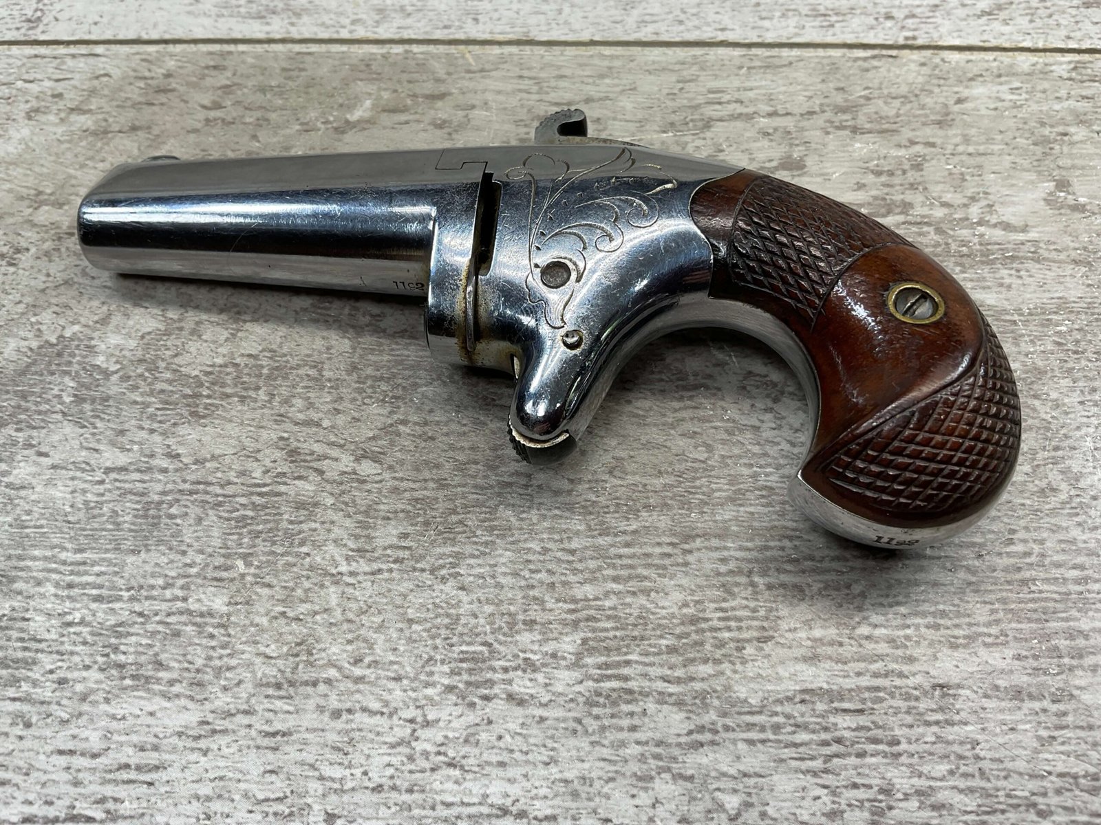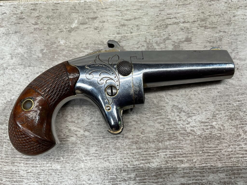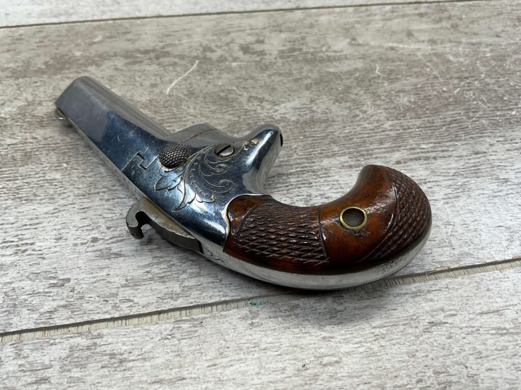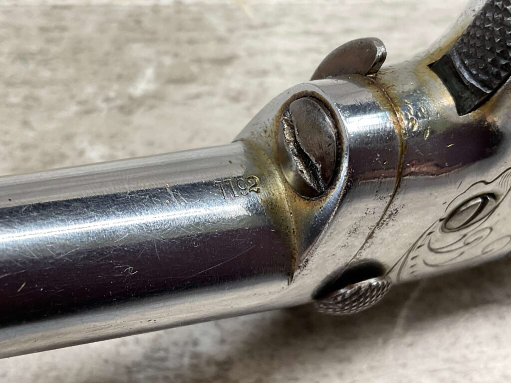 COLT 2nd MODEL .41RF SINGLE SHOT DERRINGER POCKET PISTOL, ANTIQUE #1192, ALL MATCHING, EXC NICKEL FINISH W/ LIGHT SCRATCHES FROM USE/AGE, EXC ORIGINAL CHECKERED WALNUT GRIPS W/ 1192, FAIR BORE W/ FROSTING & VG RIFLING, SPUR TRIGGER, COLTS ADDRESS IN TWO LINES FOLLOW BY “2” ON TOP OF BARREL, NOT A REPRODUCTION, OVERALL CONDITION AS SEEN IN PHOTOS, ACTION IS EXCELLENT & THIS ONE IS A BEAUTY!!