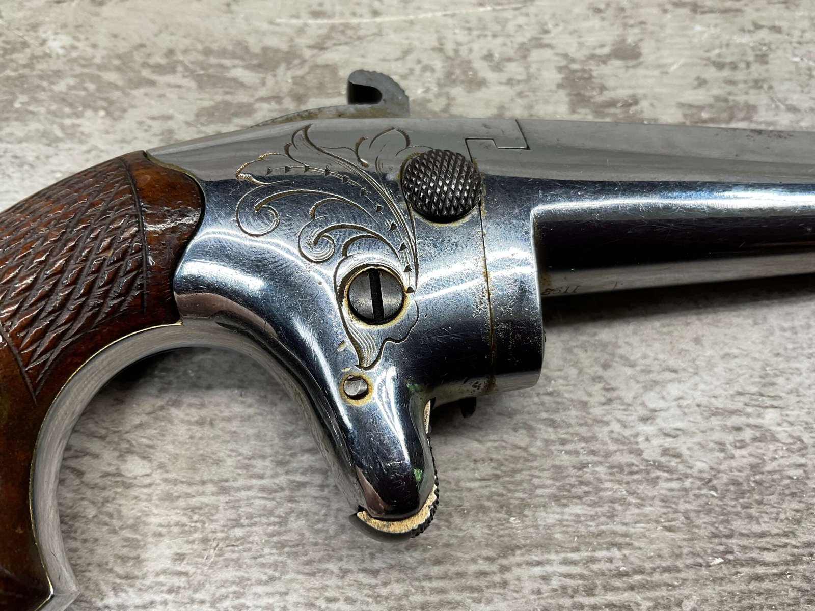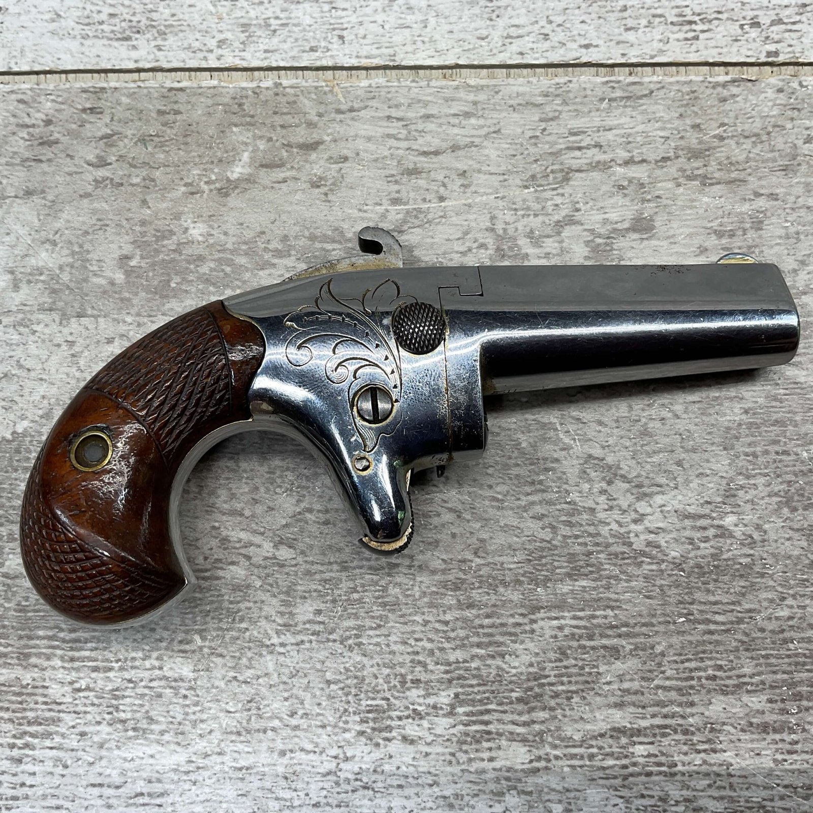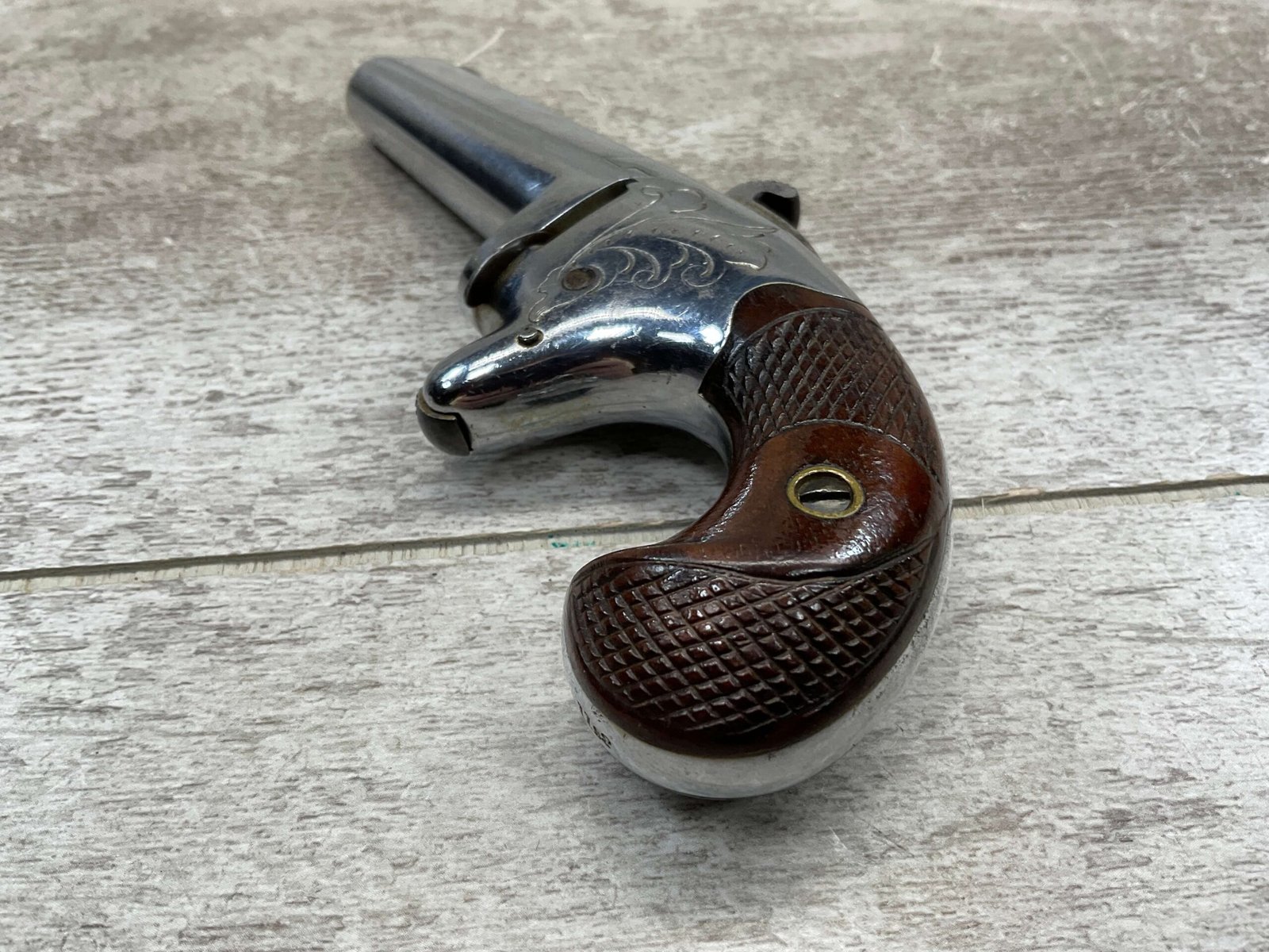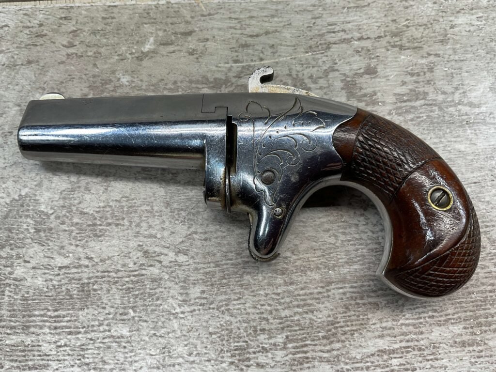 COLT 2nd MODEL .41RF SINGLE SHOT DERRINGER POCKET PISTOL, ANTIQUE #1192, ALL MATCHING, EXC NICKEL FINISH W/ LIGHT SCRATCHES FROM USE/AGE, EXC ORIGINAL CHECKERED WALNUT GRIPS W/ 1192, FAIR BORE W/ FROSTING & VG RIFLING, SPUR TRIGGER, COLTS ADDRESS IN TWO LINES FOLLOW BY “2” ON TOP OF BARREL, NOT A REPRODUCTION, OVERALL CONDITION AS SEEN IN PHOTOS, ACTION IS EXCELLENT & THIS ONE IS A BEAUTY!!