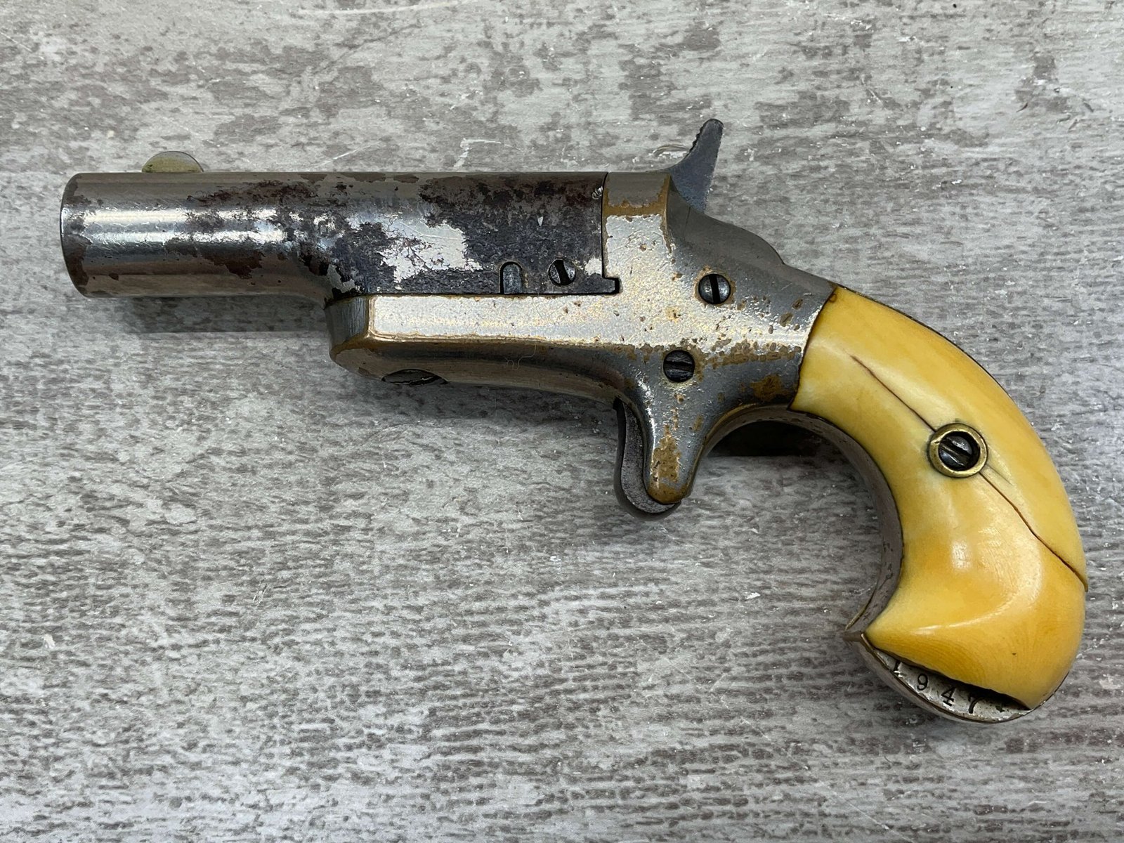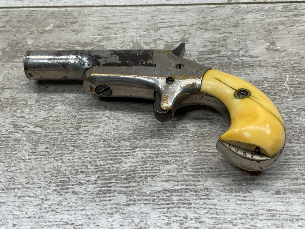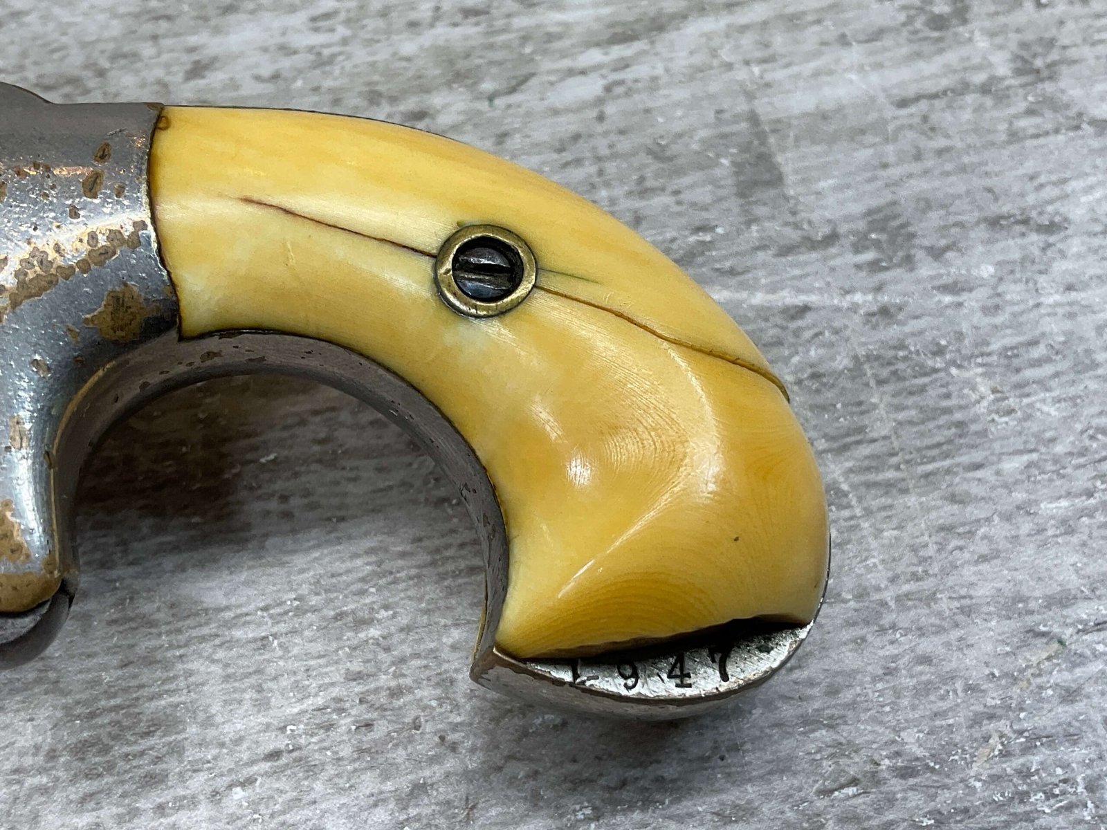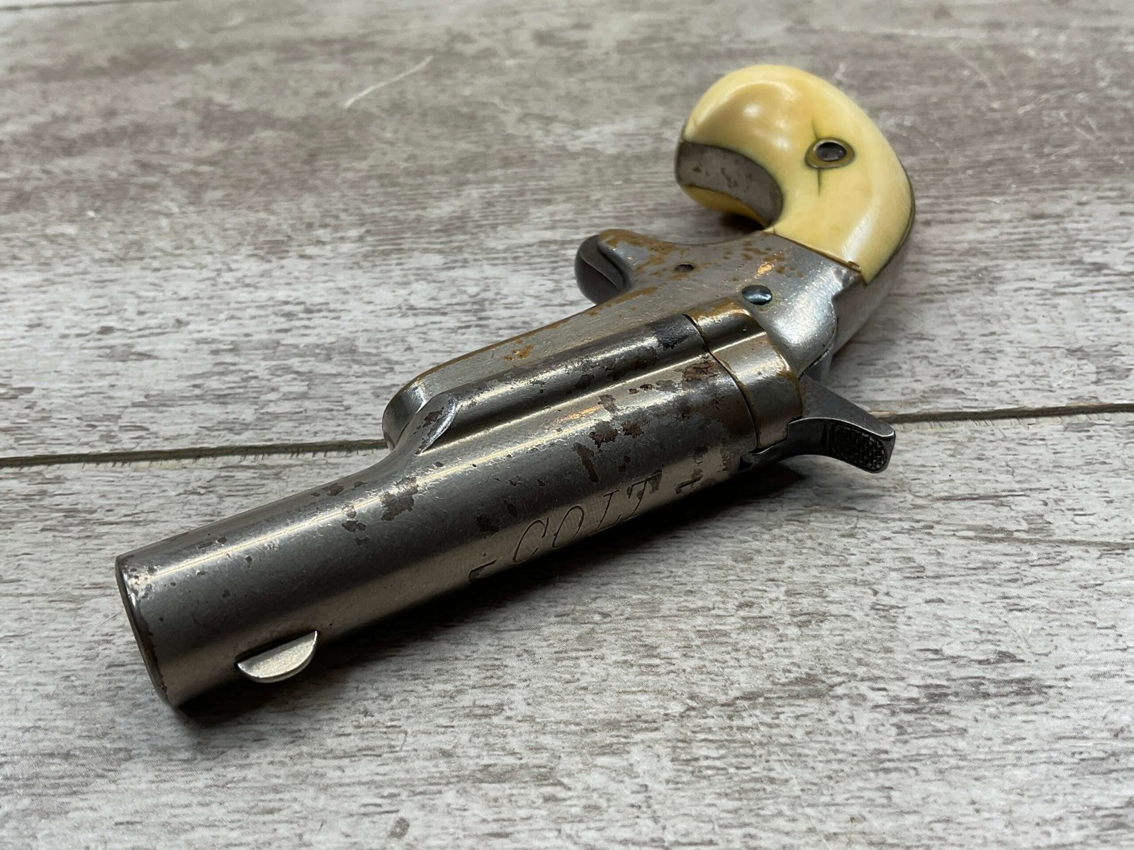COLT 3RD MODEL .41RF DERRINGER SINGLE SHOT PISTOL, ANTIQUE W/ IVORY GRIPS #1947, .41 RIMFIRE, BRASS FRAME W/ APPROX 80% NICKEL FINISH REMAINING, 50% NICKEL REMAINING ON 2.5″ BARREL, GOOD BORE & RIFLING W/ FROSTING IN AREAS, TIGHT CURL GRIP & HIGH HAMMER, SPUR TRIGGER, “COLT” ON TOP OF SWING OUT BARREL, NOT A REPRODUCTION, OVERALL CONDITION AS SEEN IN PHOTOS