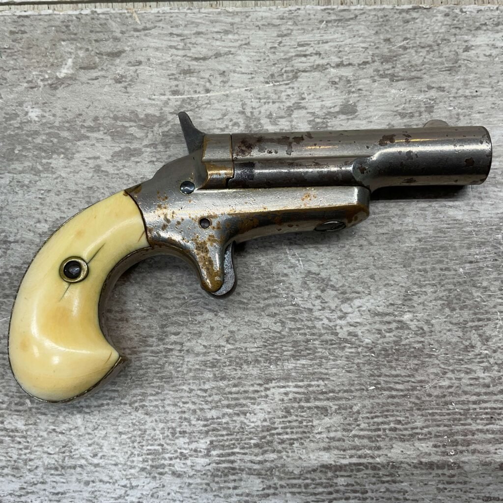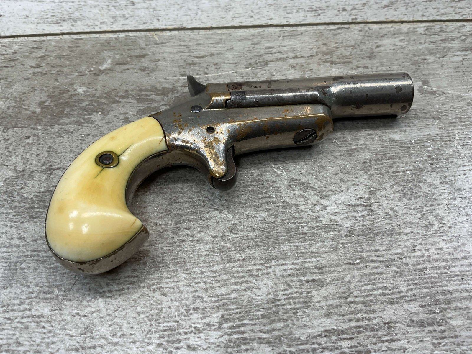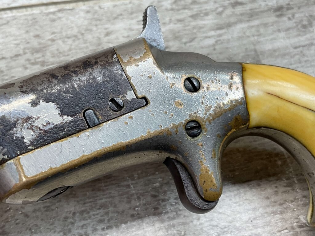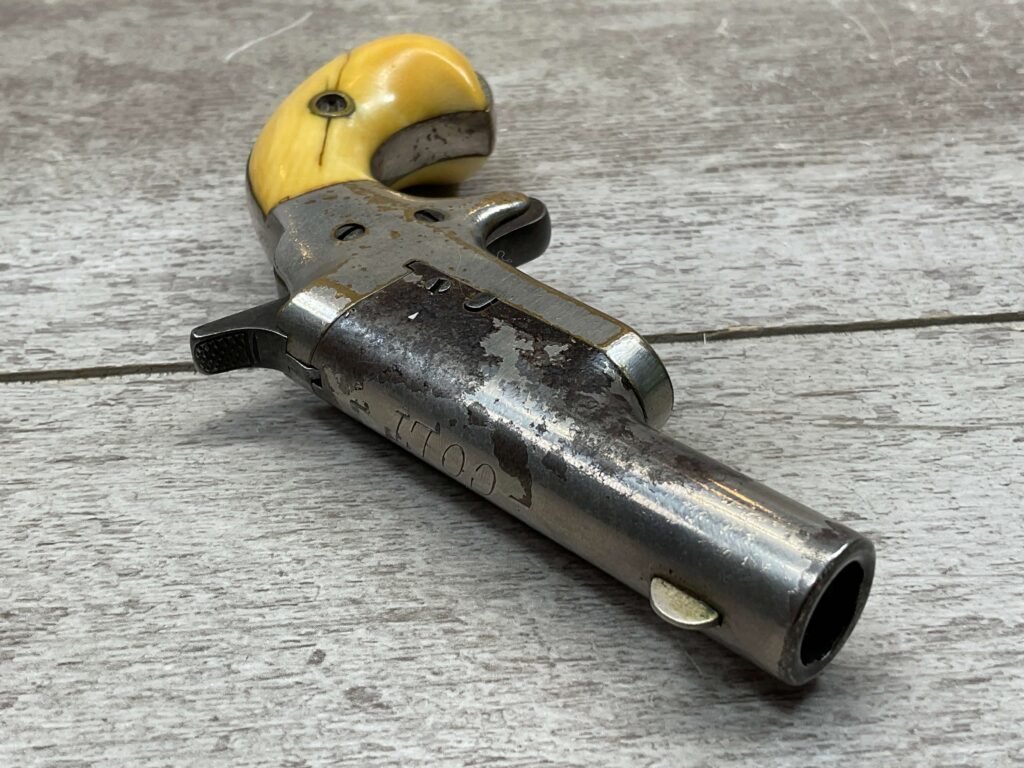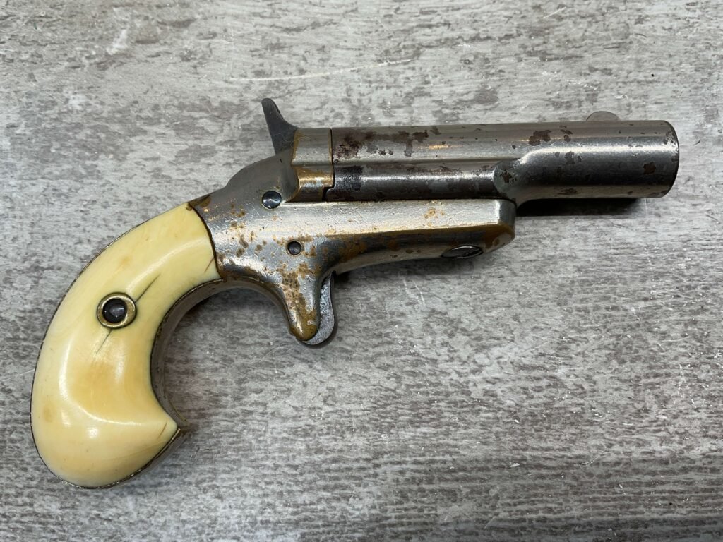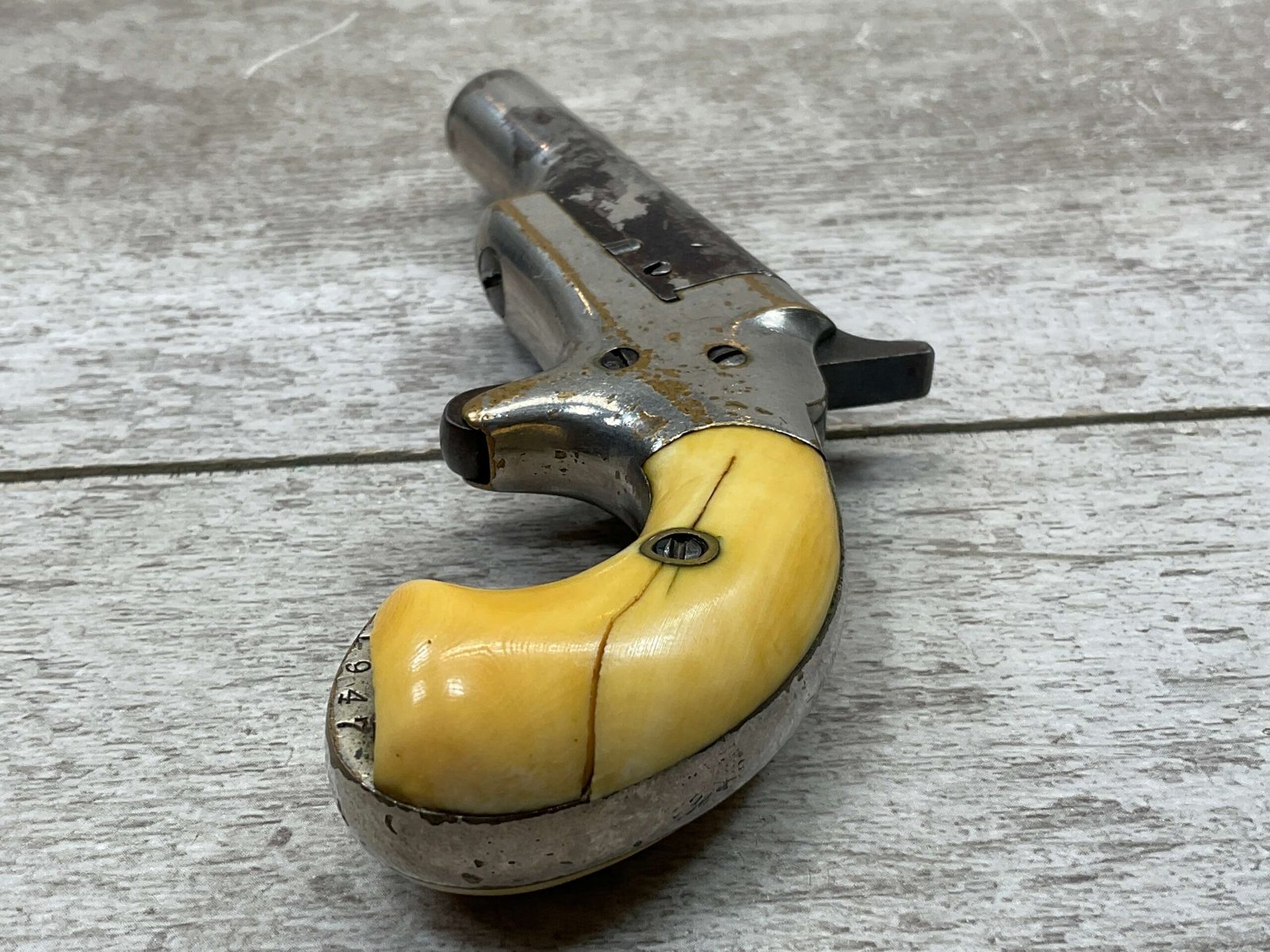 COLT 3RD MODEL .41RF DERRINGER SINGLE SHOT PISTOL, ANTIQUE W/ IVORY GRIPS #1947, .41 RIMFIRE, BRASS FRAME W/ APPROX 80% NICKEL FINISH REMAINING, 50% NICKEL REMAINING ON 2.5″ BARREL, GOOD BORE & RIFLING W/ FROSTING IN AREAS, TIGHT CURL GRIP & HIGH HAMMER, SPUR TRIGGER, “COLT” ON TOP OF SWING OUT BARREL, NOT A REPRODUCTION, OVERALL CONDITION AS SEEN IN PHOTOS