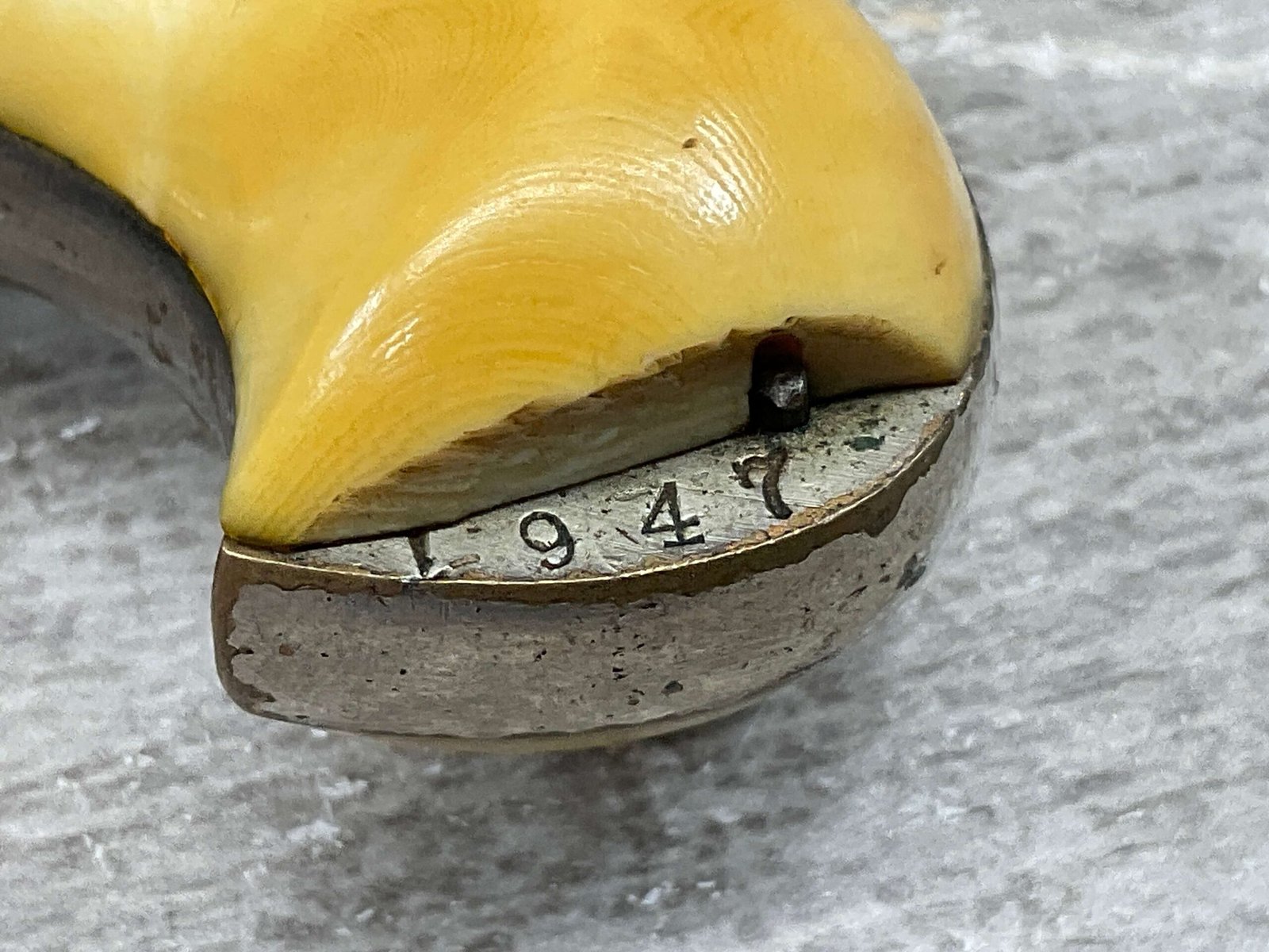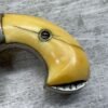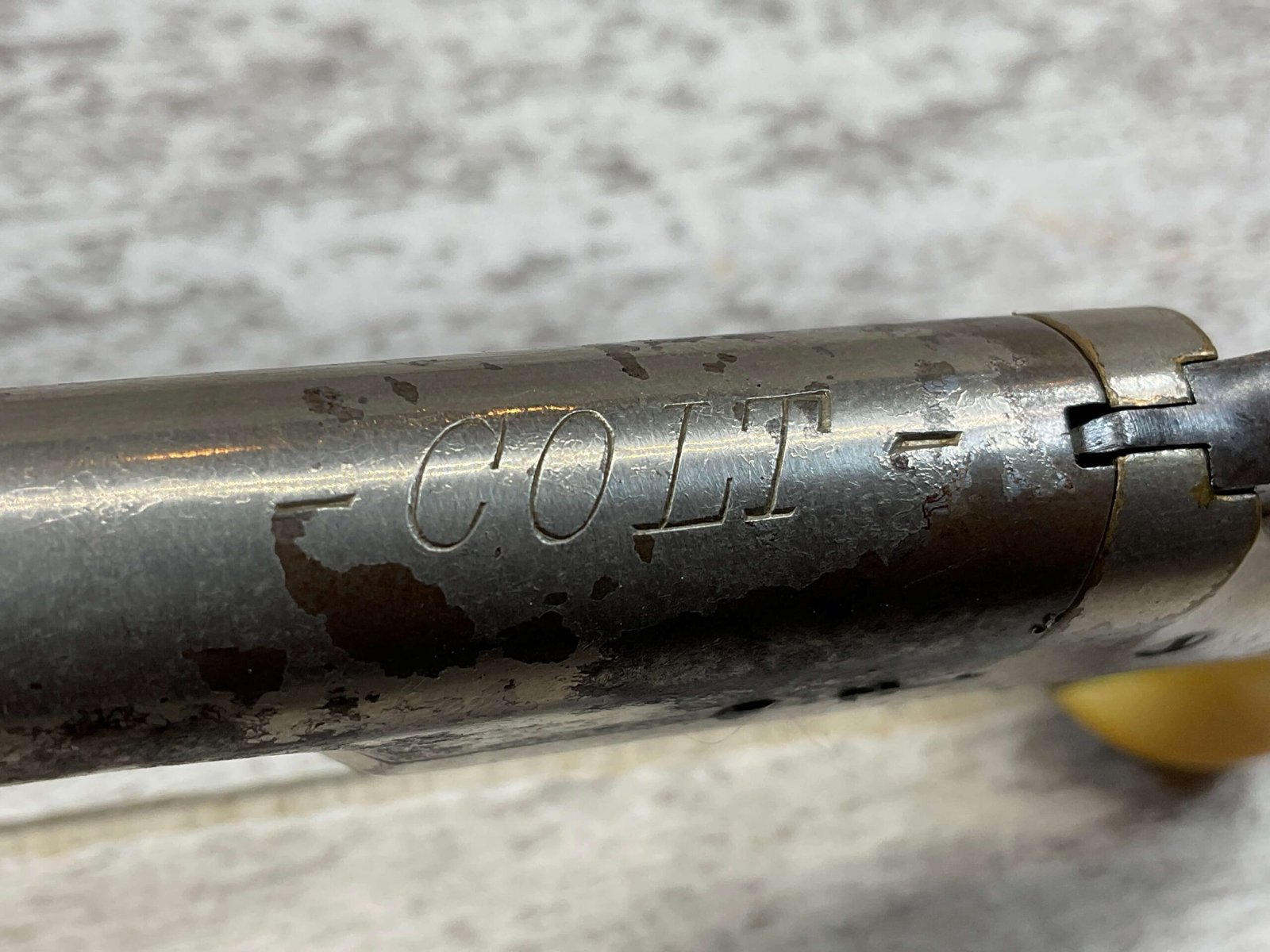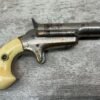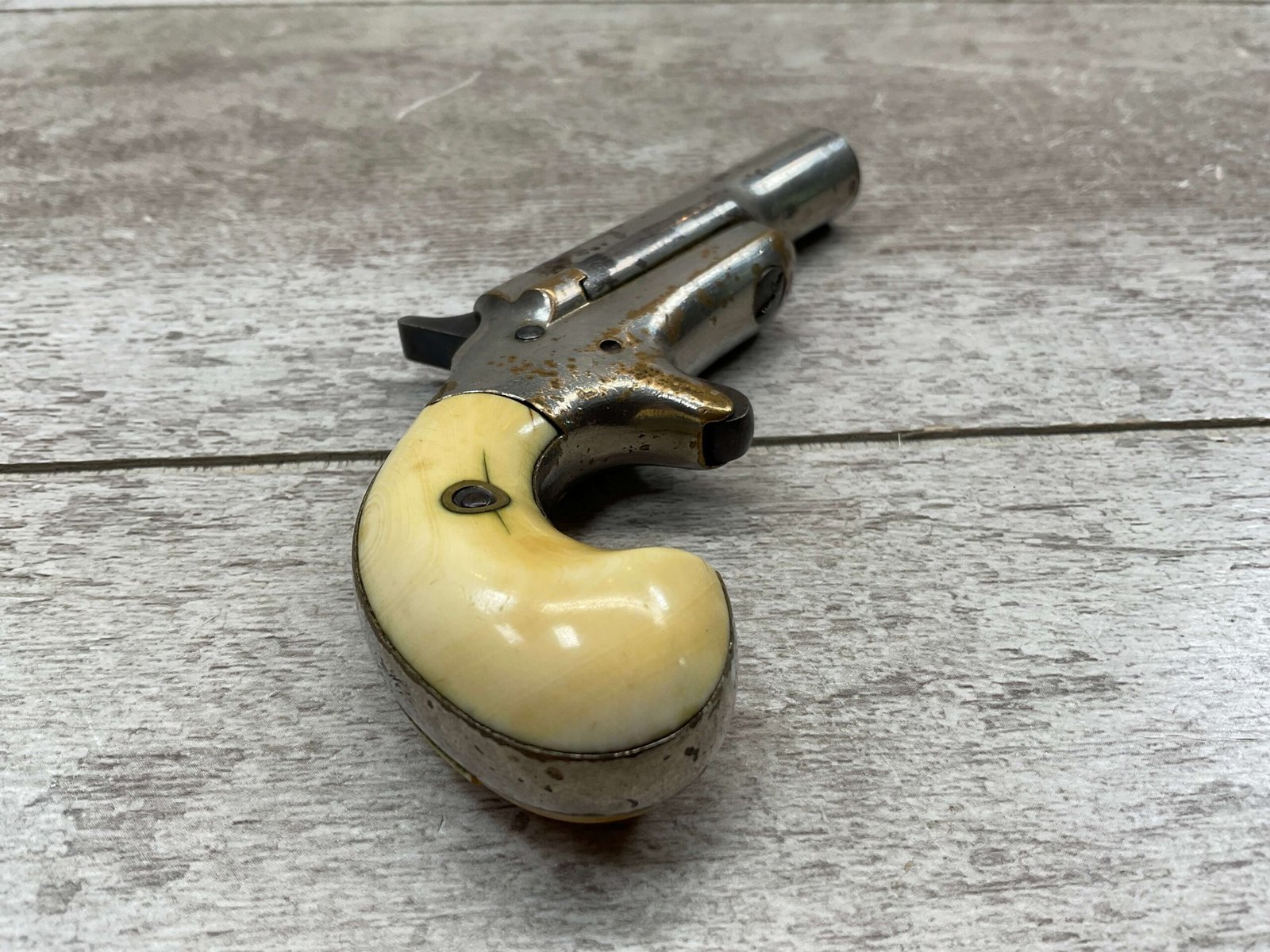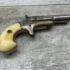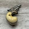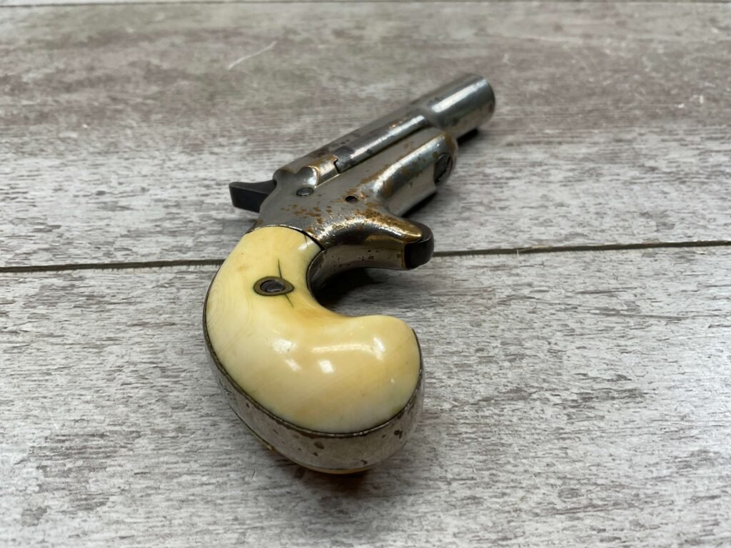 COLT 3RD MODEL .41RF DERRINGER SINGLE SHOT PISTOL, ANTIQUE W/ IVORY GRIPS #1947, .41 RIMFIRE, BRASS FRAME W/ APPROX 80% NICKEL FINISH REMAINING, 50% NICKEL REMAINING ON 2.5″ BARREL, GOOD BORE & RIFLING W/ FROSTING IN AREAS, TIGHT CURL GRIP & HIGH HAMMER, SPUR TRIGGER, “COLT” ON TOP OF SWING OUT BARREL, NOT A REPRODUCTION, OVERALL CONDITION AS SEEN IN PHOTOS