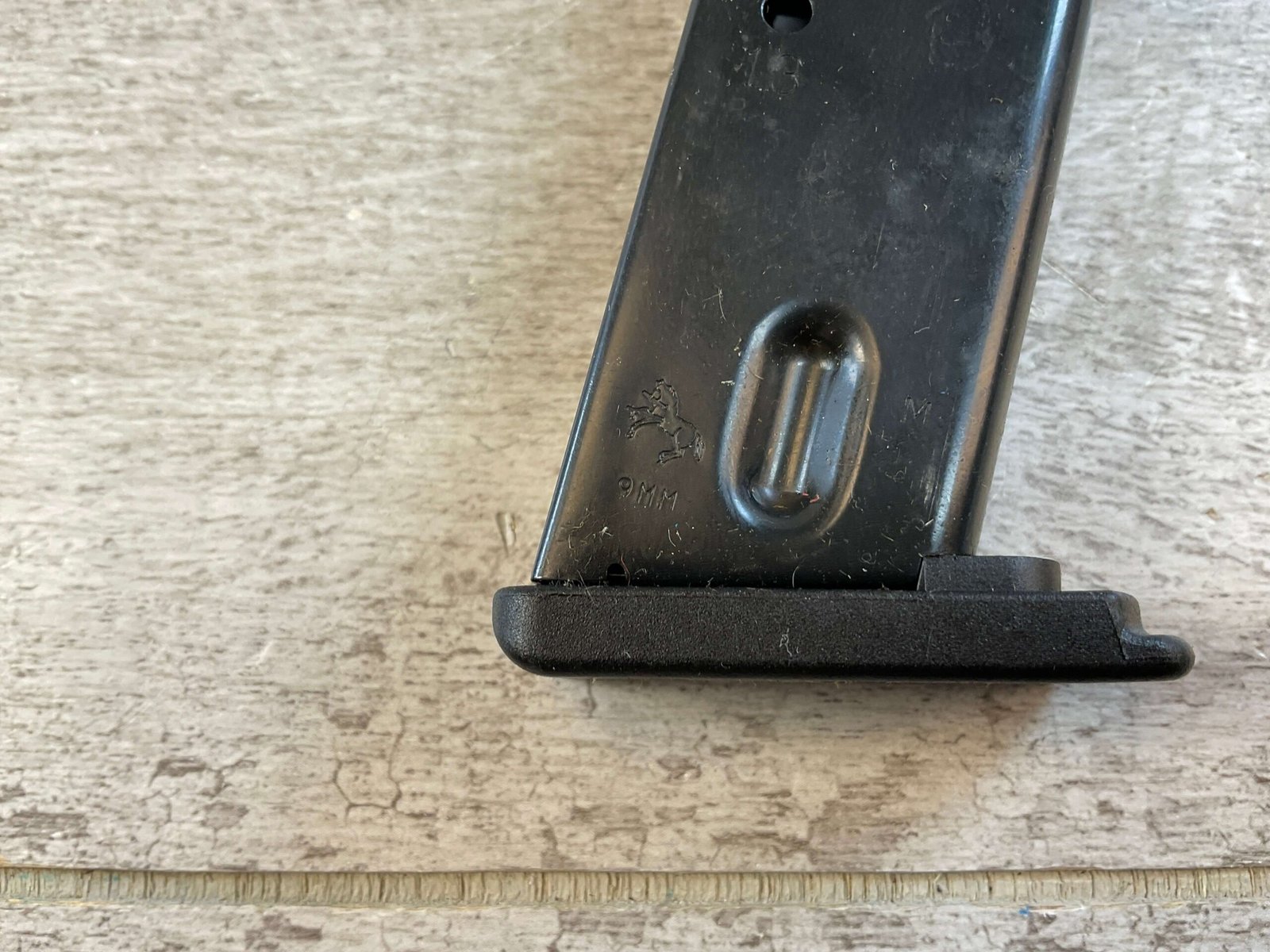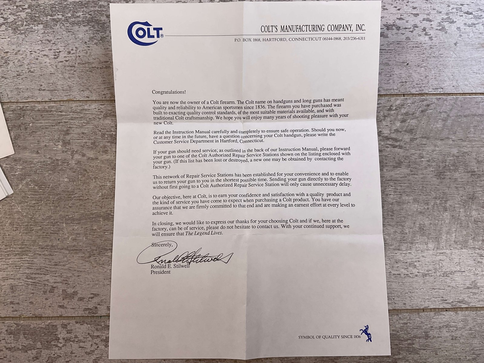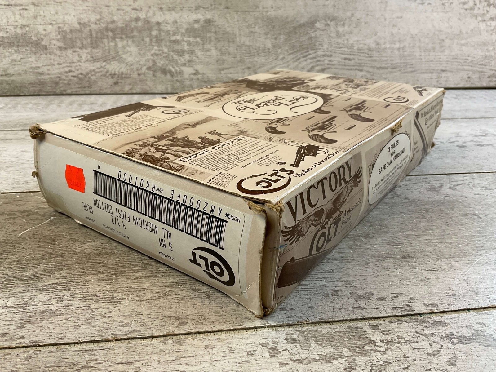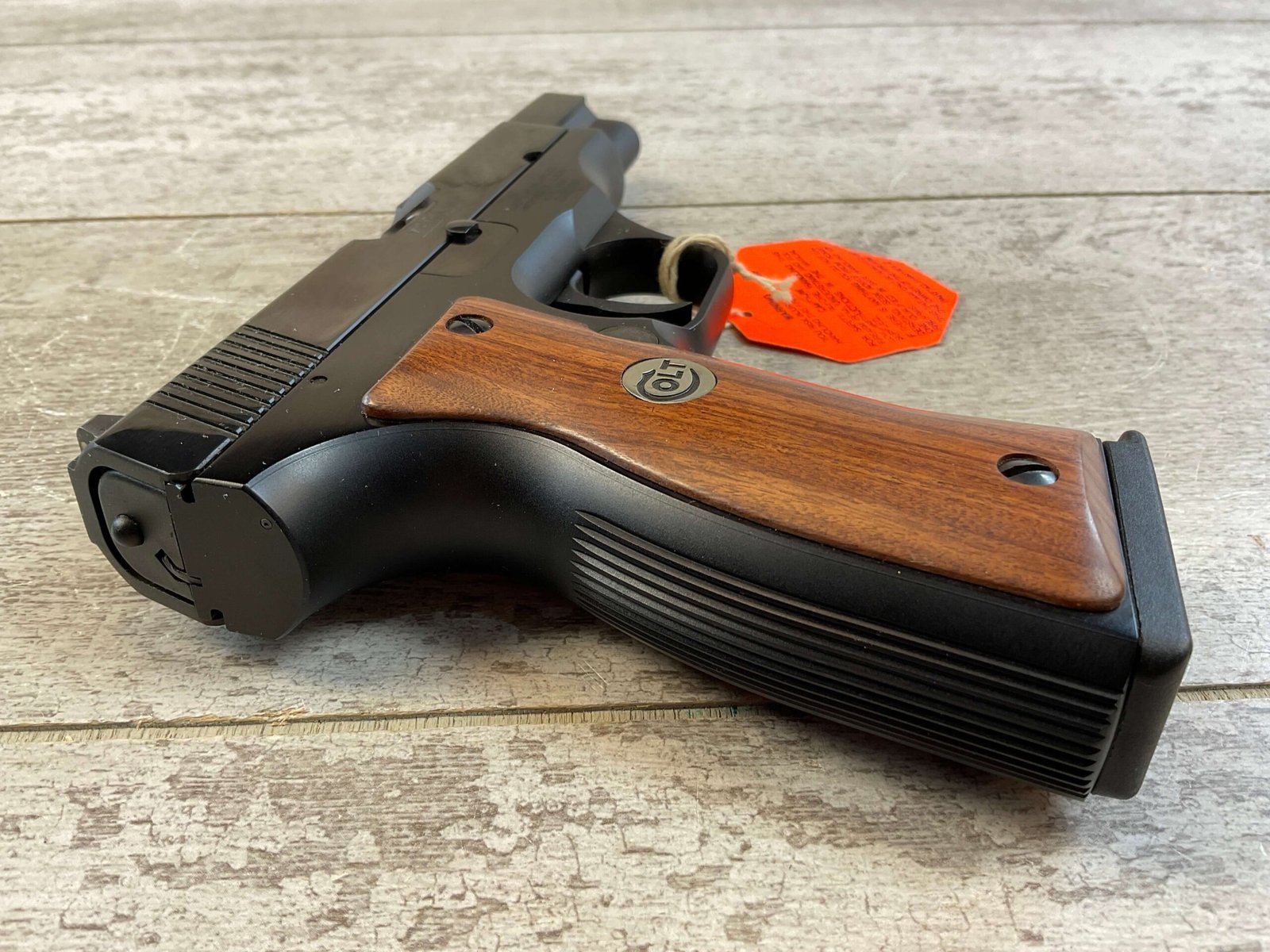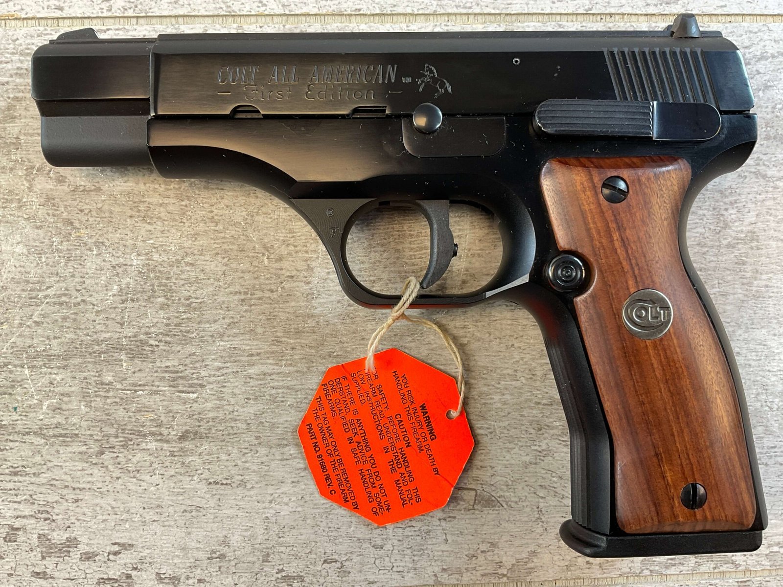 COLT ALL AMERICAN MODEL 2000 FIRST EDITION 9MM SEMI AUTO PISTOL, MINTY #RK01000, 4.5″ BBL, EXC BORE & RIFLING (APPEARS UNFIRED), EXC BLUE FINISH, EXC WOOD COLT GRIPS, ORIGINAL BOX & PAPERWORK INCLUDED AS WELL AS MAGAZINE, CLEANING KIT, UNIQUE DOUBLE ACTION ONLY DESIGN, CONDITION AS SHOWN IN PICTURES