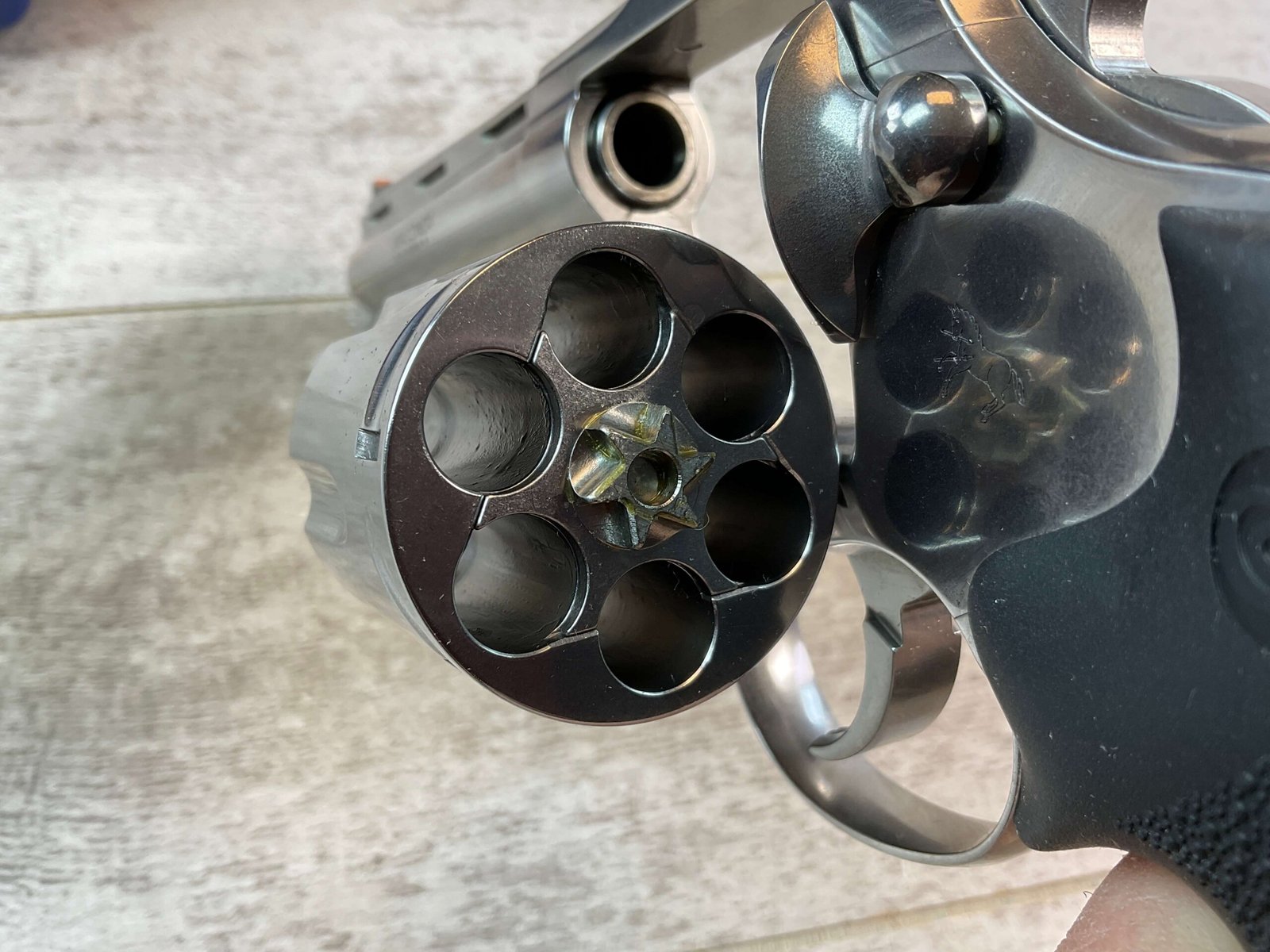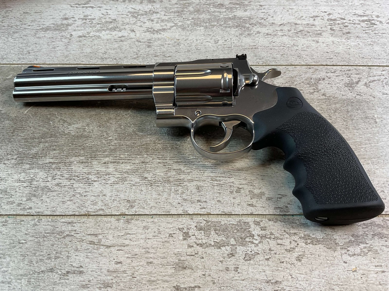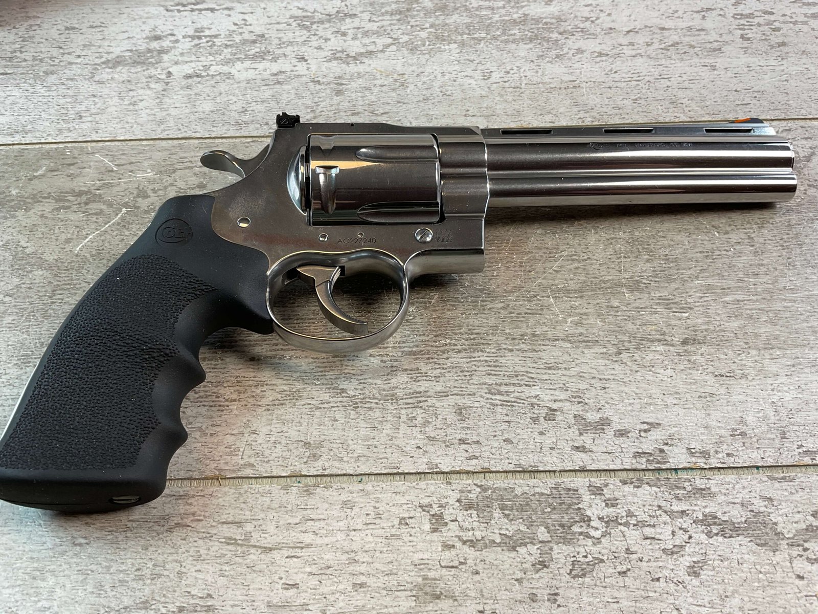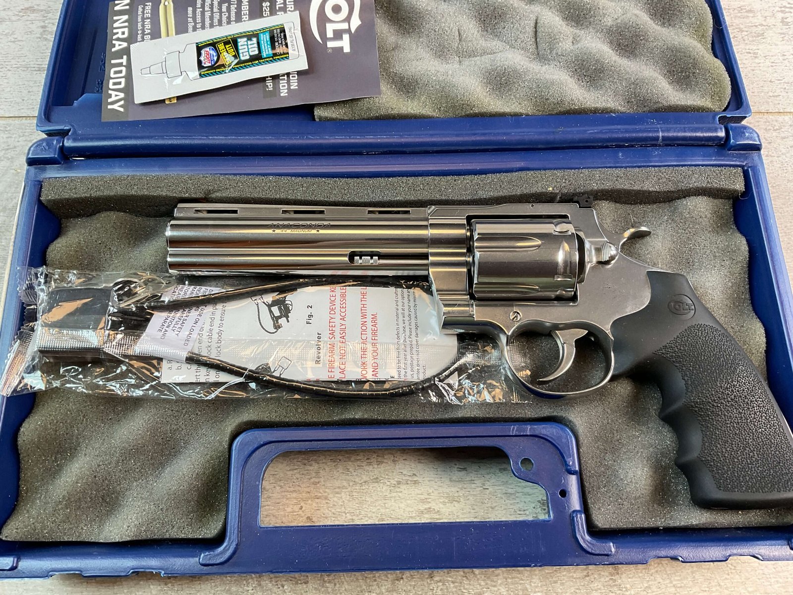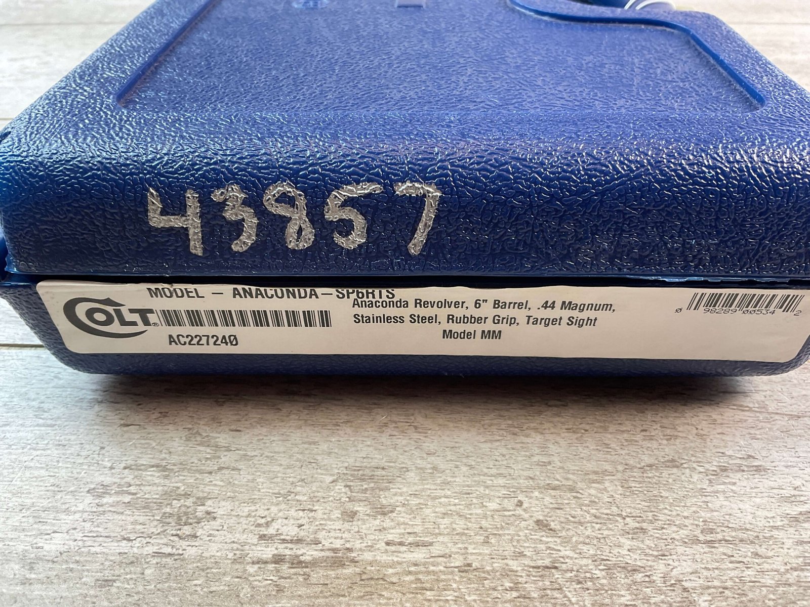 COLT ANACONDA .44 MAGNUM REVOLVER #AC227240, 6″ BARREL, EXC BORE & RIFLING (1 BOX OF AMMO SHOT THROUGH THIS ONE), EXC STAINLESS FINISH, RUBBER GRIPS, TARGET SIGHTS, ORIGINAL BLUE PLASTIC BOX, MODEL MM, VERY NICE, CONDITION AS SHOWN IN PICTURES.