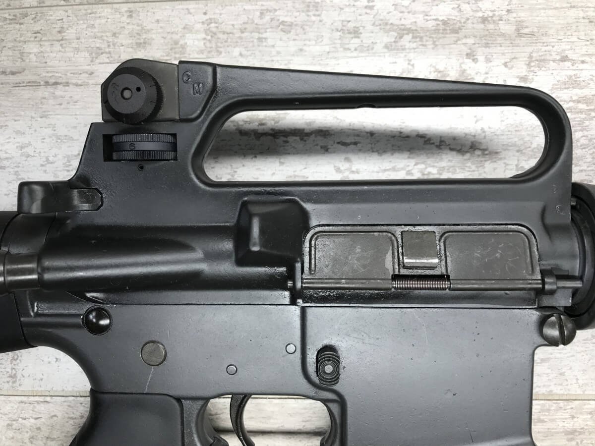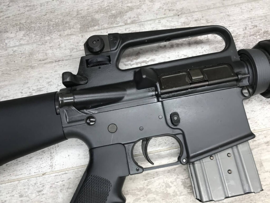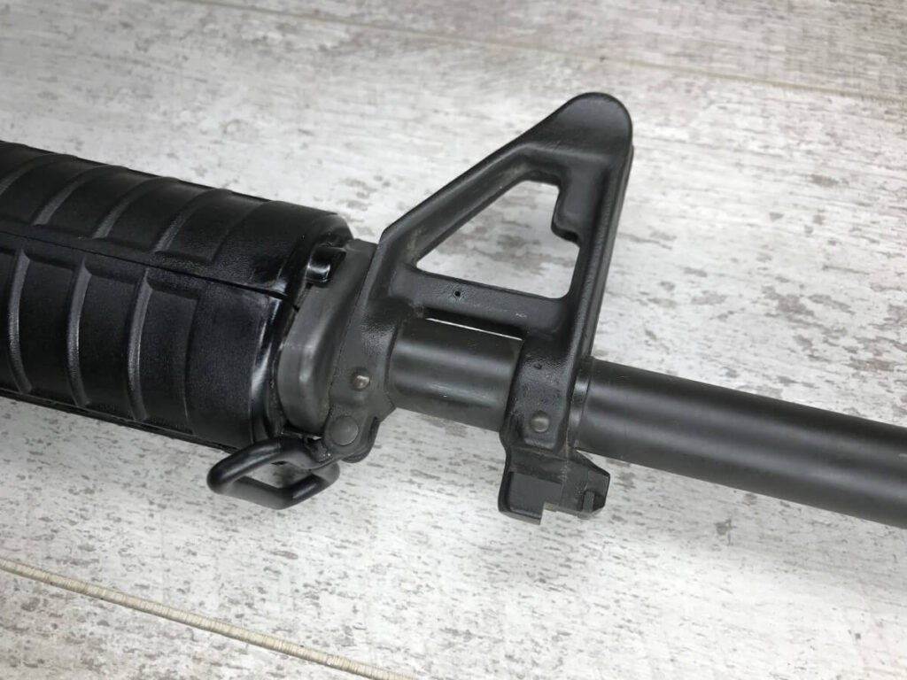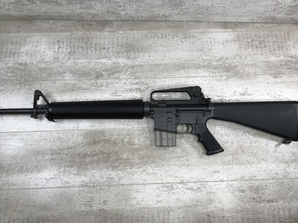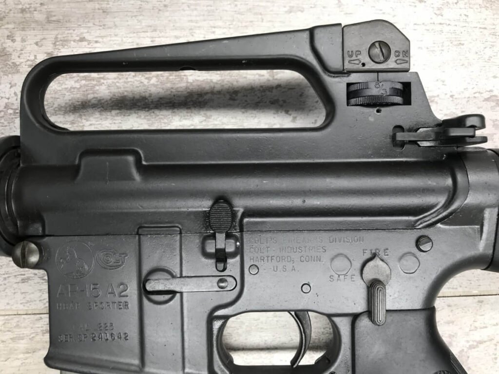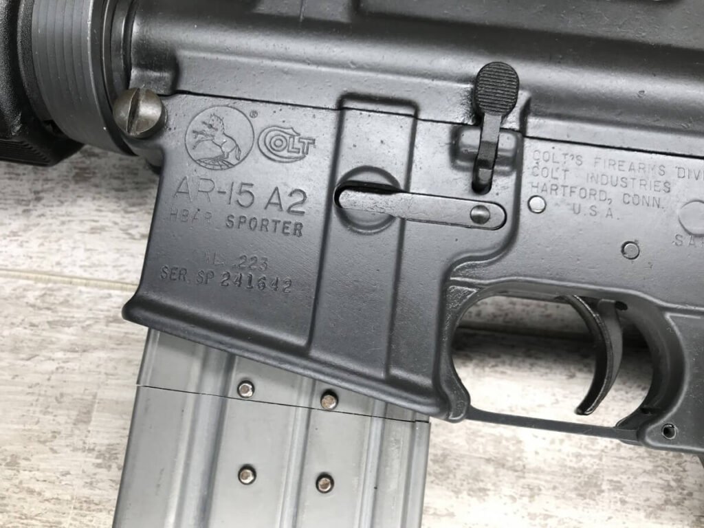 COLT AR15 PRE BAN A2 HBAR SPORTER SEMI AUTO RIFLE #SP241642, 20″ BBL, .223 CAL, 1/7″ TWIST, A2 FLASH HIDER, BAYONET LUG, FIXED CARRY HANDLE, EXC PHOSPHATE FINISH, 1-20 ROUND METAL MAG, BBL MARKED “CMP 5.56 NATO 1/7 HBAR”, SOME LIGHT USE SCUFFS, VG-EXC BORE, 95%