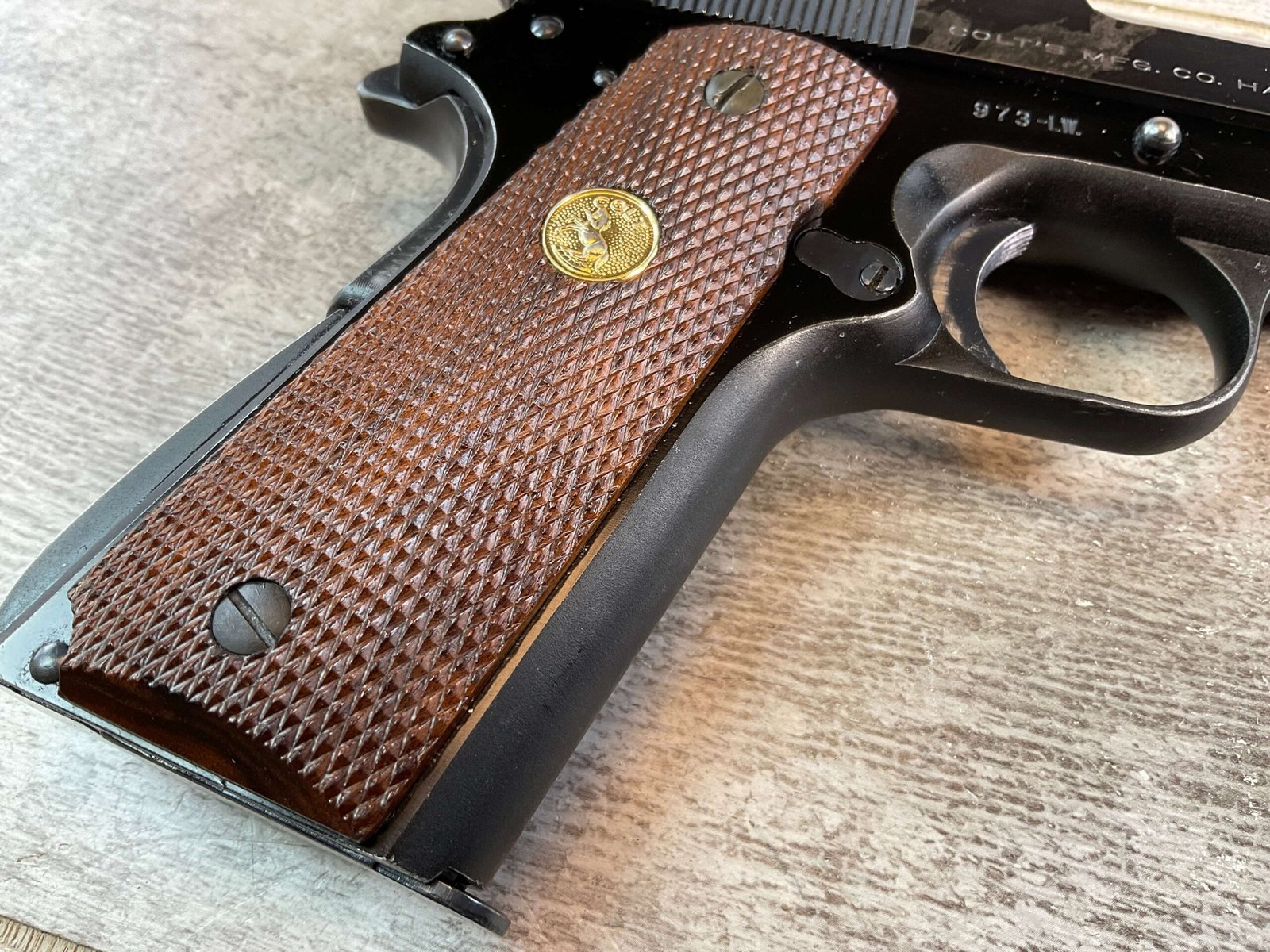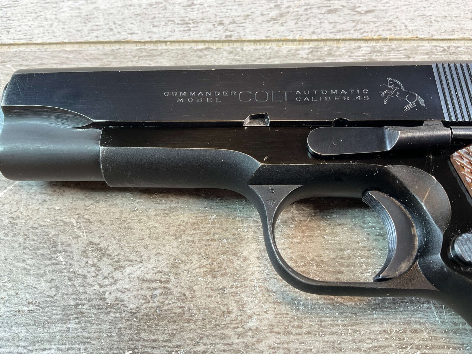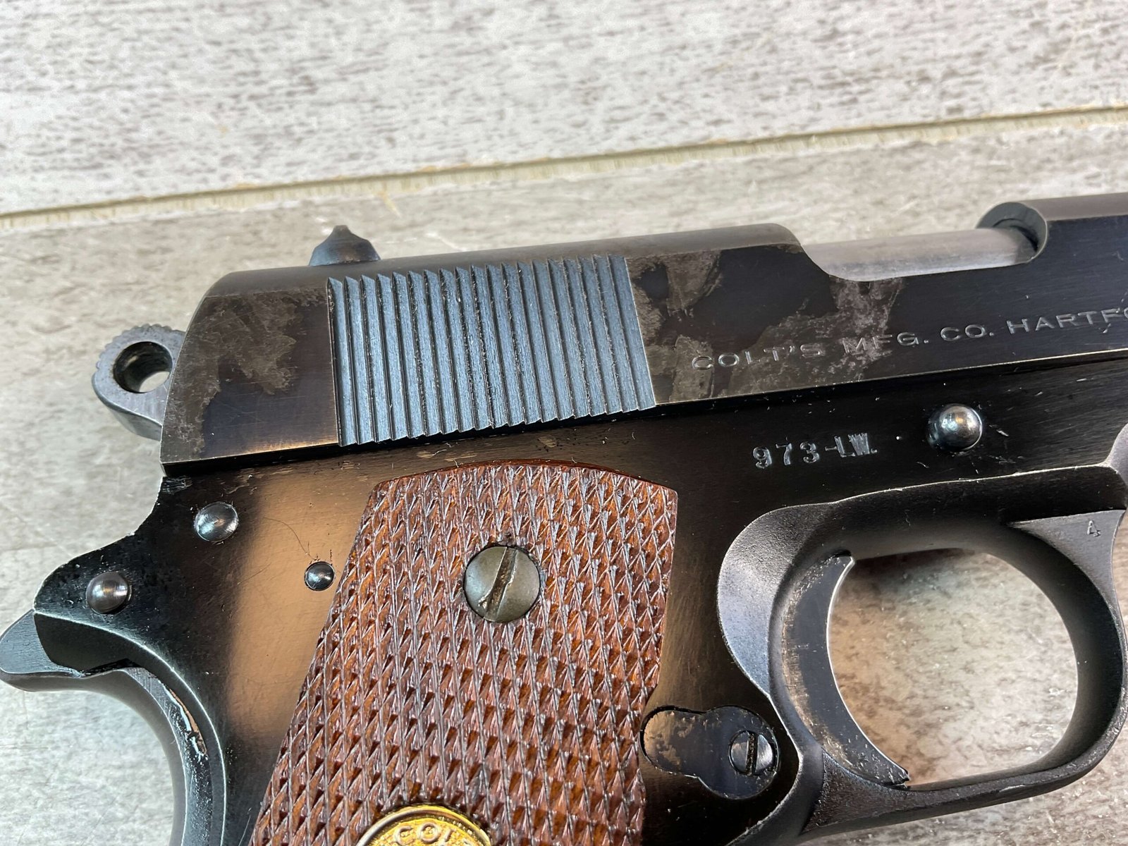 COLT COMMANDER 1911A1 .45ACP SEMI AUTO PISTOL, 1950 MFR (FIRST YEAR PRODUCTION) #973LW, 4.5″ BARRL, ALUMINUM ALLOY FRAME, EXC BORE & RIFLING, EXC LATE CHECKERED GRIPS, VG ORIGINAL BLUE FINISH W/ TWO AREAS OF FINISH LOSS ON RIGHT SIDE AROUND REAR SERRATIONS, SMOOTH ACTION, FIRST YEAR & MONTH OF PRODUCTION OF THE LIGHT WEIGHT, CONDITION AS SHOWN IN PICTURES