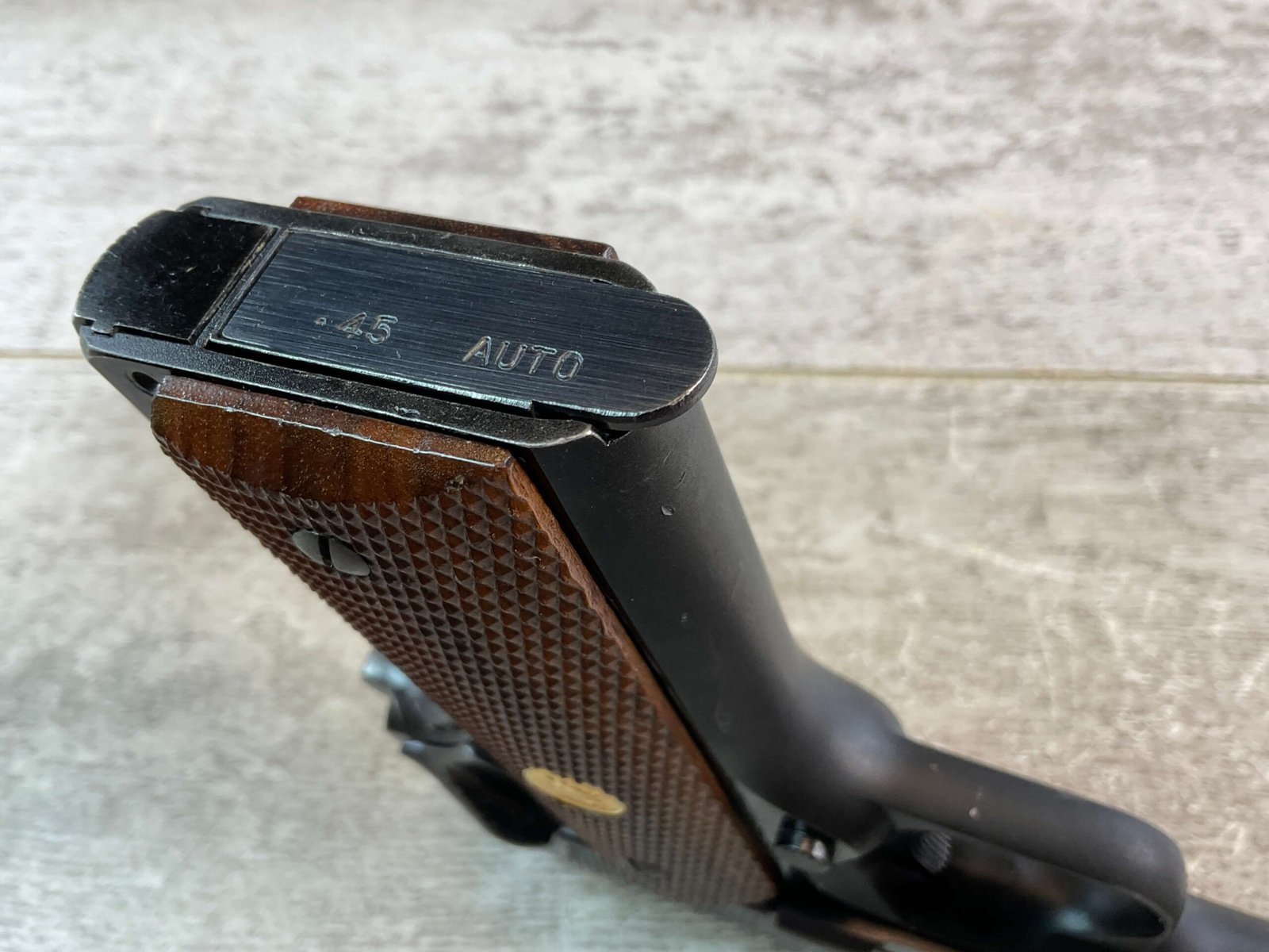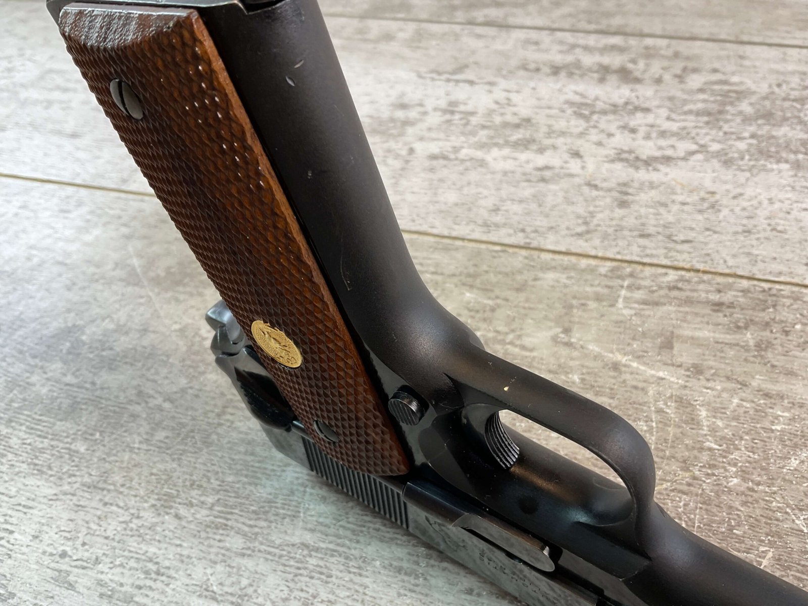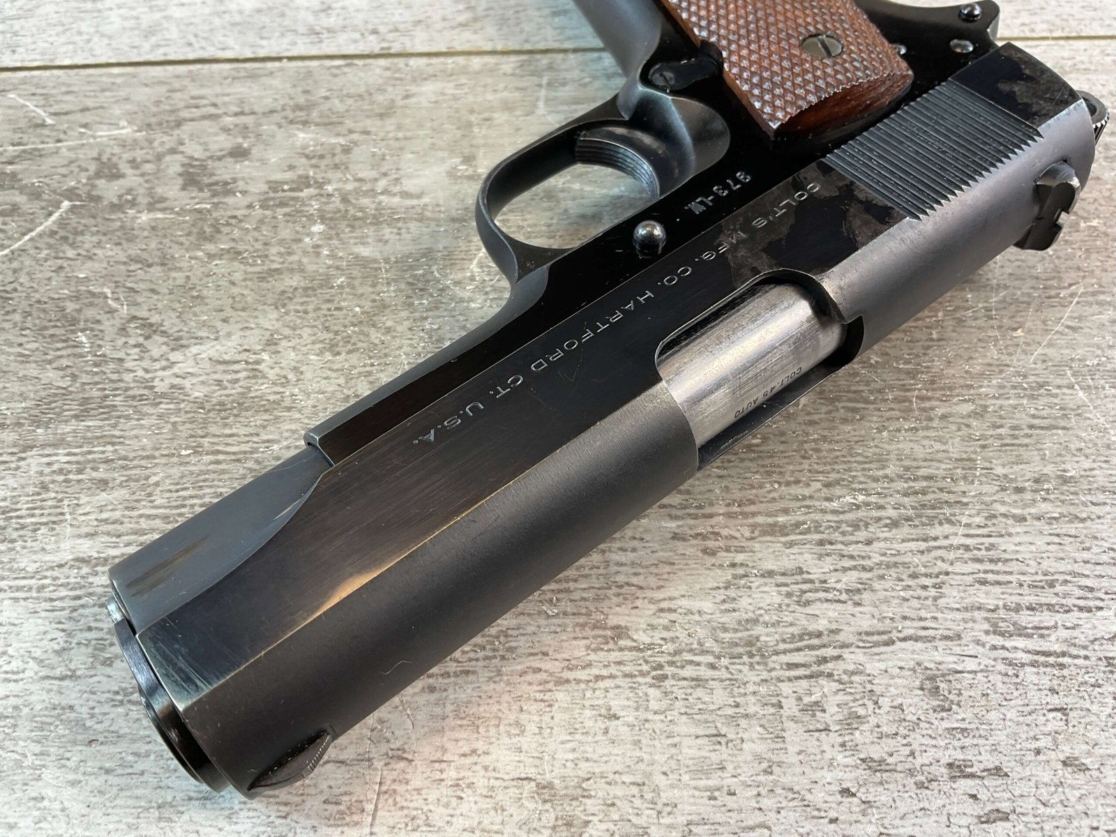 COLT COMMANDER 1911A1 .45ACP SEMI AUTO PISTOL, 1950 MFR (FIRST YEAR PRODUCTION) #973LW, 4.5″ BARRL, ALUMINUM ALLOY FRAME, EXC BORE & RIFLING, EXC LATE CHECKERED GRIPS, VG ORIGINAL BLUE FINISH W/ TWO AREAS OF FINISH LOSS ON RIGHT SIDE AROUND REAR SERRATIONS, SMOOTH ACTION, FIRST YEAR & MONTH OF PRODUCTION OF THE LIGHT WEIGHT, CONDITION AS SHOWN IN PICTURES