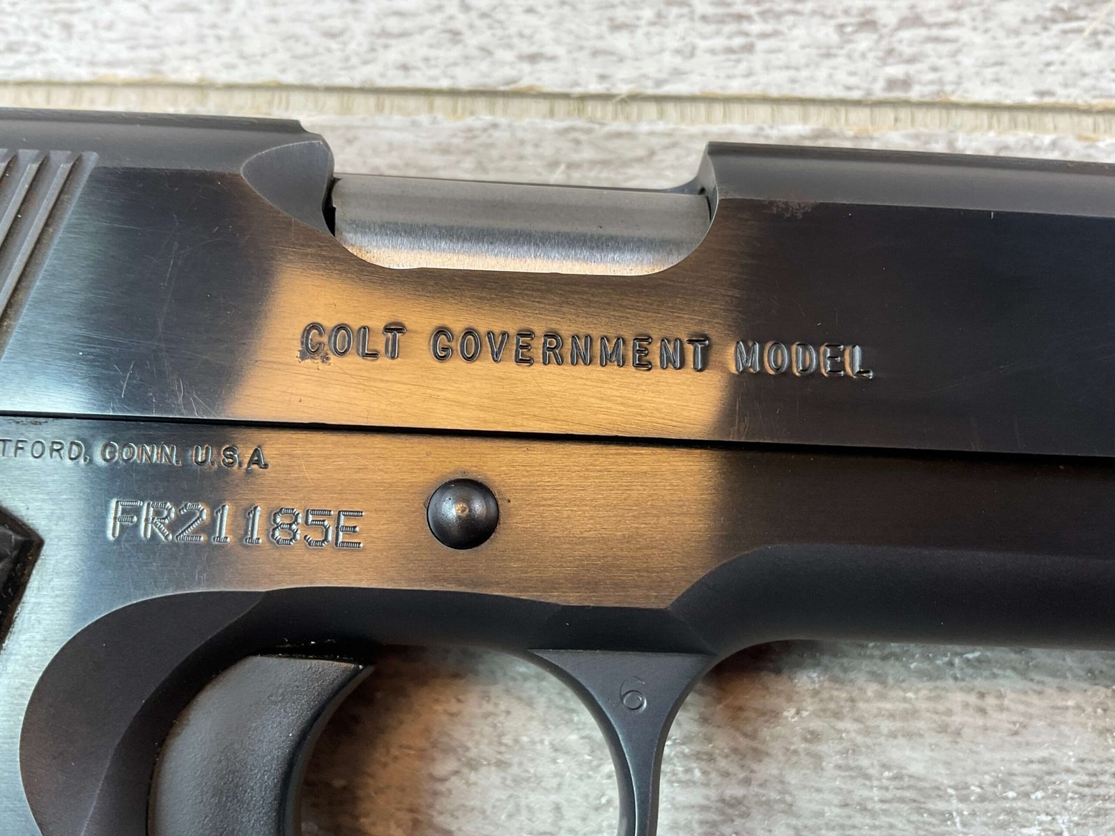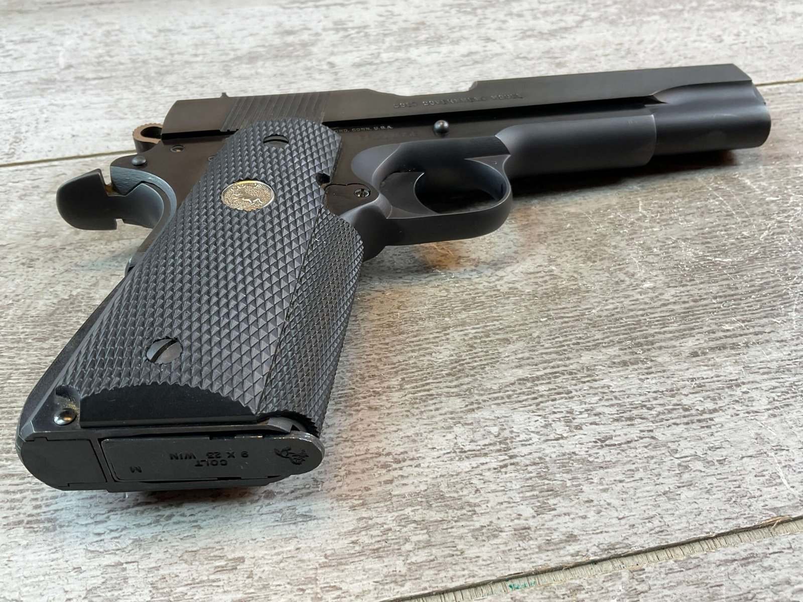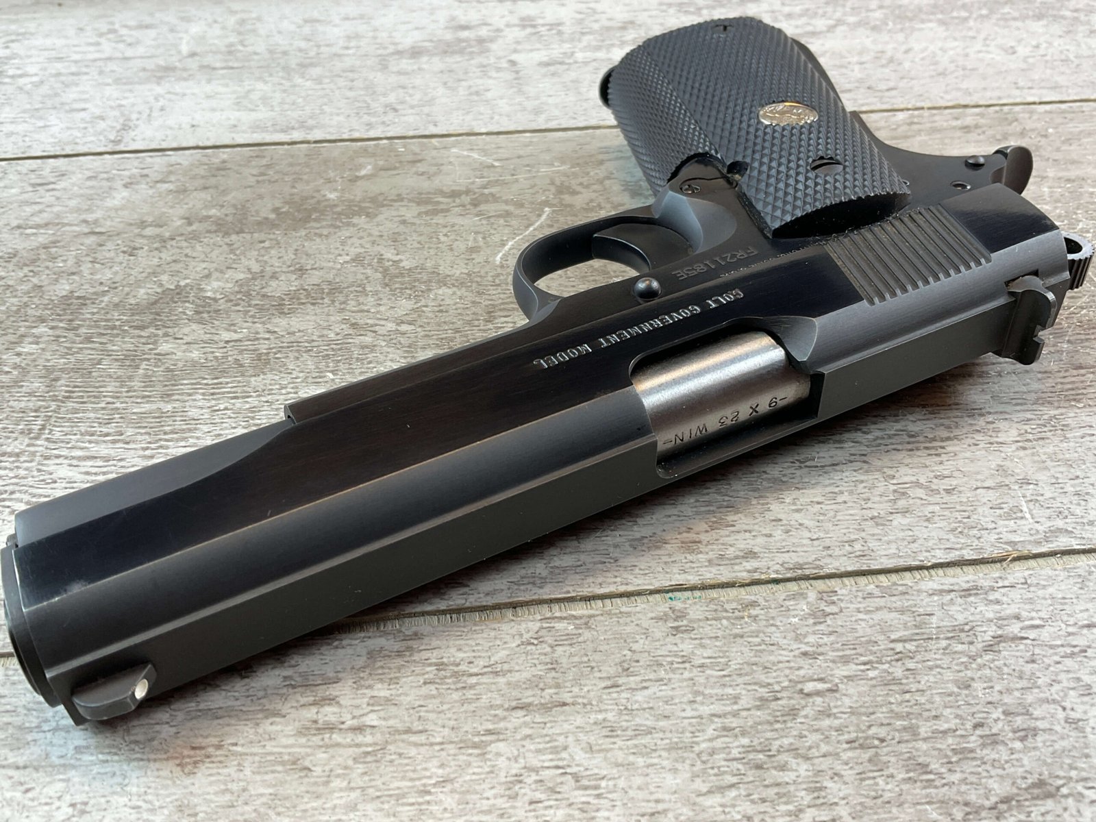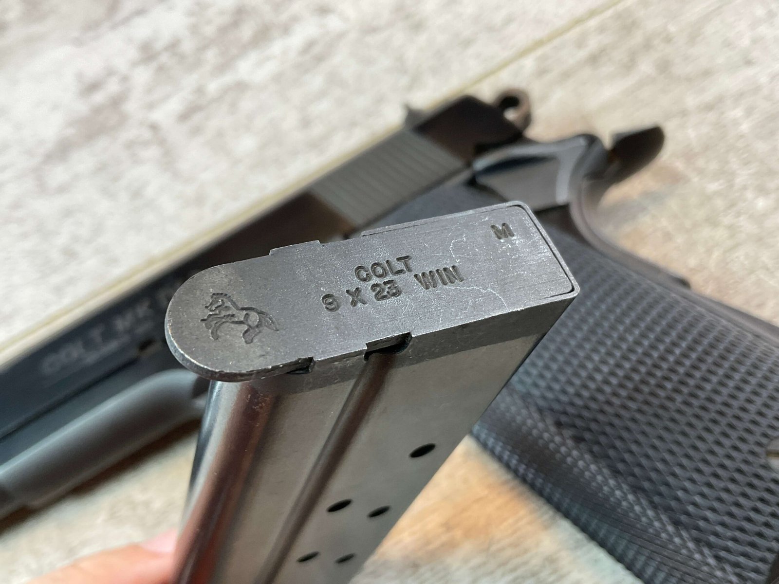 COLT GOVT MODEL 1911A1 MKIV SERIES 80 9X23 WIN SEMI AUTO PISTOL, JAMES EARL JONES COLLECTION #FR21185E, 5″ BARREL, EXC MIRROR BORE & RIFLING, 98% BLUE FINISH ON SLIDE & FRAME, EXC ONCE PIECE CHECKERED BLACK RUBBER GRIPS W/SILVER COLT MEDALLIONS, 2 – COLT 9X23 MAGAZINES, CRISP TRIGGER & TIGHT SLIDE, CONDITION AS SHOWN IN PICTURES, FROM THE JAMES EARL JONES “FAVORITES” COLLECTION W/ CERTIFICATE OF AUTHENTICITY.