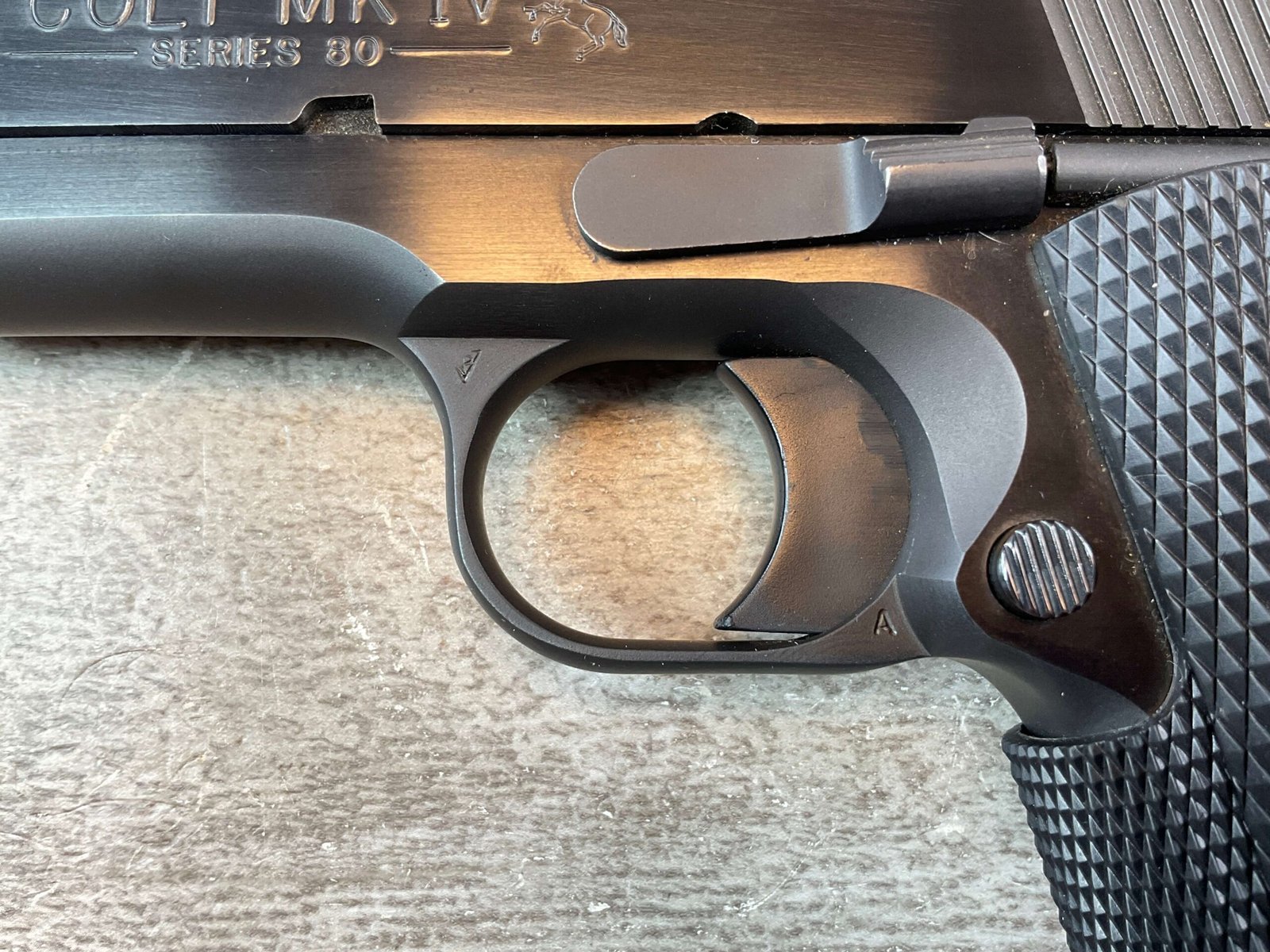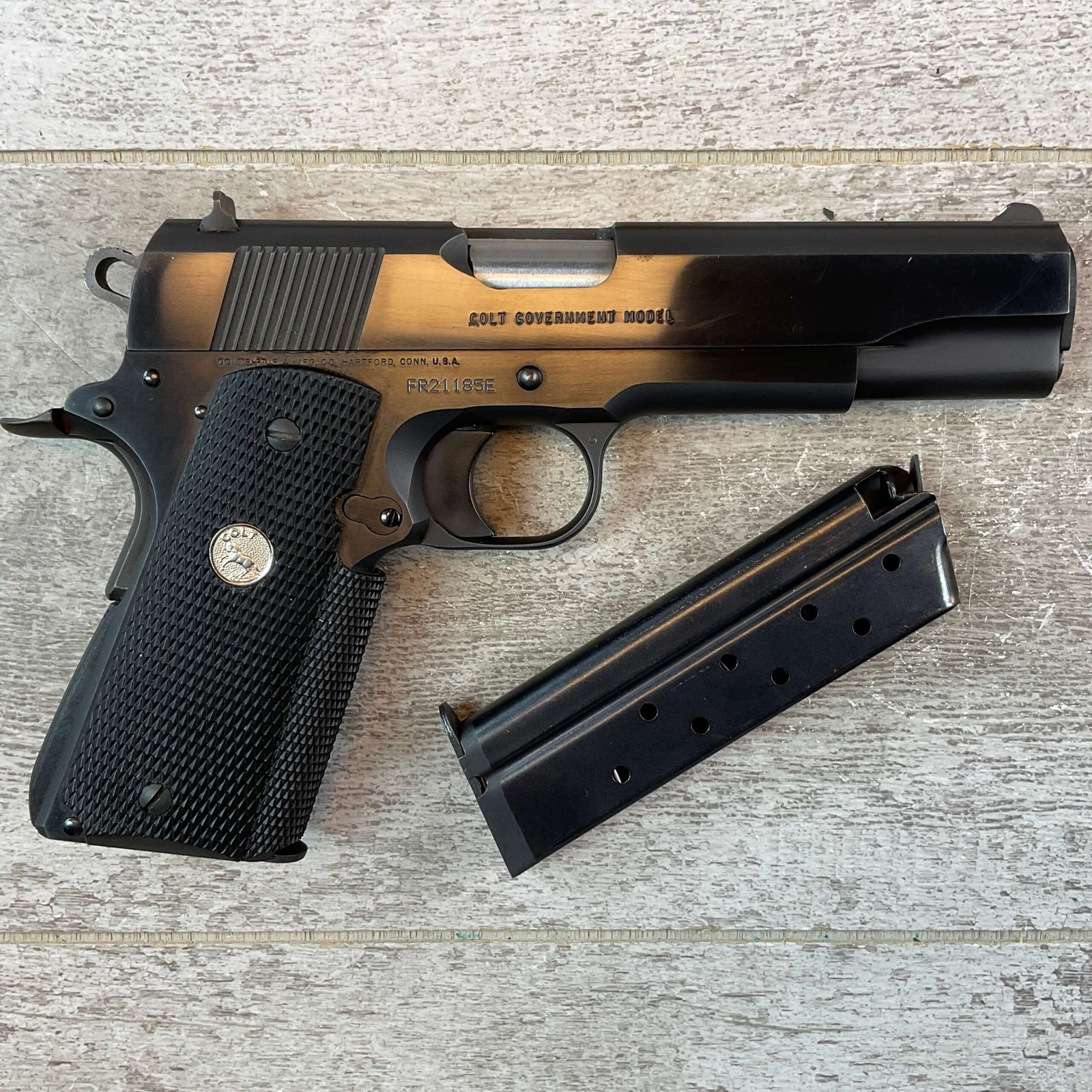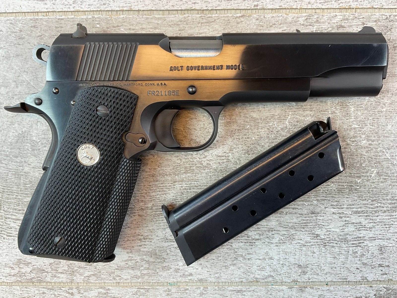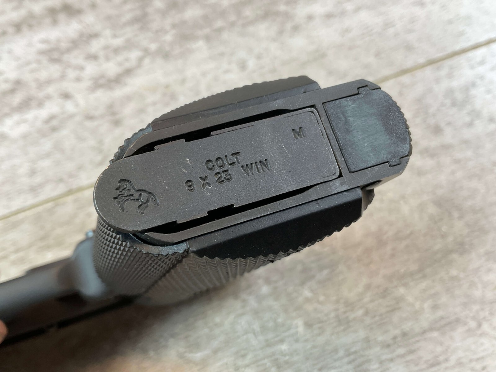 COLT GOVT MODEL 1911A1 MKIV SERIES 80 9X23 WIN SEMI AUTO PISTOL, JAMES EARL JONES COLLECTION #FR21185E, 5″ BARREL, EXC MIRROR BORE & RIFLING, 98% BLUE FINISH ON SLIDE & FRAME, EXC ONCE PIECE CHECKERED BLACK RUBBER GRIPS W/SILVER COLT MEDALLIONS, 2 – COLT 9X23 MAGAZINES, CRISP TRIGGER & TIGHT SLIDE, CONDITION AS SHOWN IN PICTURES, FROM THE JAMES EARL JONES “FAVORITES” COLLECTION W/ CERTIFICATE OF AUTHENTICITY.