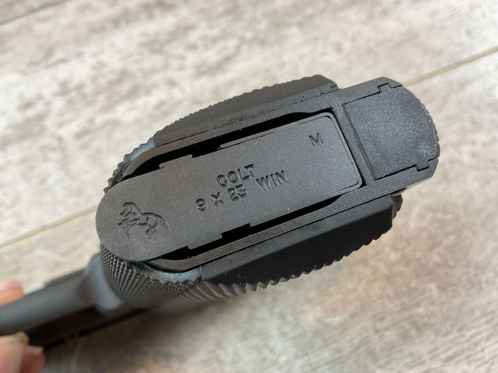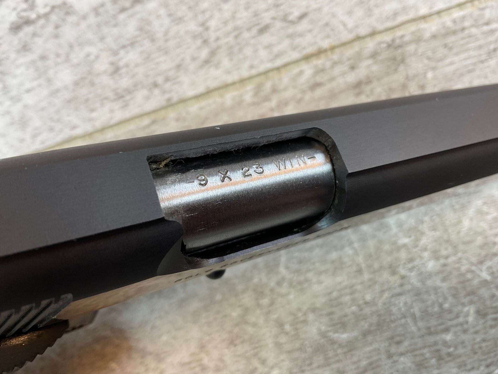 COLT GOVT MODEL 1911A1 MKIV SERIES 80 9X23 WIN SEMI AUTO PISTOL, JAMES EARL JONES COLLECTION #FR20543E, 5″ BARREL, EXC MIRROR BORE & RIFLING, 99%+ BLUE FINISH ON SLIDE & FRAME, EXC ONCE PIECE CHECKERED BLACK RUBBER GRIPS W/SILVER COLT MEDALLIONS, 2 – COLT 9X23 MAGAZINES, CRISP TRIGGER & TIGHT SLIDE, STILL HAD FACTORY GREASE ON SLIDE, DON’T THINK THIS ONE WAS EVER FIRED!! CONDITION AS SHOWN IN PICTURES, FROM THE JAMES EARL JONES “FAVORITES” COLLECTION W/ CERTIFICATE OF AUTHENTICITY.