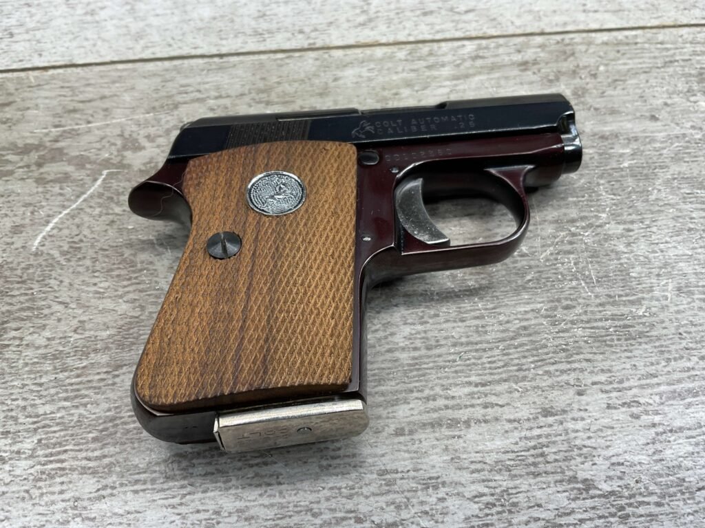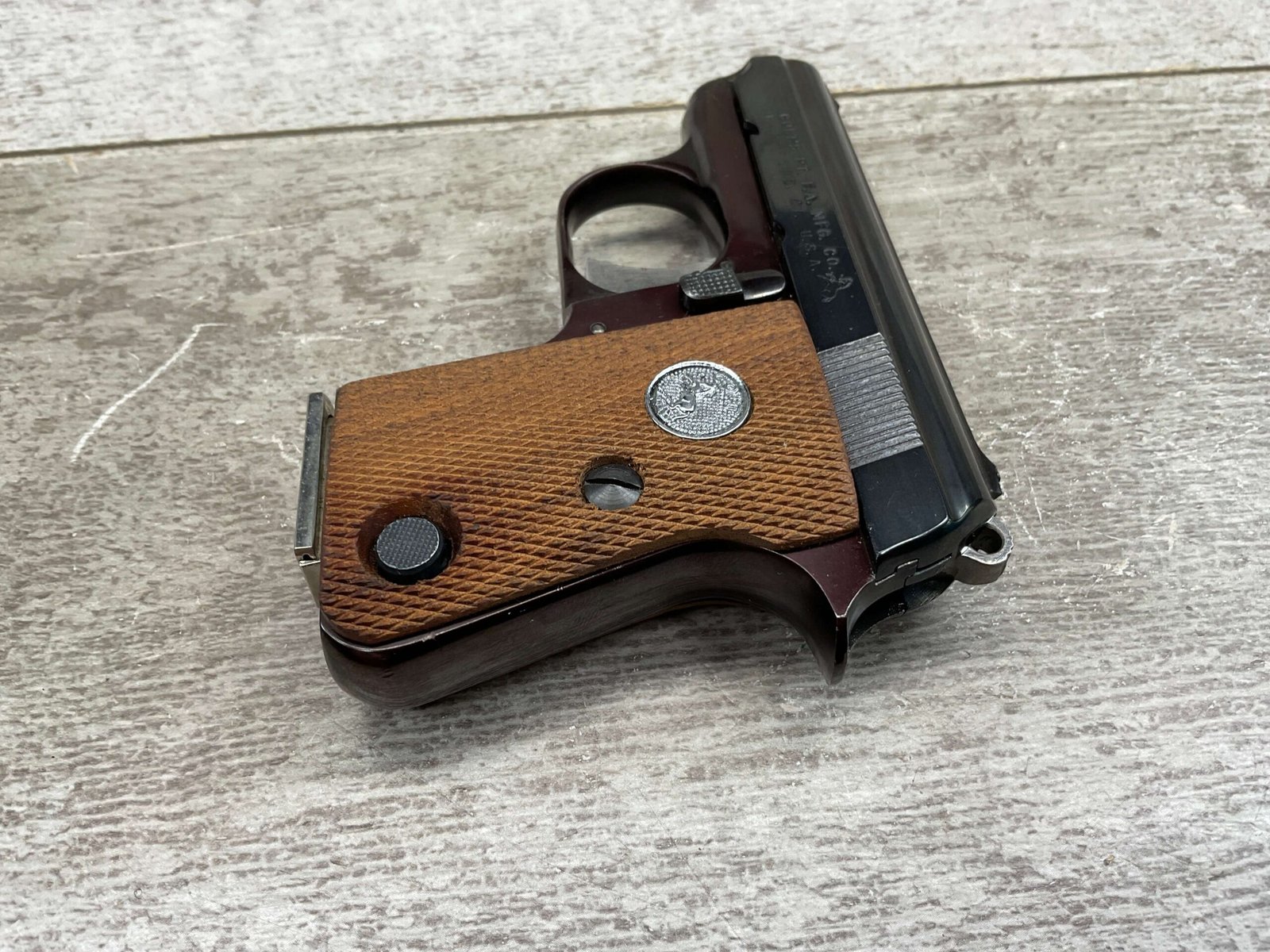 COLT JUNIOR POCKET AUTO .25 ACP PISTOL, MFR 1973, #OD102260, COMES W/ NICE BLACK LEATHER CLIP HOLSTER