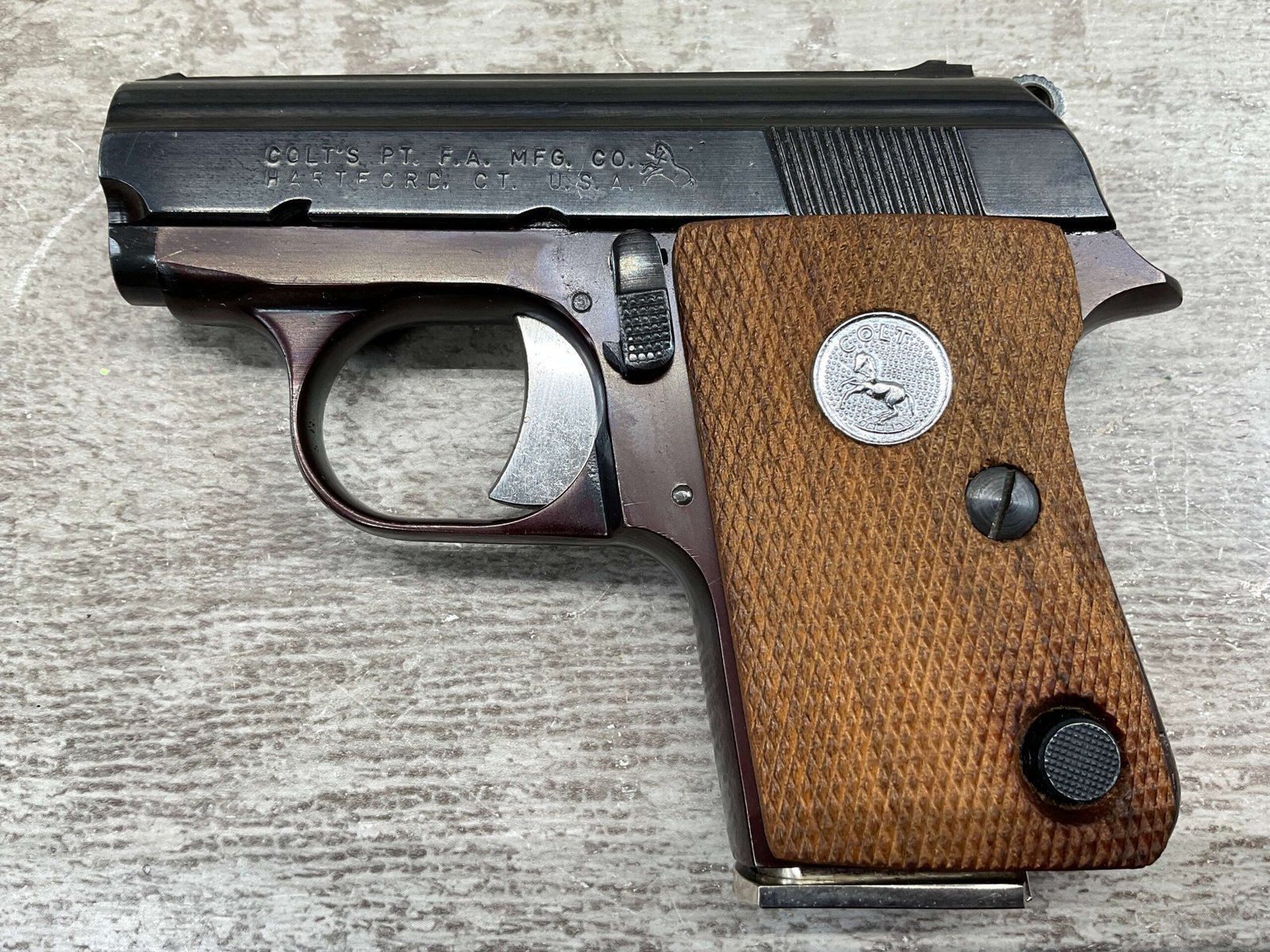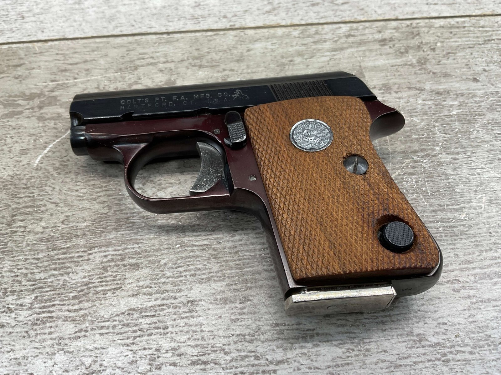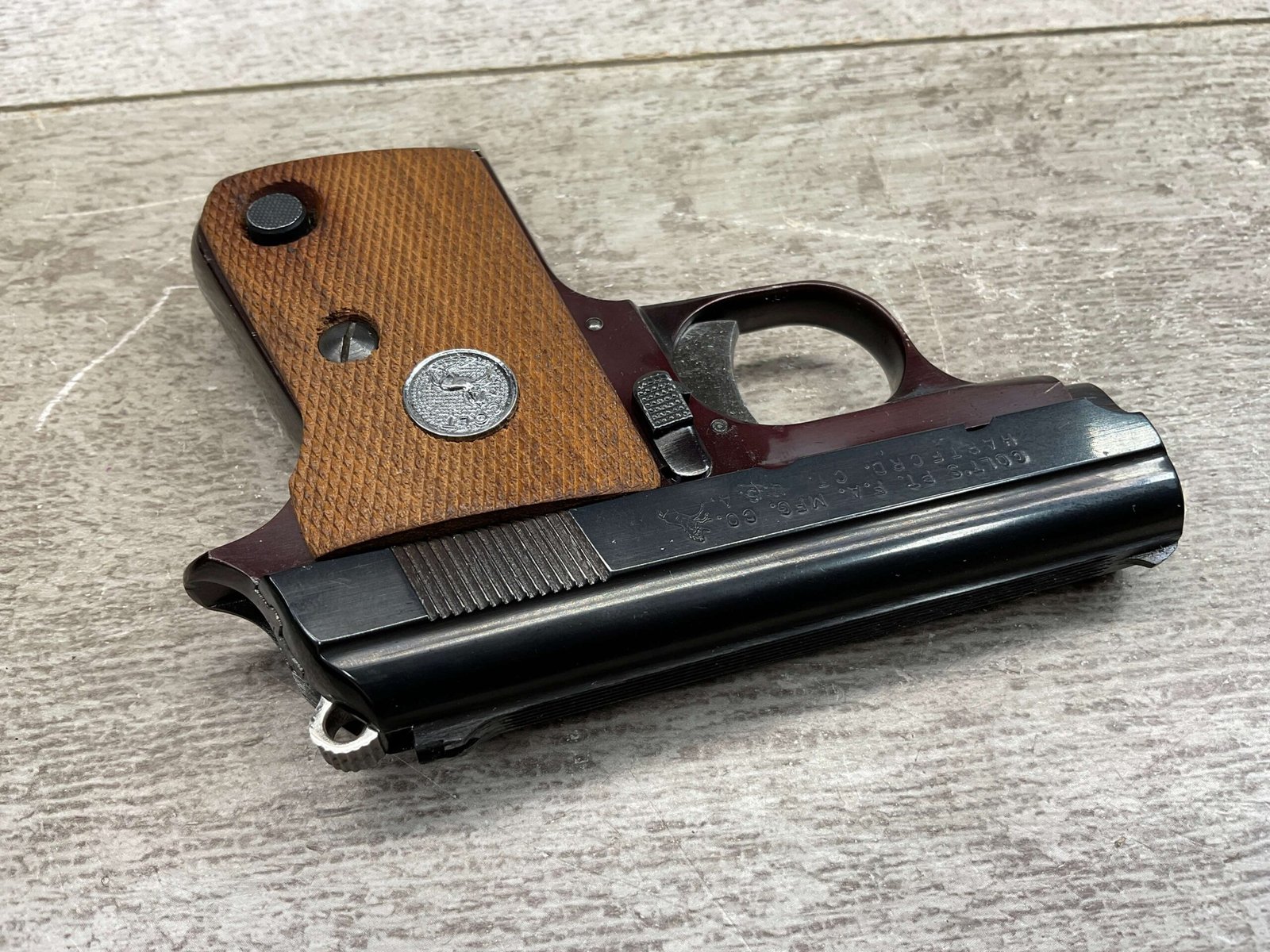 RIGHT SLIDE MARKED “COLT AUTOMATIC” OVER “CALIBER .25” WITH COLT LOGO NEXT TO LETTERS, NEAR RIGHT SIDE TRIGGER MARKED “0D102260”, LEFT SLIDE OF PISTOL MARKED “COLT’S PT. F.A. MFG. CO.” OVER “HARTFORD. CT. U.S.A.” WITH COLT LOGO NEXT TO LETTERS, BOTTOM OF MAG MARKED “CAL. .25 / COLT”, EXCELLENT MINT BORE AND RIFLING, EXCELLENT ORIGINAL BLUE, 98%+