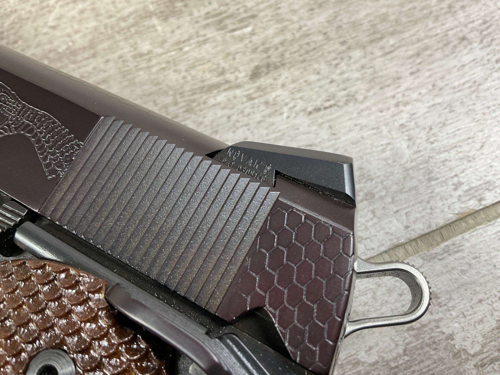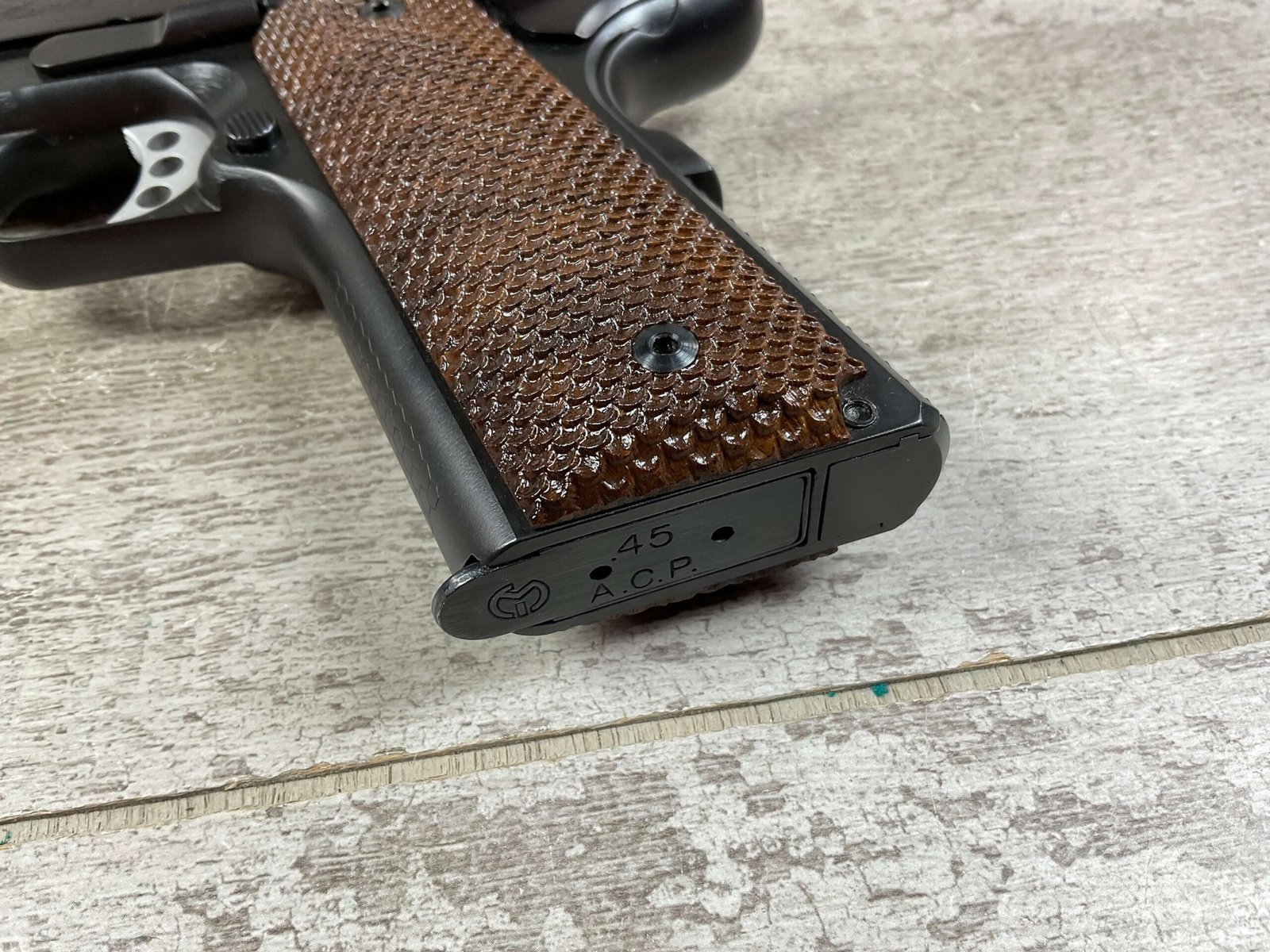 COLT / KASE REEDER CUSTOM COMBAT COMMANDER “BLACK MAMBA” 45ACP SEMI AUTO PISTOL, JAMES EARL JONES COLLECTION #FC07782 (1984 MFR), KASE REEDER CUSTOM BUILT ON COLT COMBAT COMMANDER FRAME, EXCELLENT LIKE NEW CONDITION, MIRROR BORE & LIKE NEW FINISH, BEAUTIFUL FINISH, “SCALE” TEXTURES CUSTOM GRIPS, CRISP TRIGGER, VERY CUSTOM! CONDITION AS SHOWN IN PICTURES, FROM THE JAMES EARL JONES “FAVORITES” COLLECTION W/ CERTIFICATE OF AUTHENTICITY.
