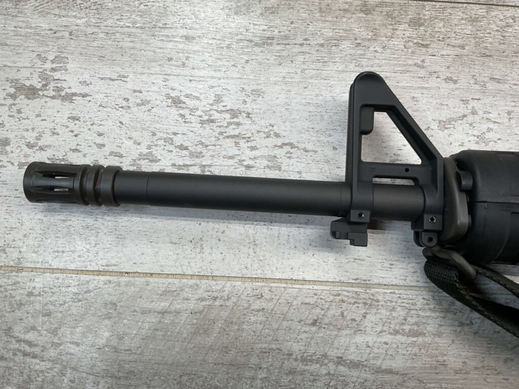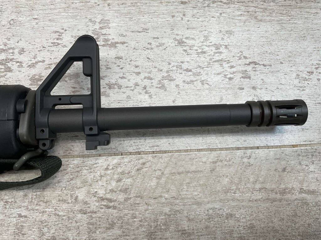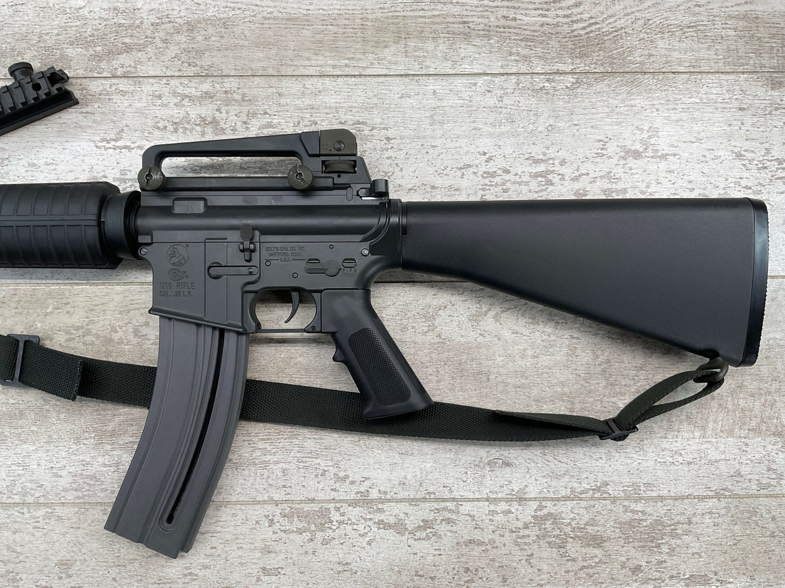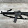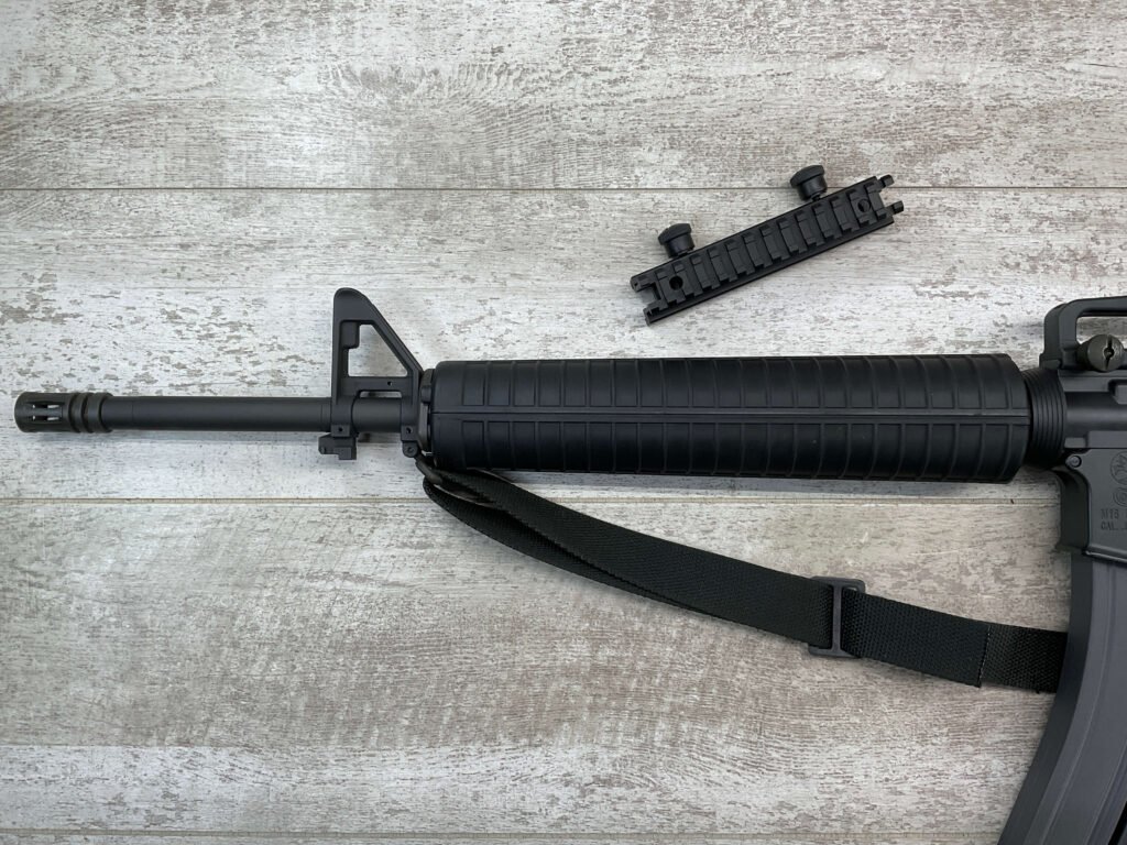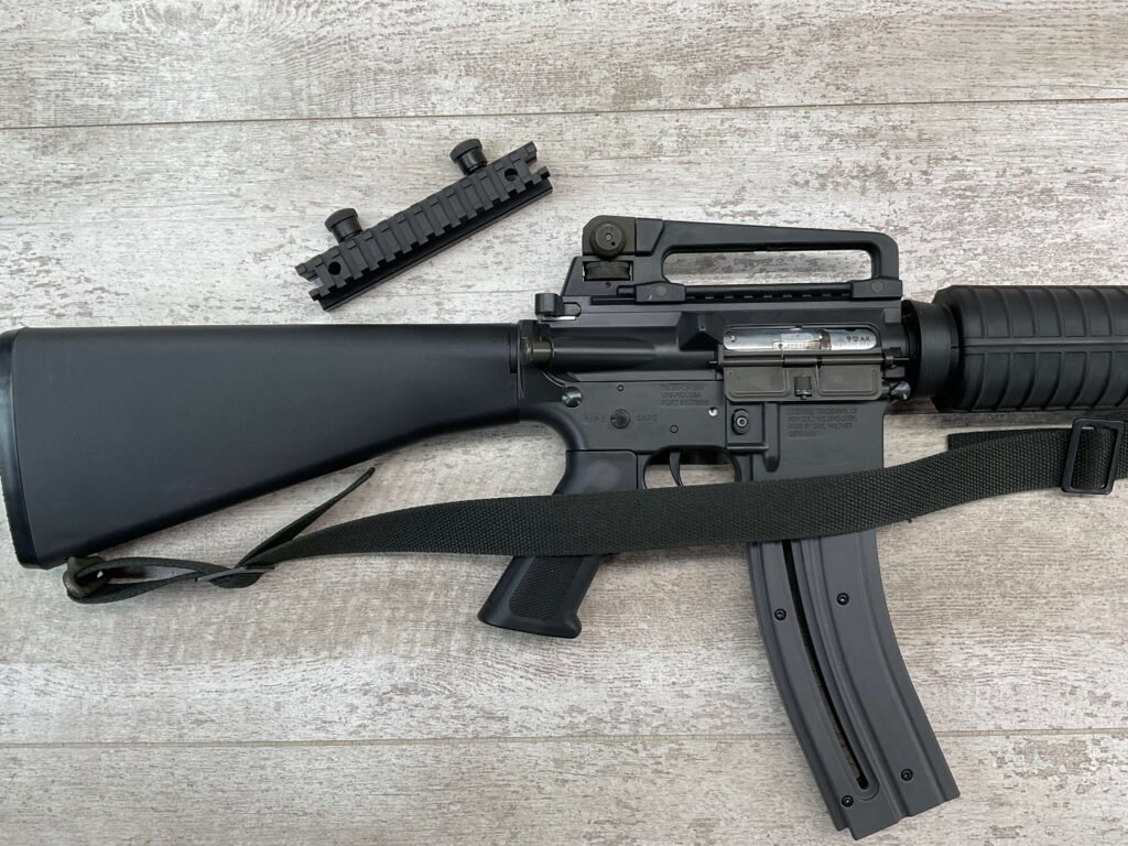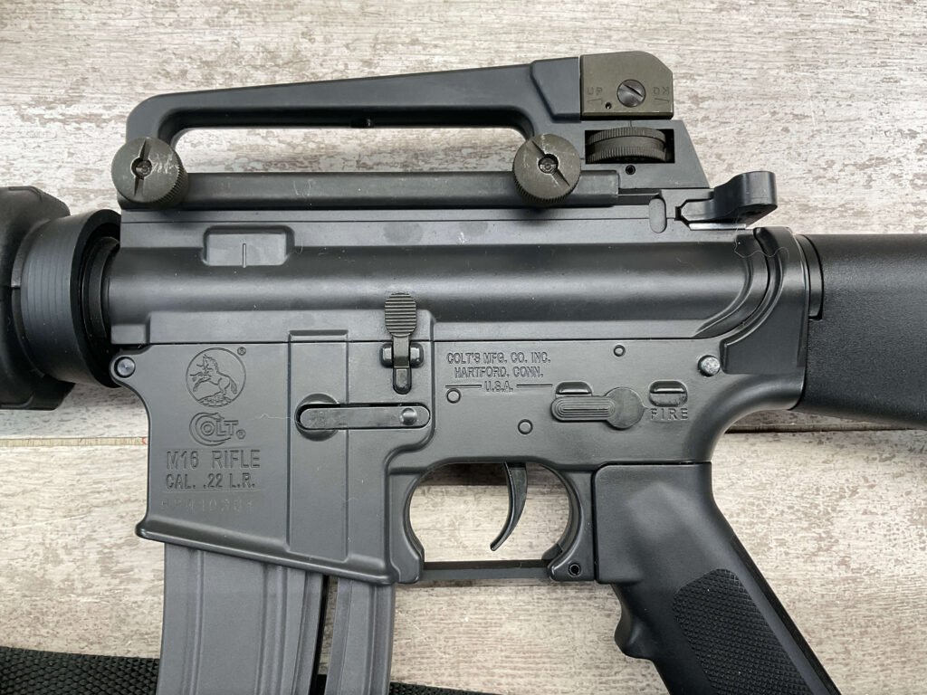 COLT M16 .22LR SPORTER SEMI AUTO RIFLE, MINTY #BP010304, SPORTER, 21.5″ BBL, A2 ADJUSTABLE SIGHTS W/REMOVABLE CARRY HANDLE & REMOVABLE SCOPE MOUNT, BAYONET LUG, BIRD CAGE FLASH HIDER, CANVAS SLING, 1 FACTORY 30 ROUND MAGAZINE INCLUDED (MORE AVAILABLE), EXC BRIGHT BORE & RIFLING, 98+% OVERALL