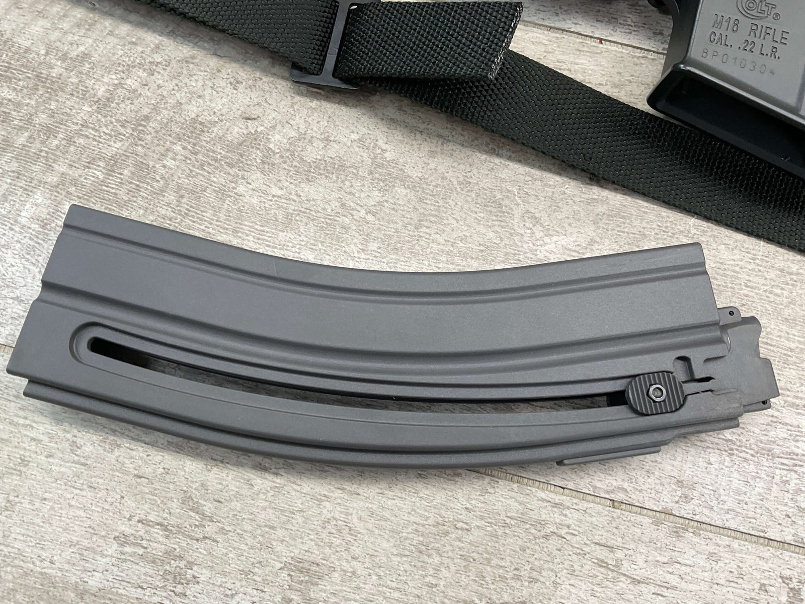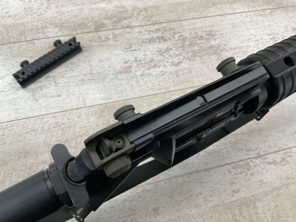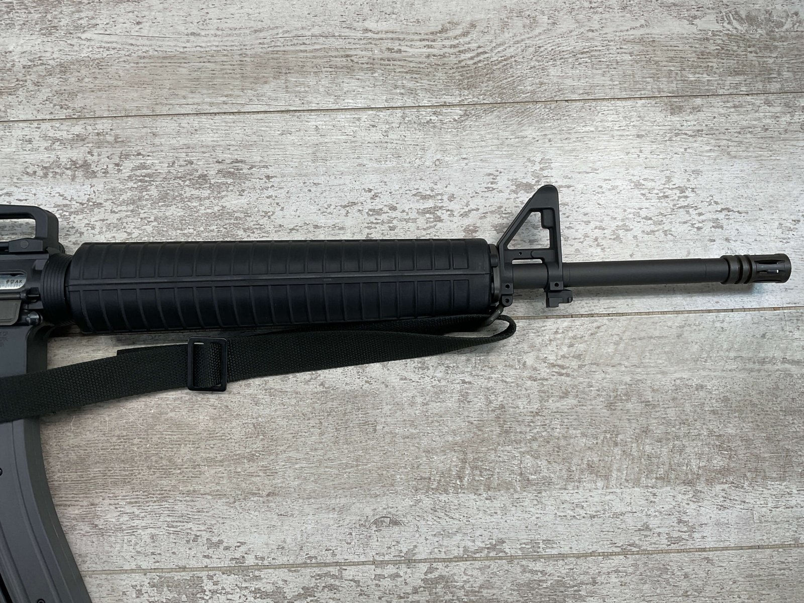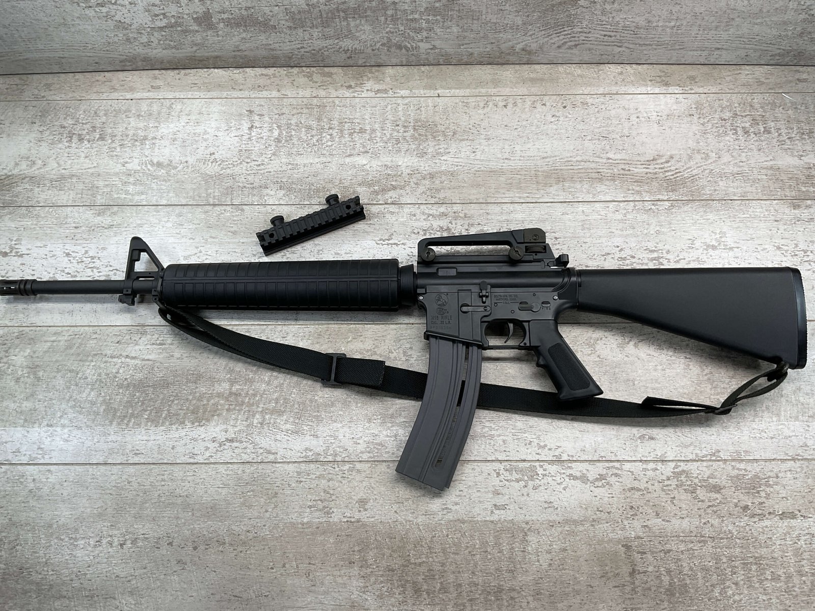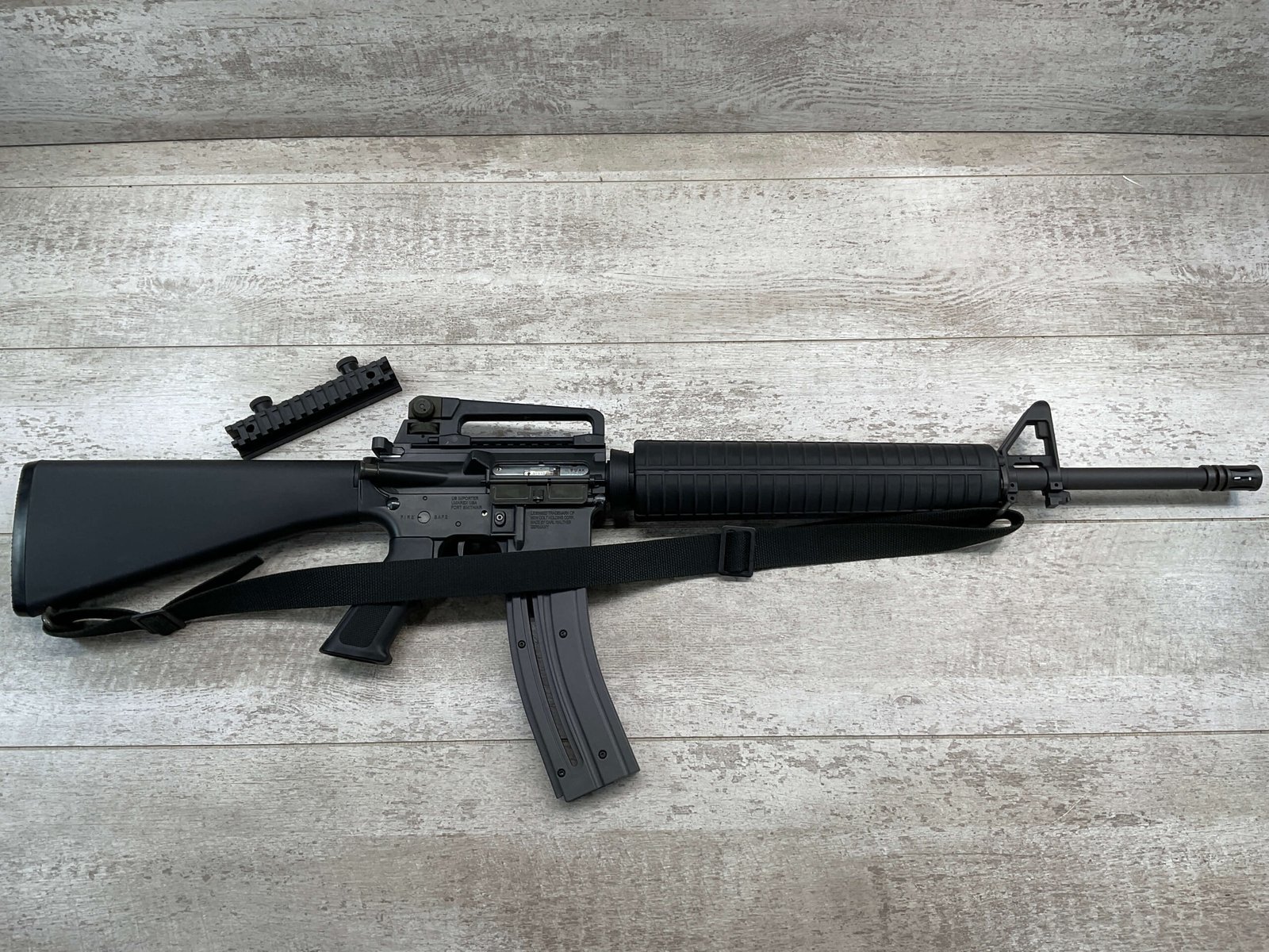 COLT M16 .22LR SPORTER SEMI AUTO RIFLE, MINTY #BP010304, SPORTER, 21.5″ BBL, A2 ADJUSTABLE SIGHTS W/REMOVABLE CARRY HANDLE & REMOVABLE SCOPE MOUNT, BAYONET LUG, BIRD CAGE FLASH HIDER, CANVAS SLING, 1 FACTORY 30 ROUND MAGAZINE INCLUDED (MORE AVAILABLE), EXC BRIGHT BORE & RIFLING, 98+% OVERALL
