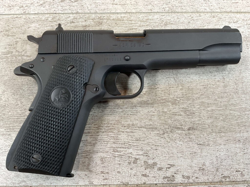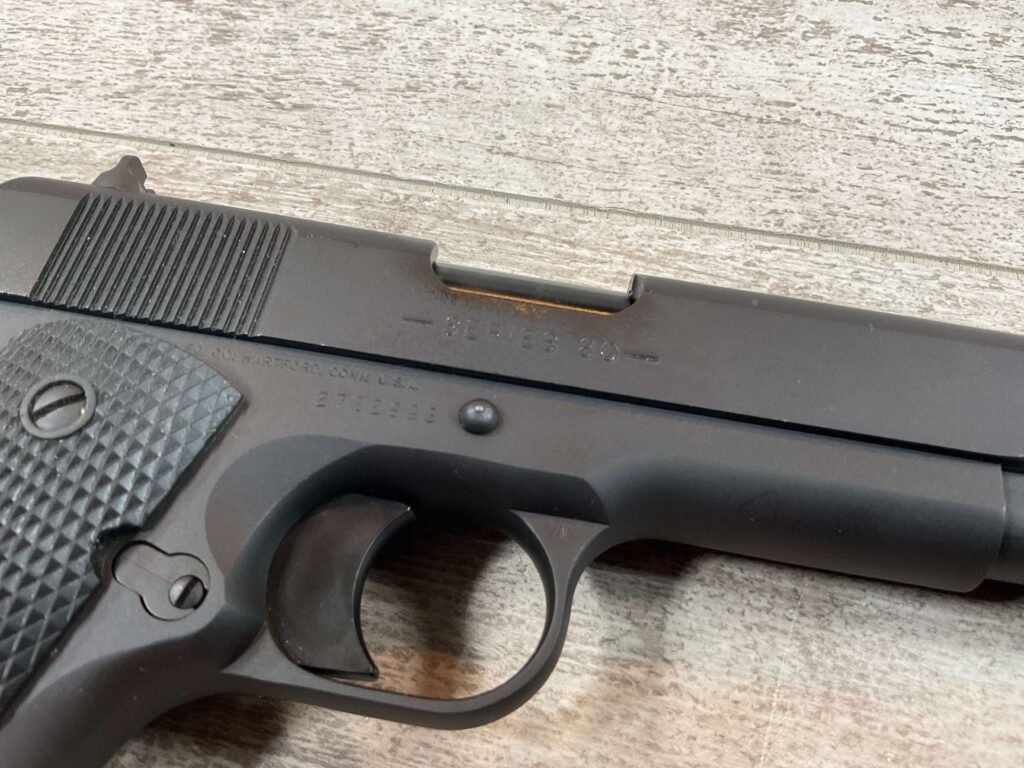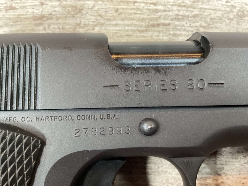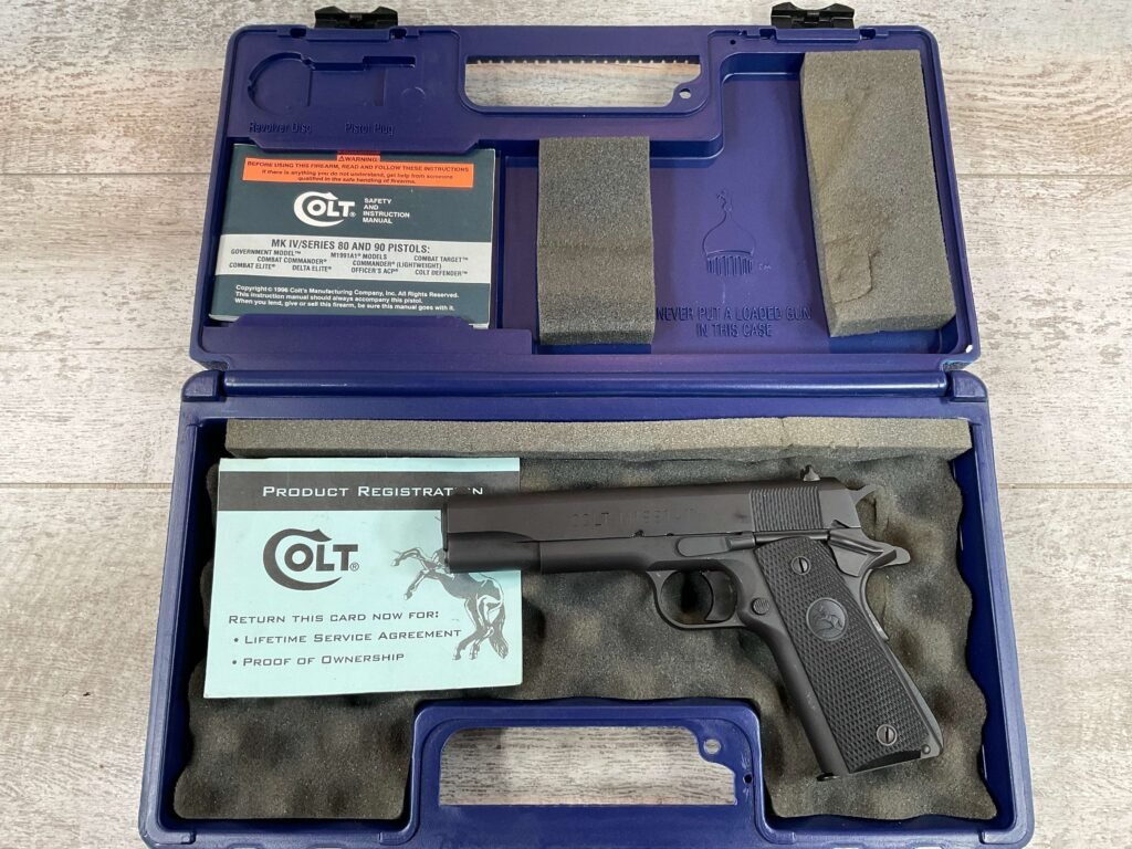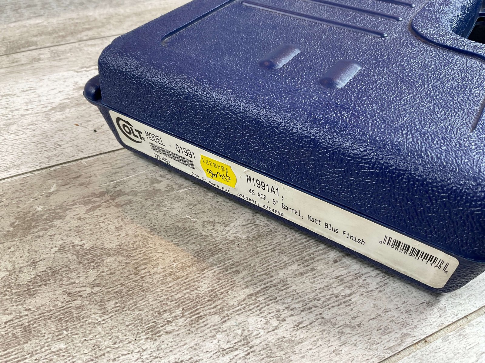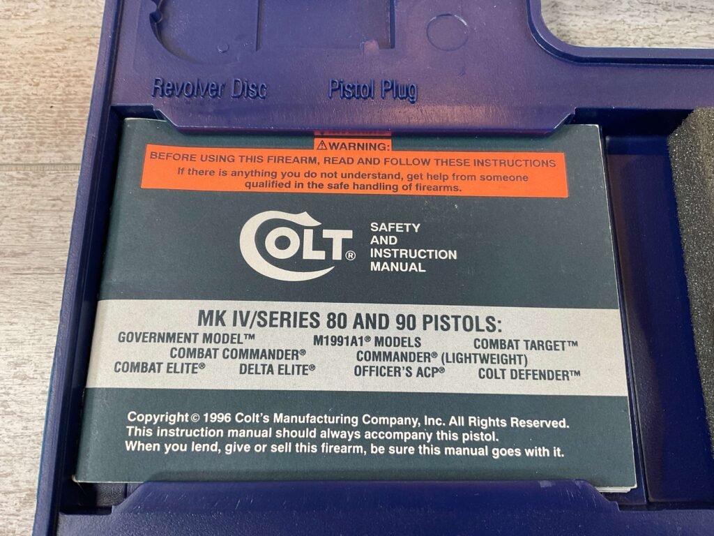 COLT M1991A1 .45ACP SERIES 80 PISTOL #2782993 FACTORY COLT BLUE PLASTIC CASE, USER MANUAL AND COLT LISTERATURE, 1 ORIGINAL COLT SINGLE STACK MAGAZINE, SHOWS VERY LITTLE WEAR (SEE PHOTOS), 95+% OVERALL