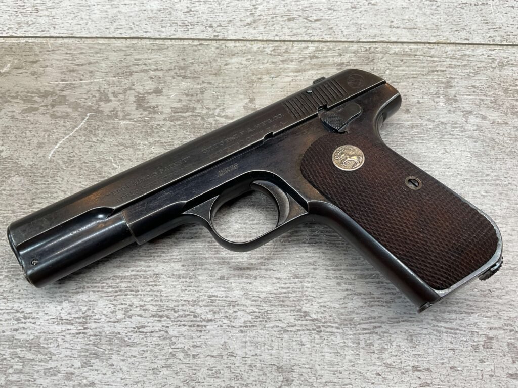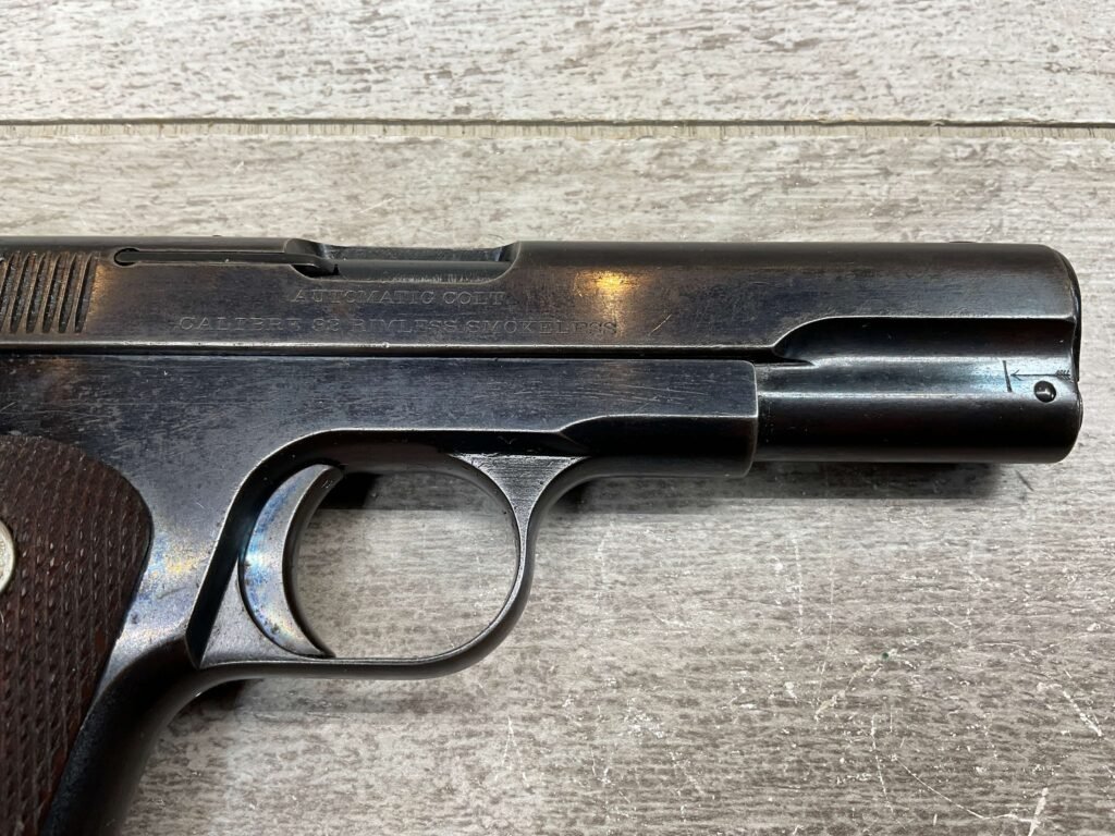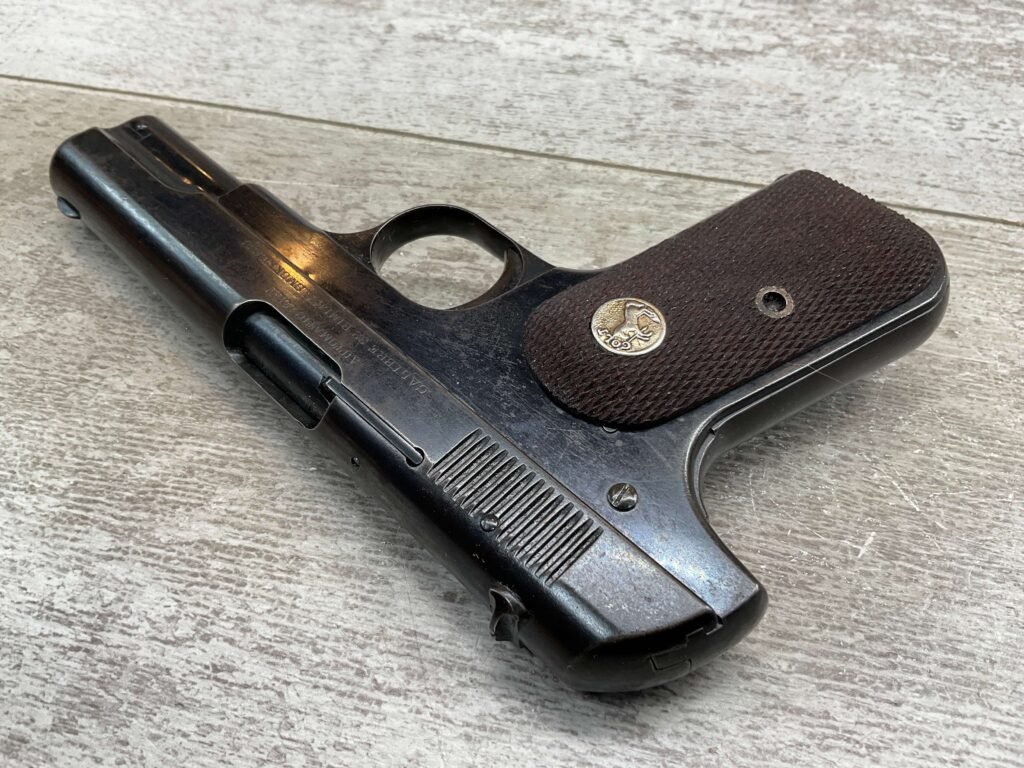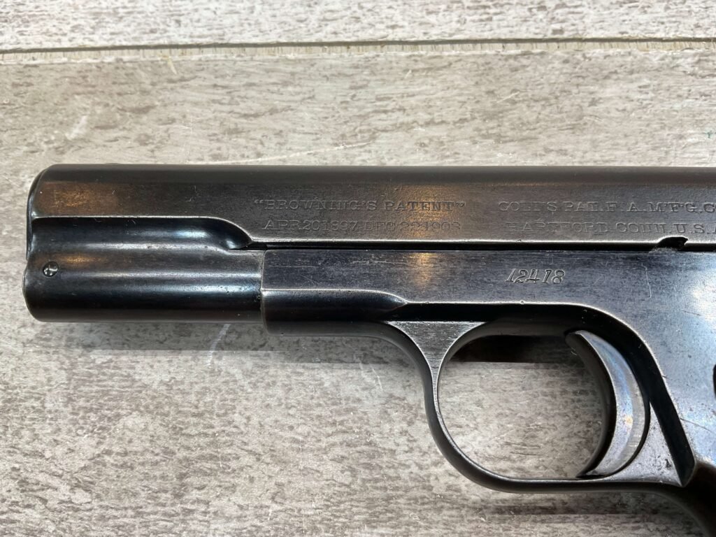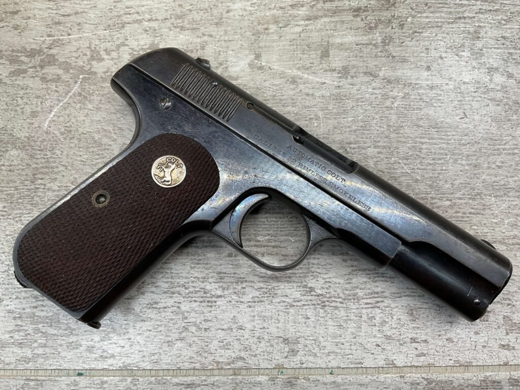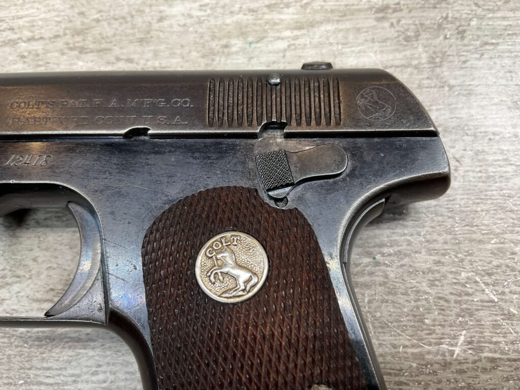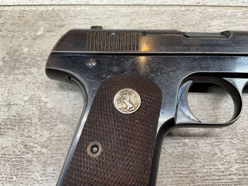 COLT MODEL 1903 HAMMERLESS .32 ACP SEMI AUTO PISTOL, 1904 MFR #12418, 90+% BLUE W/LIGHT HIGH EDGE WEAR & SPECKLING IN AREAS, VG/EXC BRIGHT BORE & EXC STRONG RIFLING, 3.75″ BBL, VG-EXC CHECKERED WALNUT GRIPS W/MEDALLION, 1 FACTORY MAGAZINE UNMARKED, EXC OVERALL & HARD TO FIND IN THIS CONDITION!!