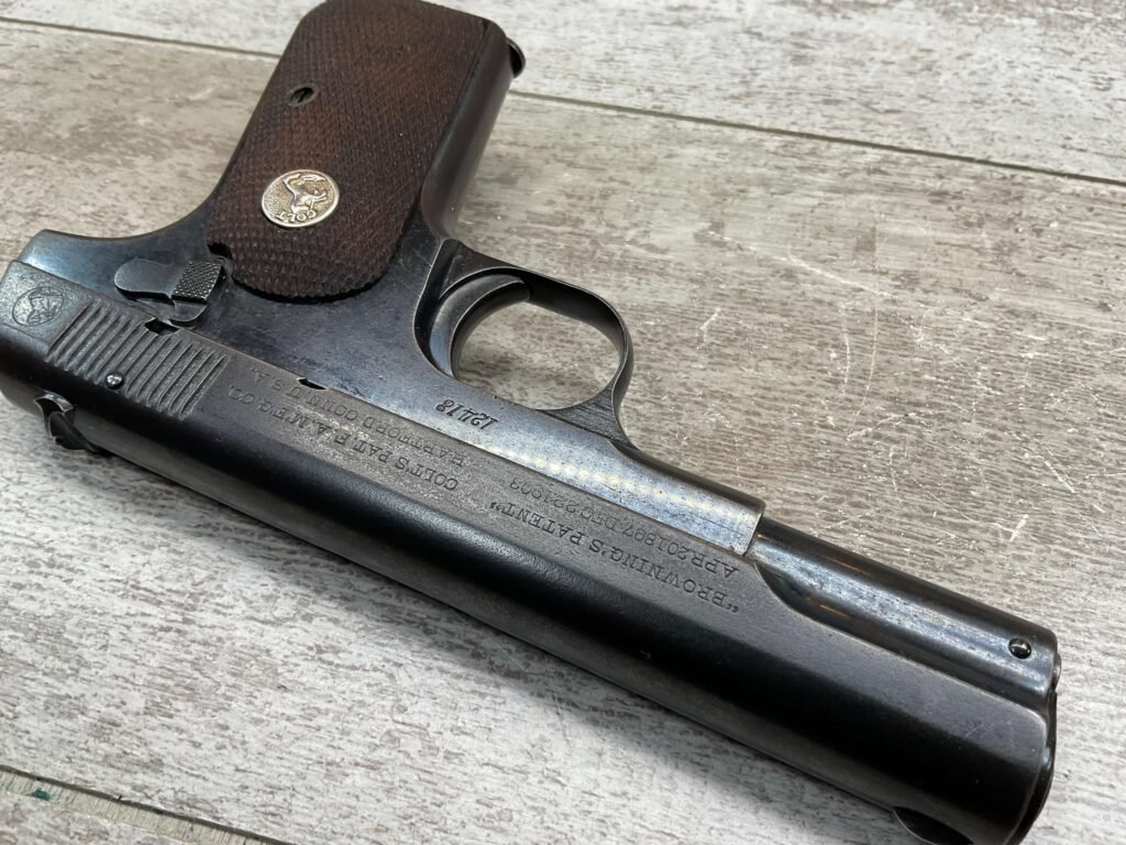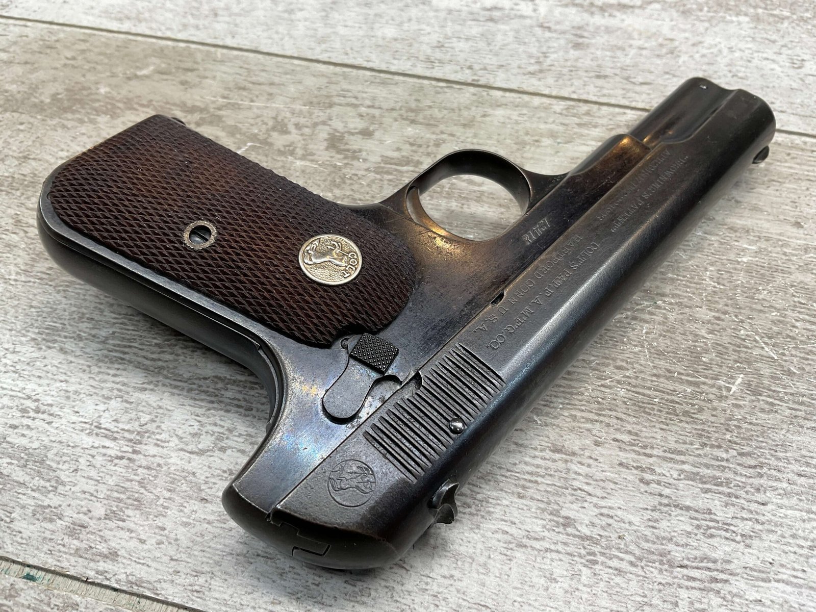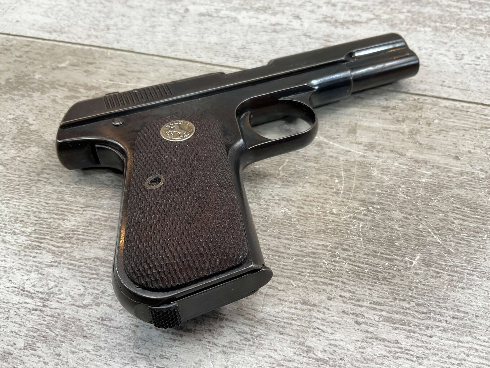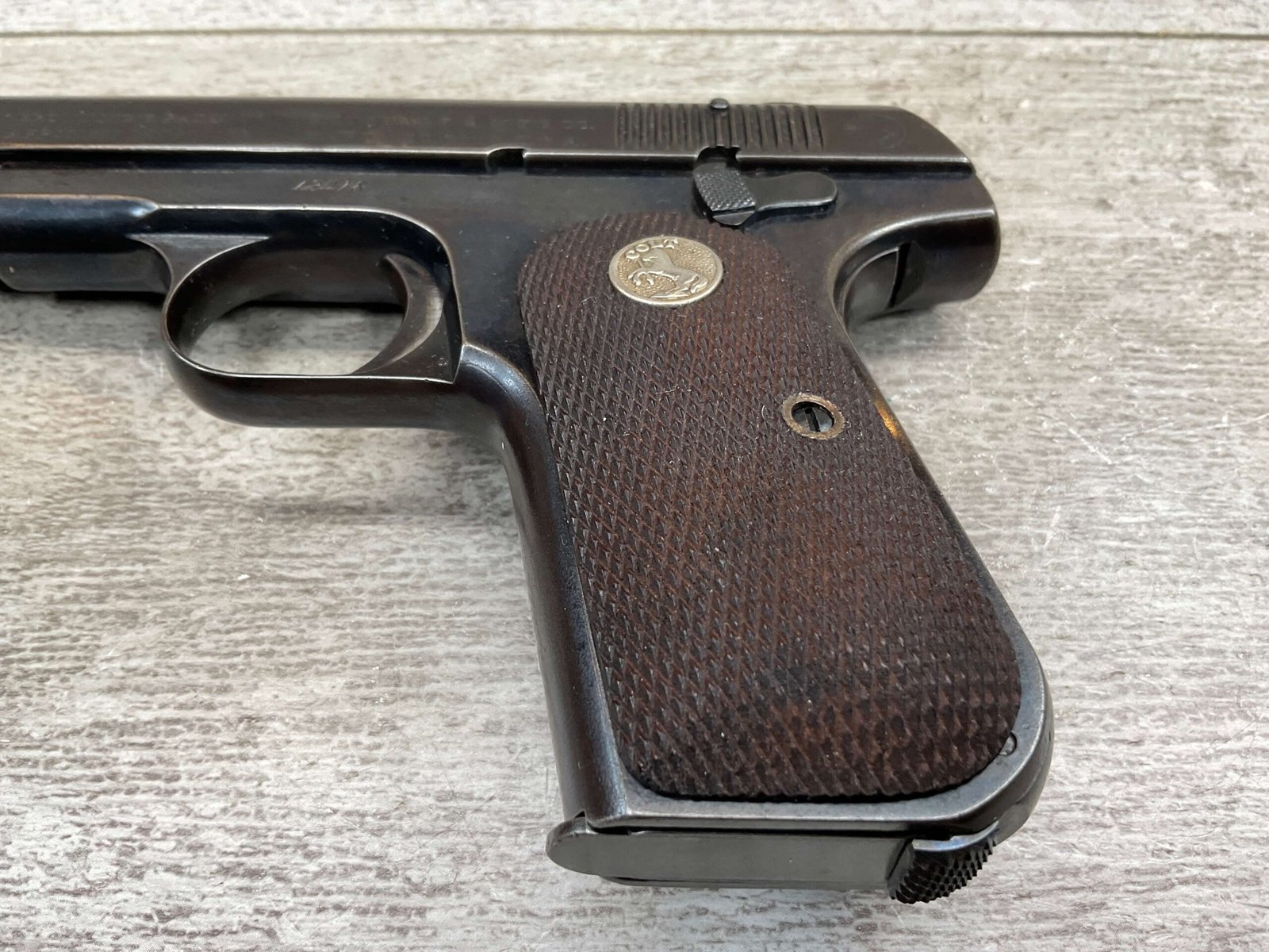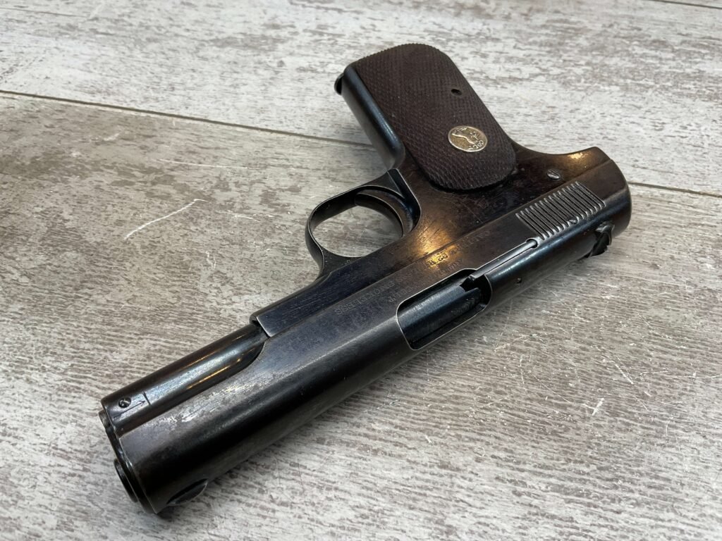 COLT MODEL 1903 HAMMERLESS .32 ACP SEMI AUTO PISTOL, 1904 MFR #12418, 90+% BLUE W/LIGHT HIGH EDGE WEAR & SPECKLING IN AREAS, VG/EXC BRIGHT BORE & EXC STRONG RIFLING, 3.75″ BBL, VG-EXC CHECKERED WALNUT GRIPS W/MEDALLION, 1 FACTORY MAGAZINE UNMARKED, EXC OVERALL & HARD TO FIND IN THIS CONDITION!!