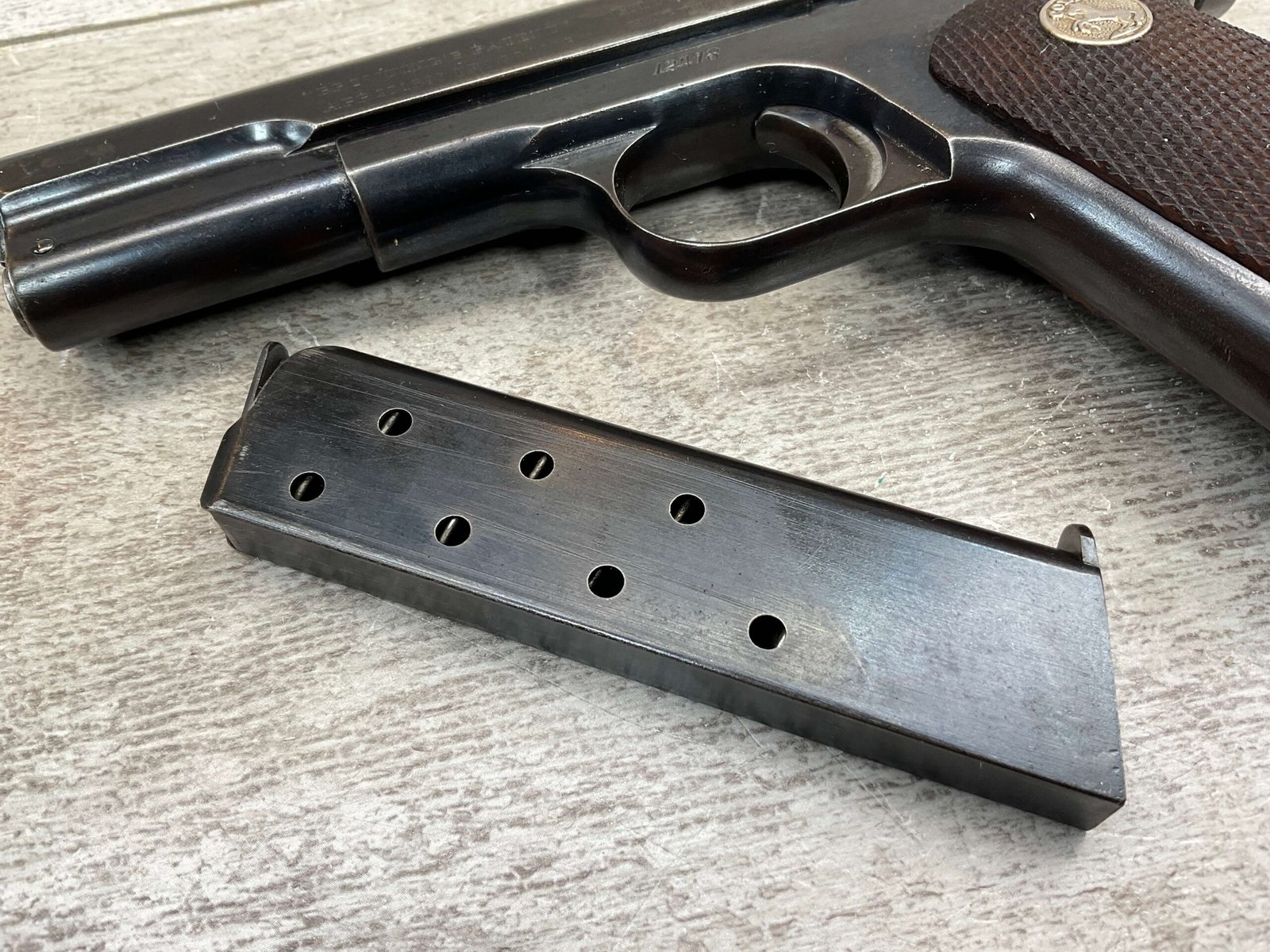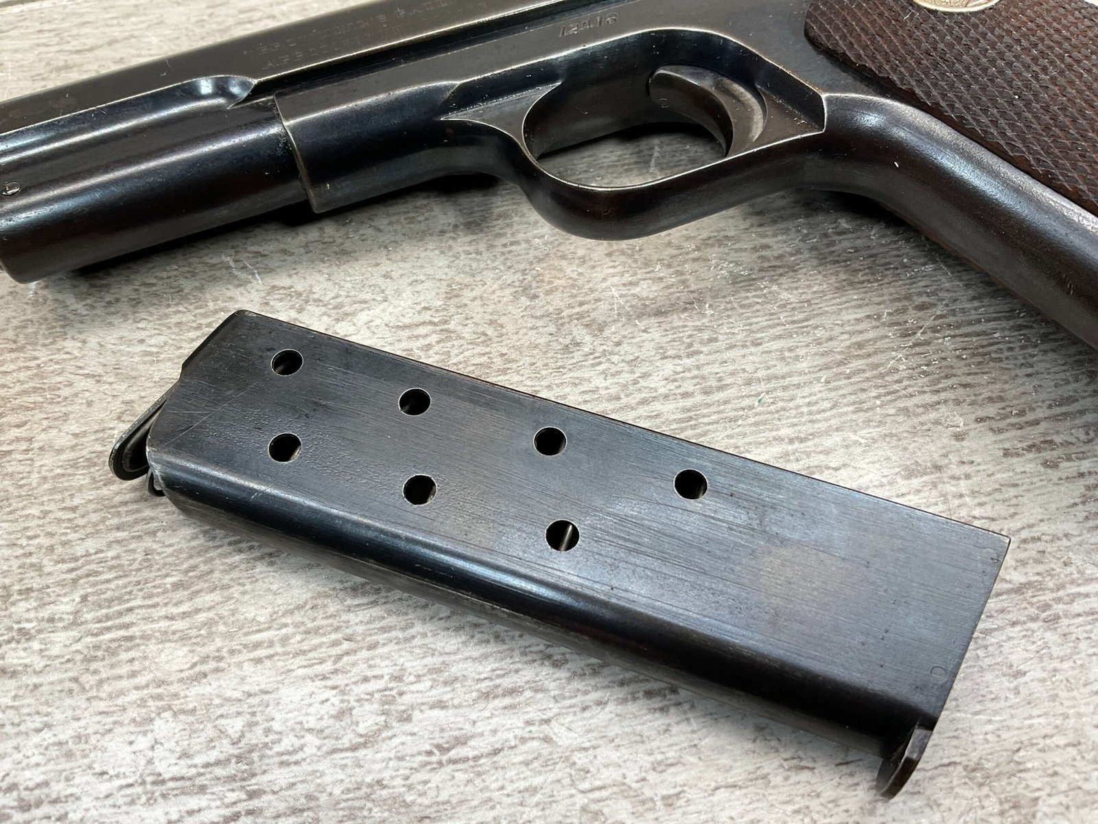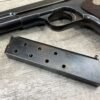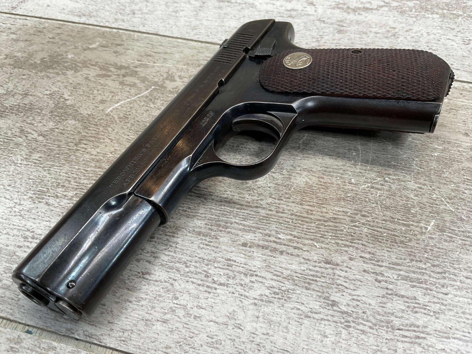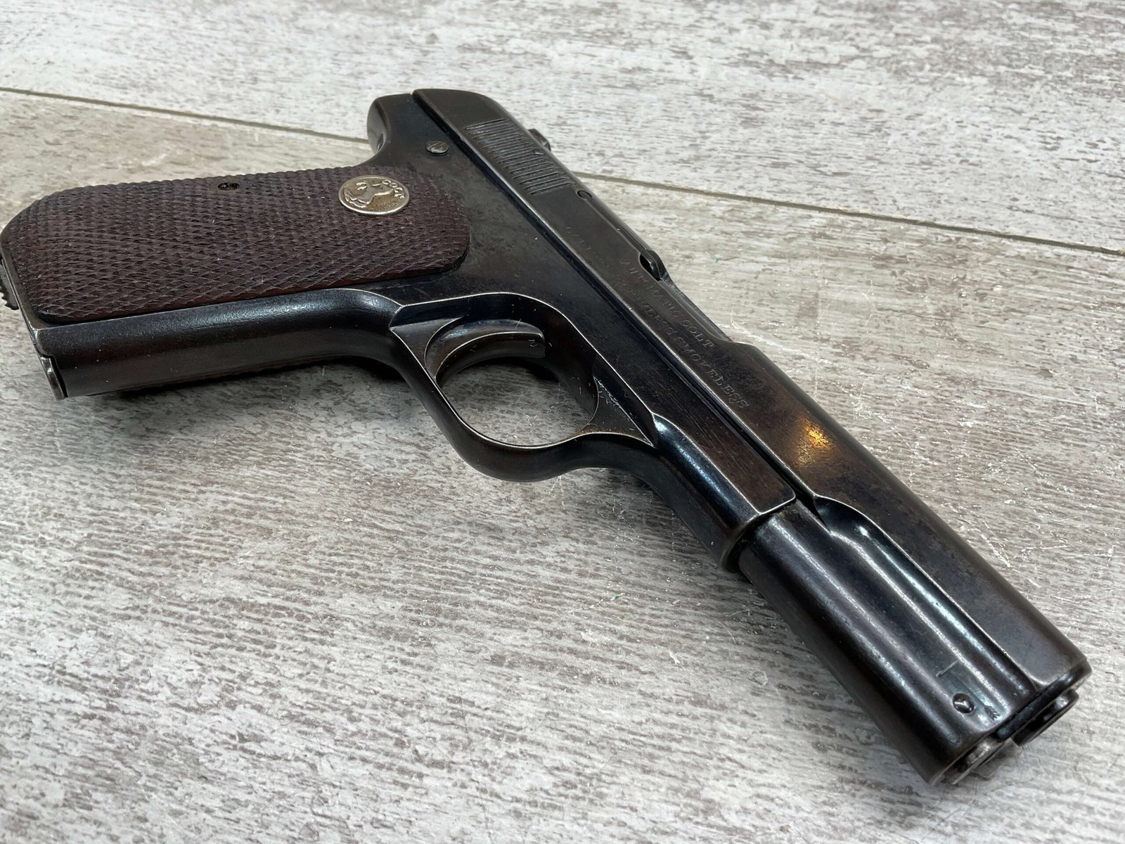 COLT MODEL 1903 HAMMERLESS .32 ACP SEMI AUTO PISTOL, 1904 MFR #12418, 90+% BLUE W/LIGHT HIGH EDGE WEAR & SPECKLING IN AREAS, VG/EXC BRIGHT BORE & EXC STRONG RIFLING, 3.75″ BBL, VG-EXC CHECKERED WALNUT GRIPS W/MEDALLION, 1 FACTORY MAGAZINE UNMARKED, EXC OVERALL & HARD TO FIND IN THIS CONDITION!!