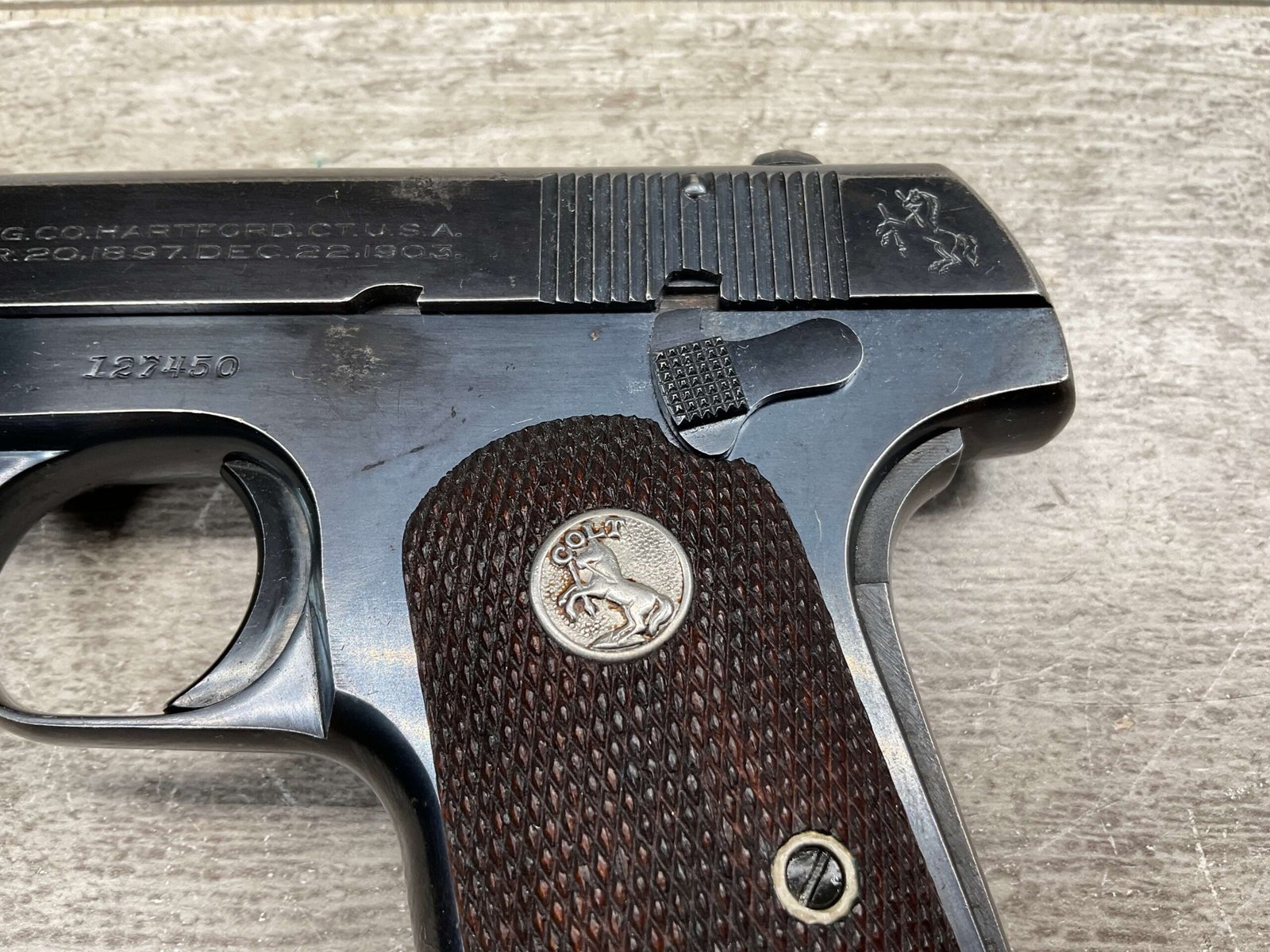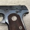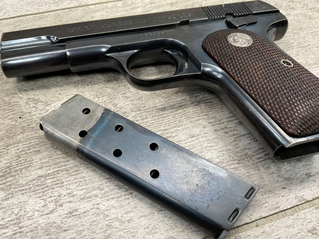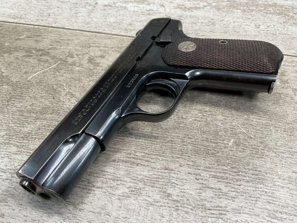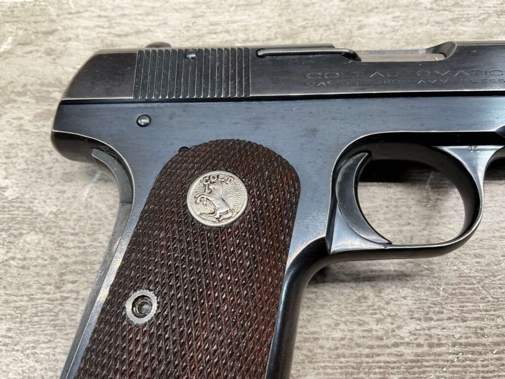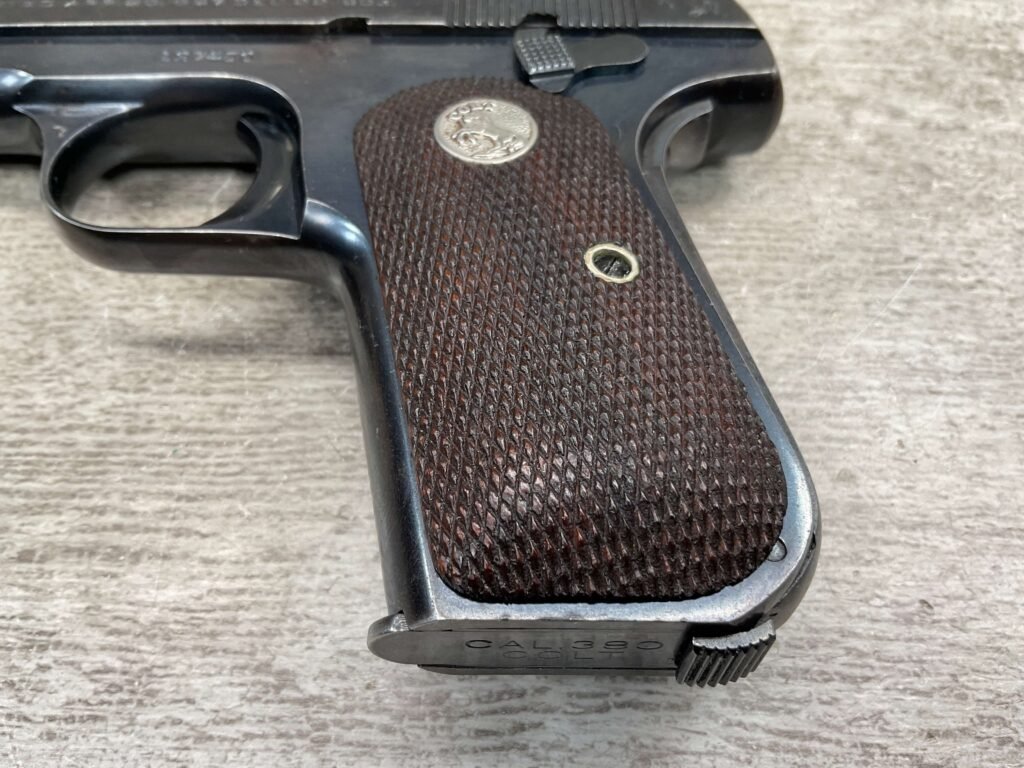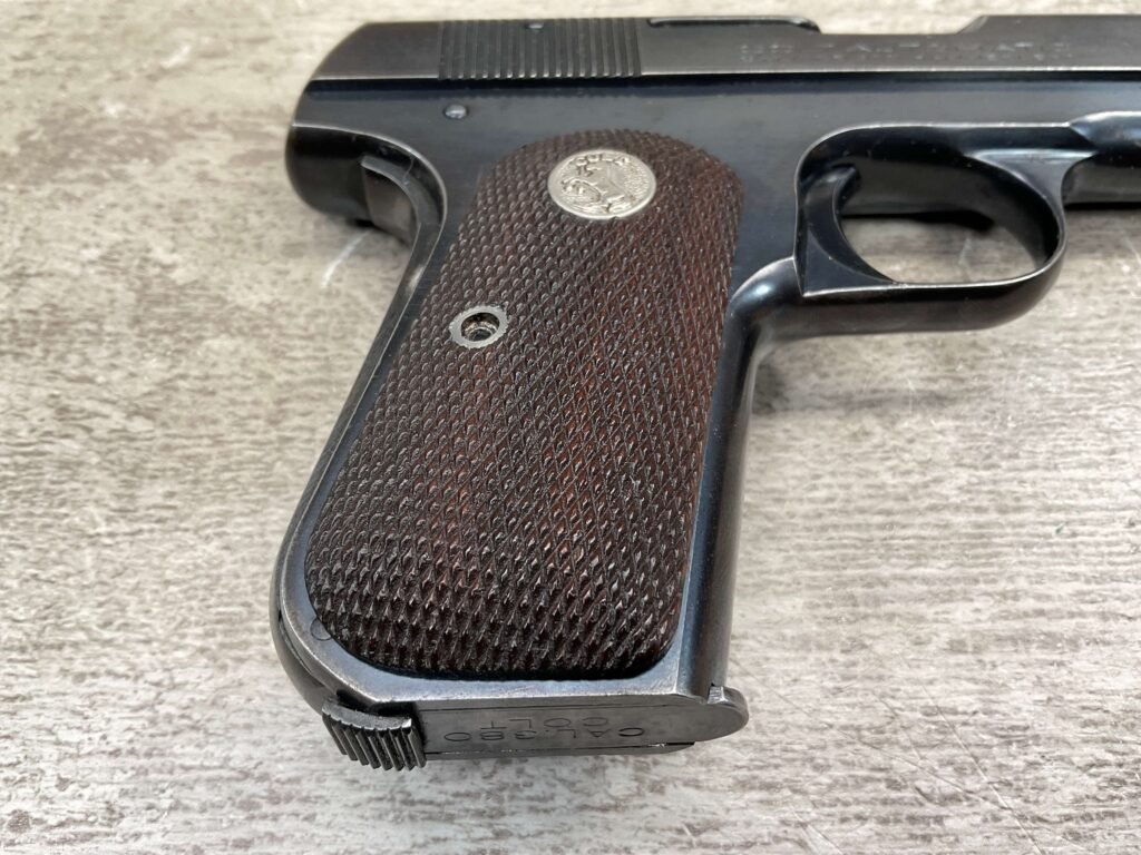 COLT MODEL 1908 HAMMERLESS .380CAL SEMI AUTO PISTOL, 1937 MFR #127450, 94+% BLUE W/LIGHT HIGH EDGE WEAR, VG/EXC BORE & RIFLING W/VERY LIGHT OXIDATION IN GROOVES, 3.75″ BBL, VG-EXC CHECKERED WALNUT GRIPS W/MEDALLION, 1 FACTORY MAGAZINE MARKED “CAL .380/COLT”, EXC OVERALL & HARD TO FIND IN THIS CONDITION!!