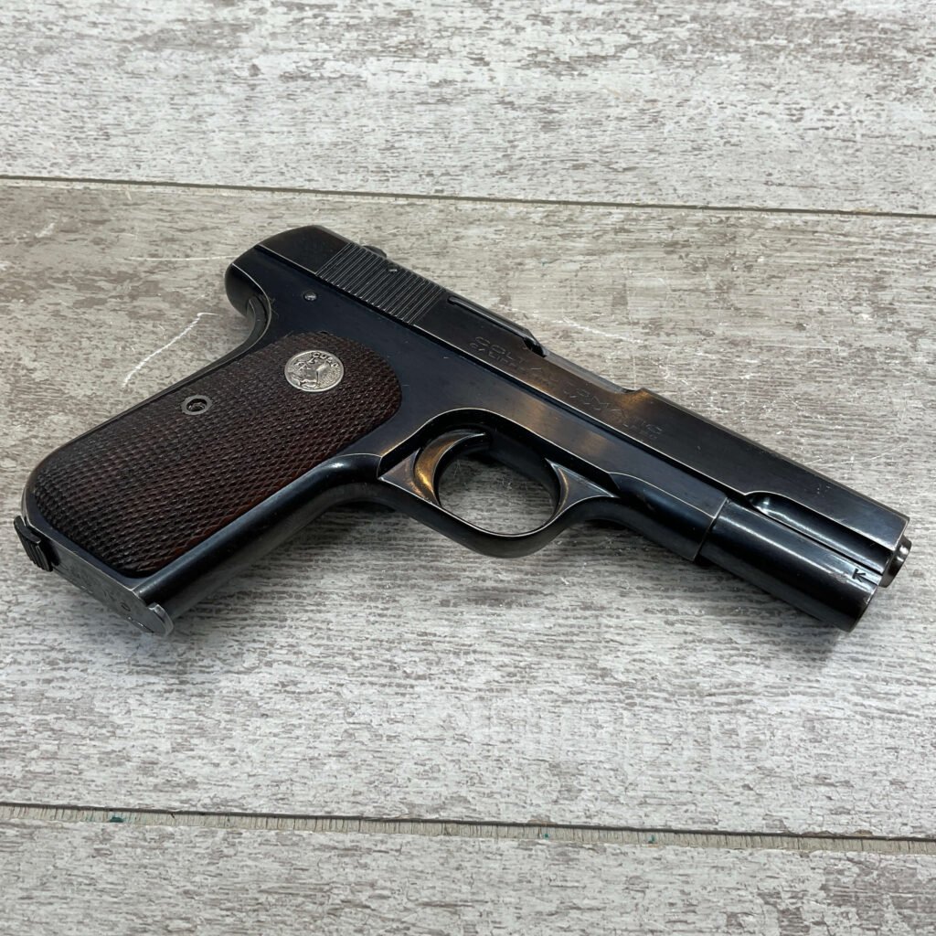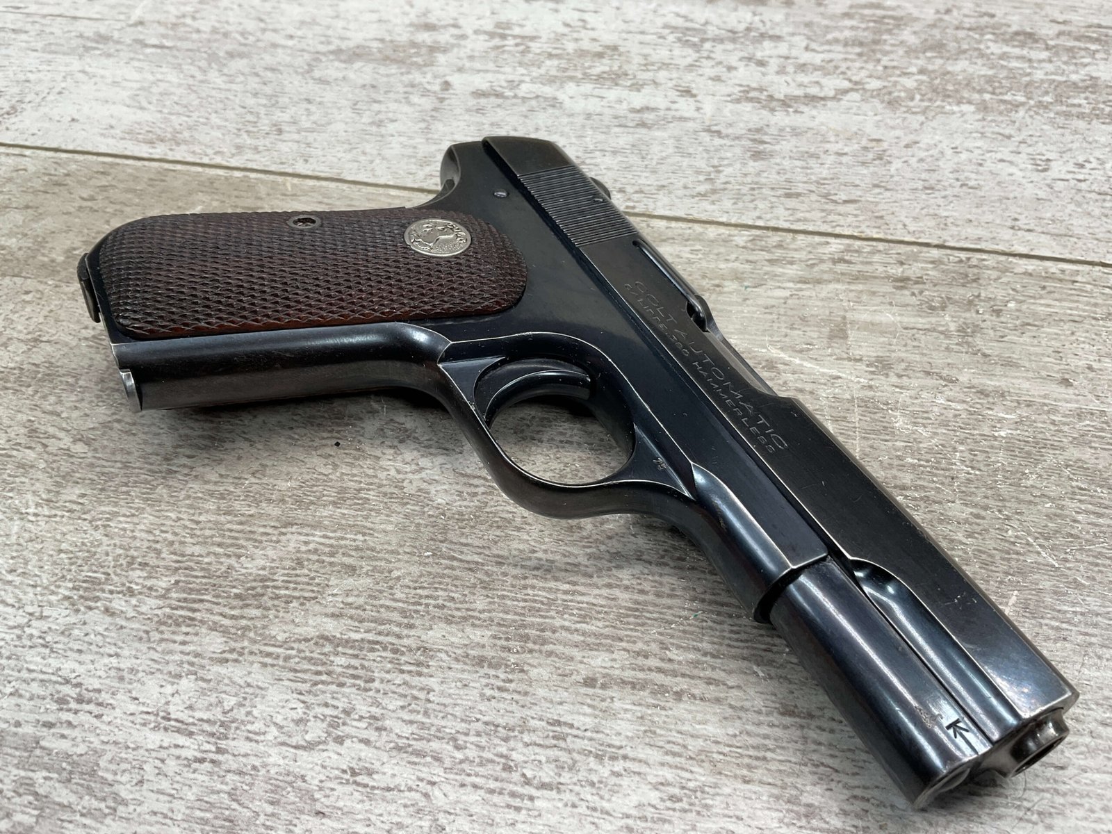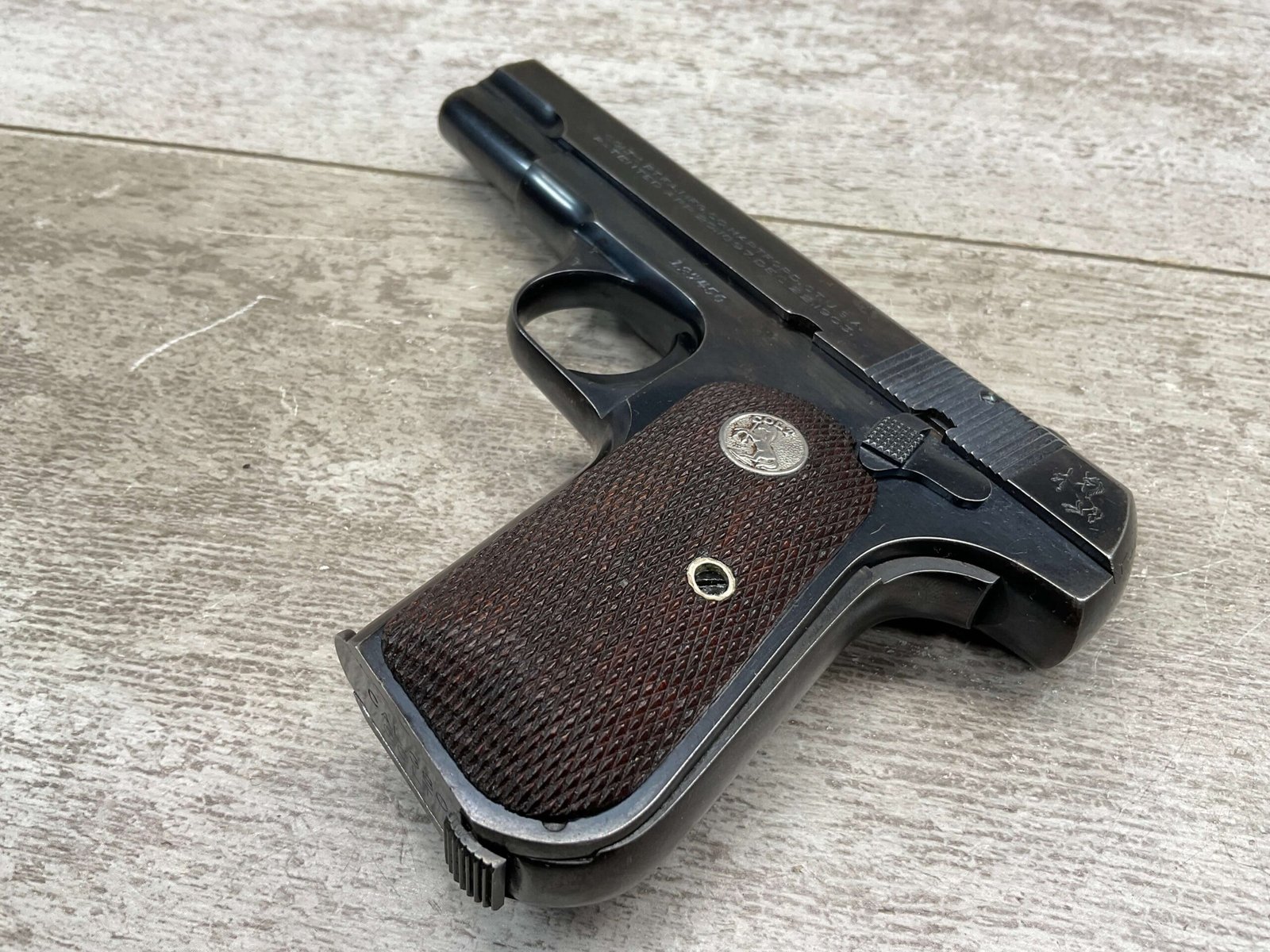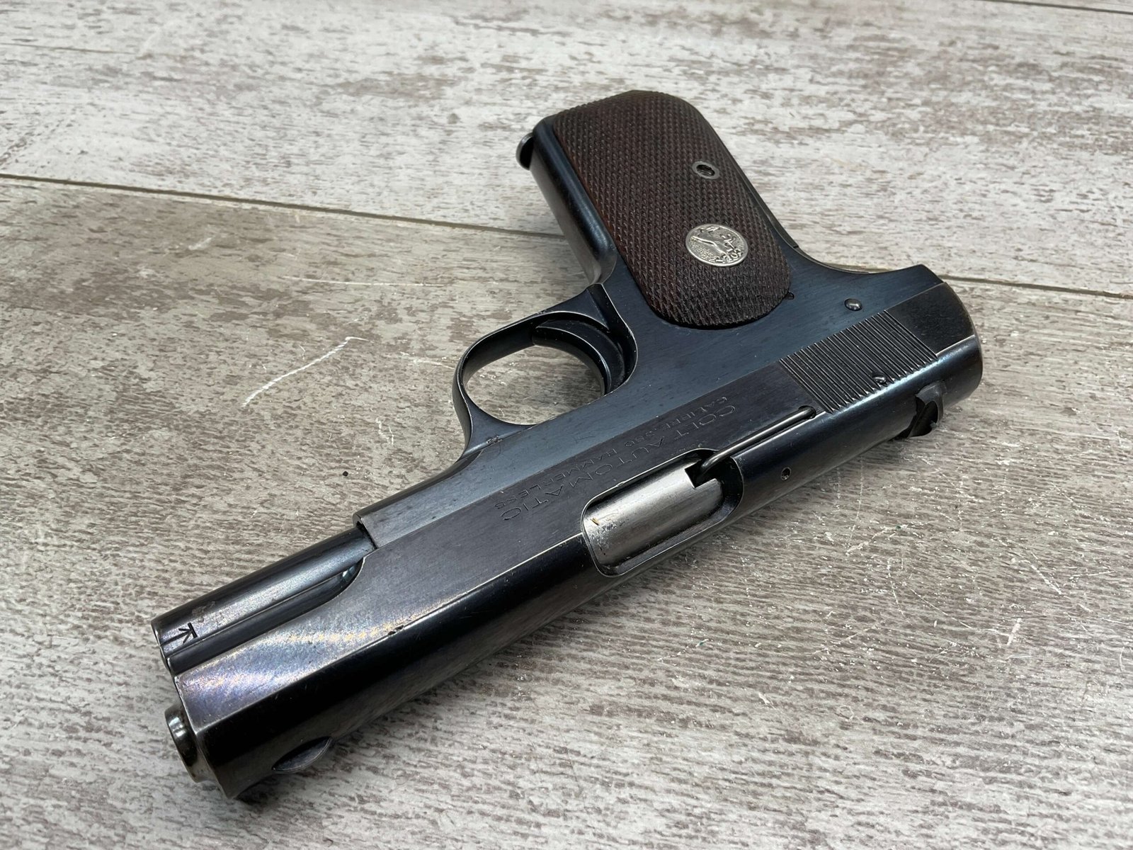 COLT MODEL 1908 HAMMERLESS .380CAL SEMI AUTO PISTOL, 1937 MFR #127450, 94+% BLUE W/LIGHT HIGH EDGE WEAR, VG/EXC BORE & RIFLING W/VERY LIGHT OXIDATION IN GROOVES, 3.75″ BBL, VG-EXC CHECKERED WALNUT GRIPS W/MEDALLION, 1 FACTORY MAGAZINE MARKED “CAL .380/COLT”, EXC OVERALL & HARD TO FIND IN THIS CONDITION!!