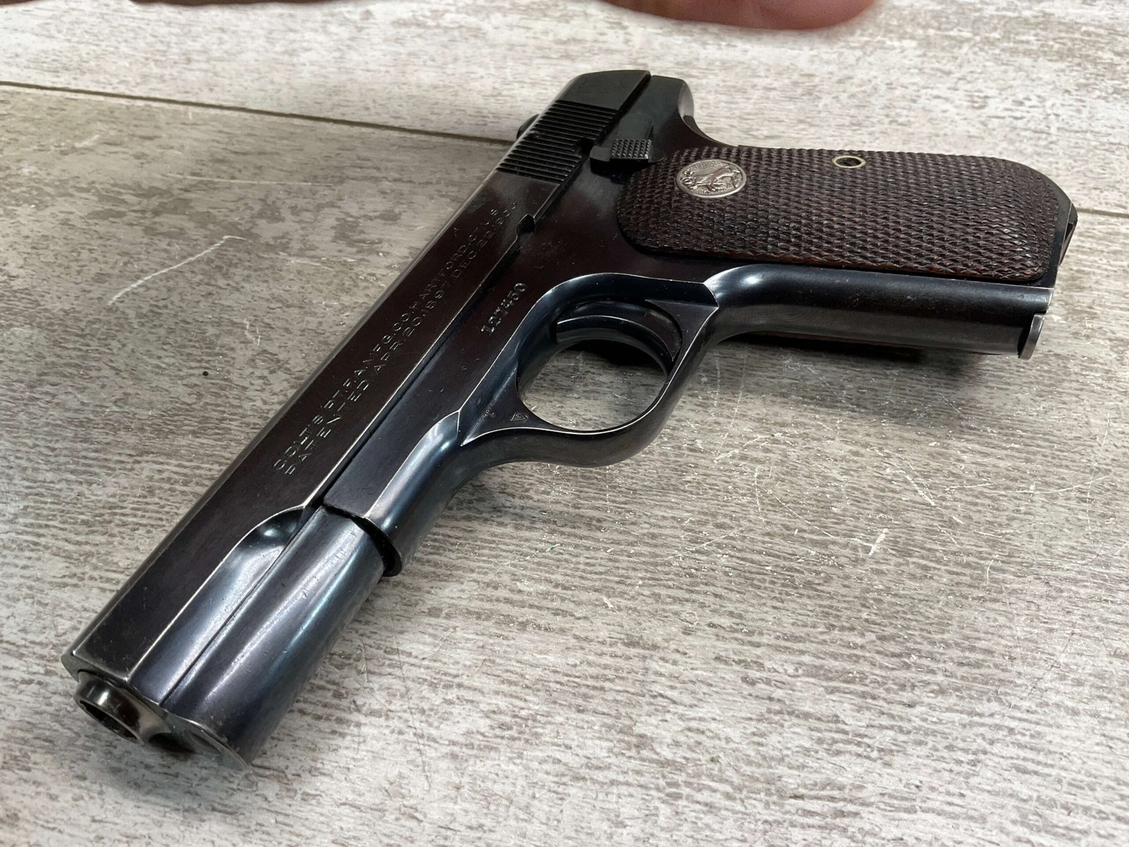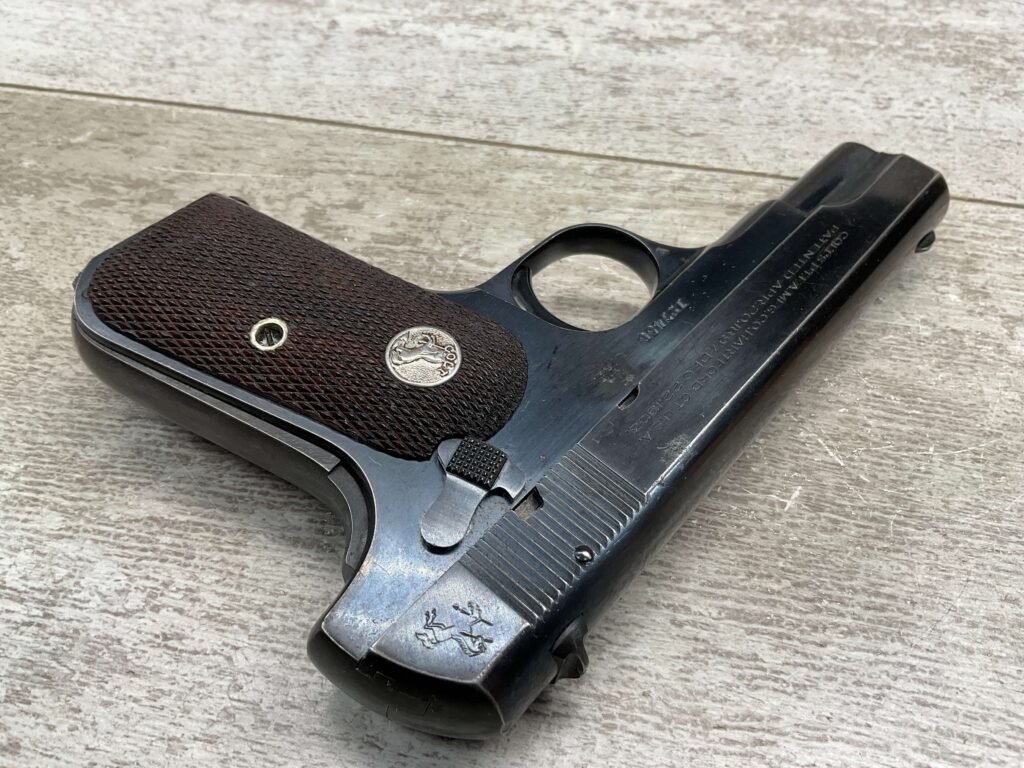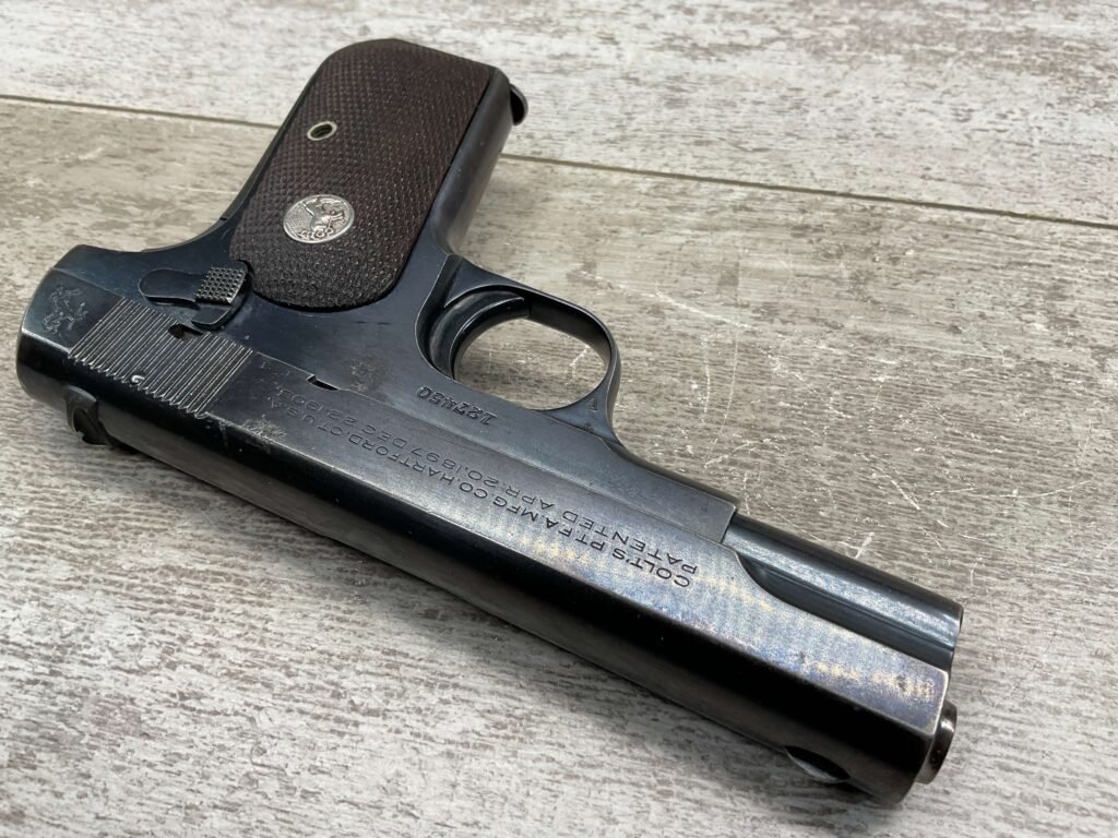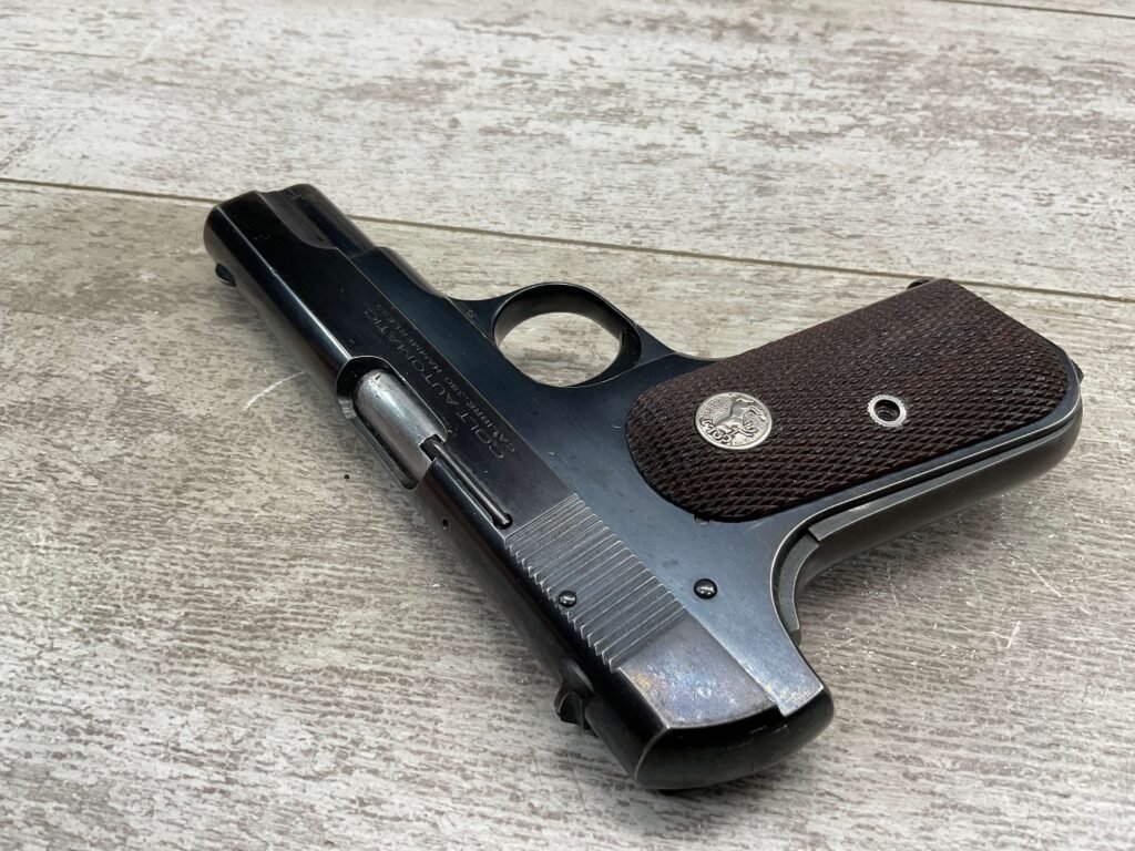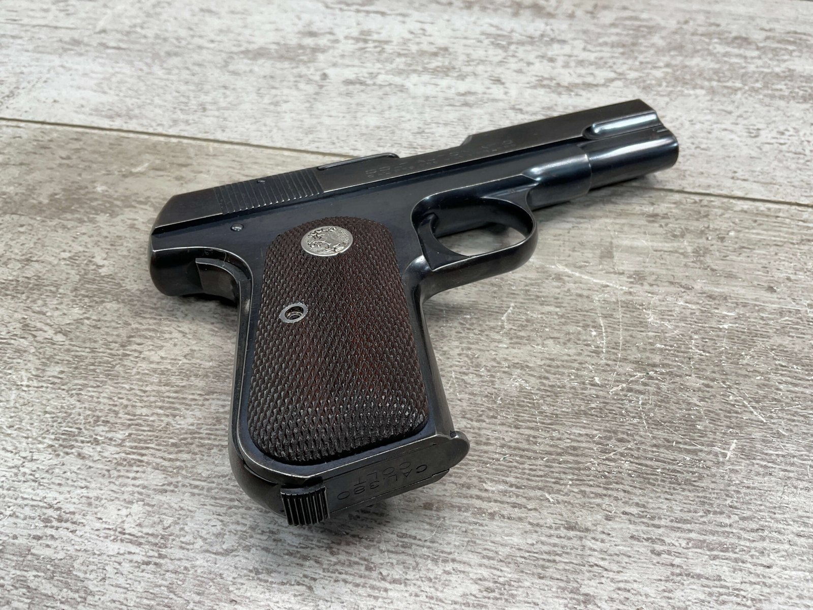 COLT MODEL 1908 HAMMERLESS .380CAL SEMI AUTO PISTOL, 1937 MFR #127450, 94+% BLUE W/LIGHT HIGH EDGE WEAR, VG/EXC BORE & RIFLING W/VERY LIGHT OXIDATION IN GROOVES, 3.75″ BBL, VG-EXC CHECKERED WALNUT GRIPS W/MEDALLION, 1 FACTORY MAGAZINE MARKED “CAL .380/COLT”, EXC OVERALL & HARD TO FIND IN THIS CONDITION!!