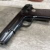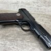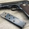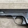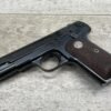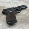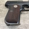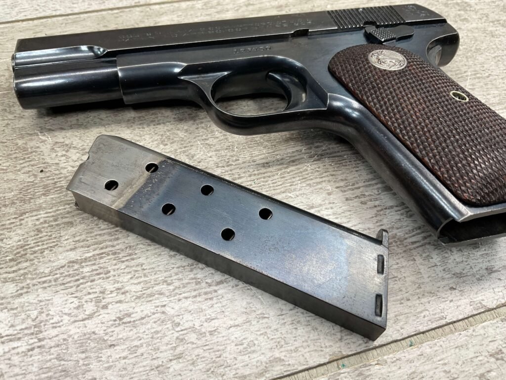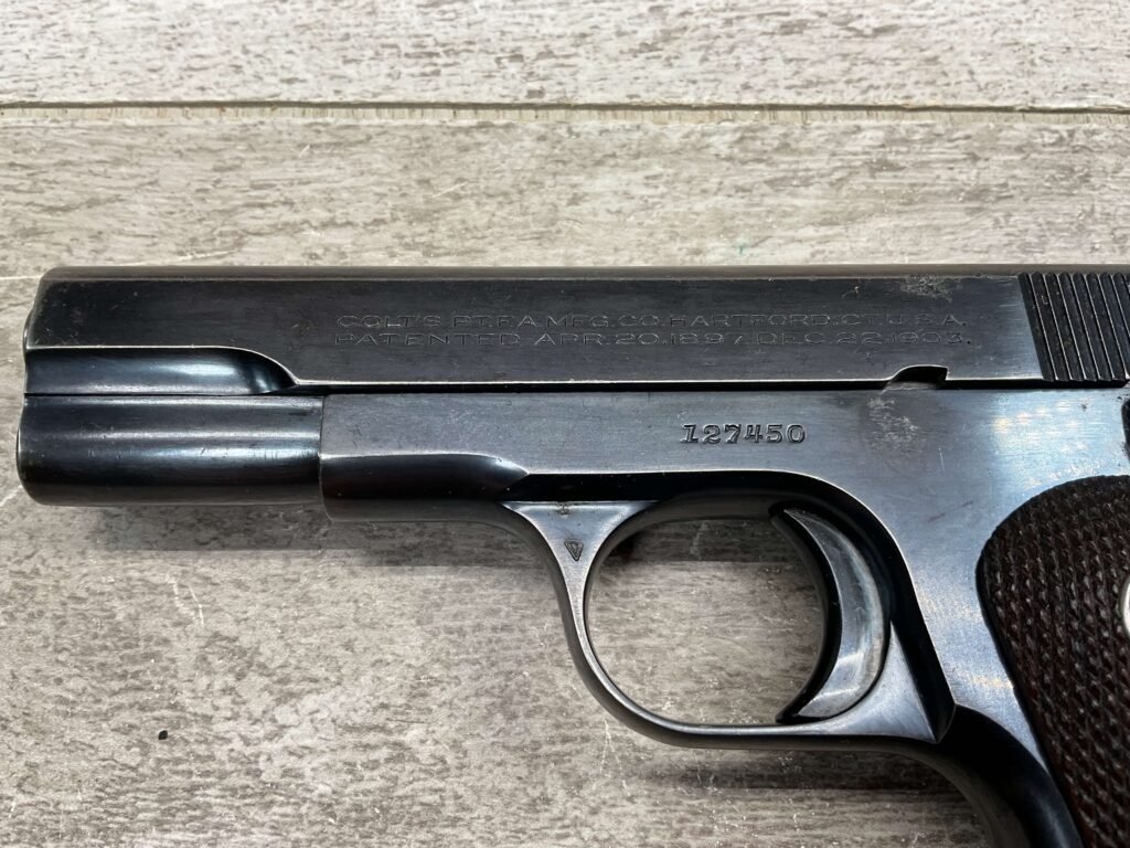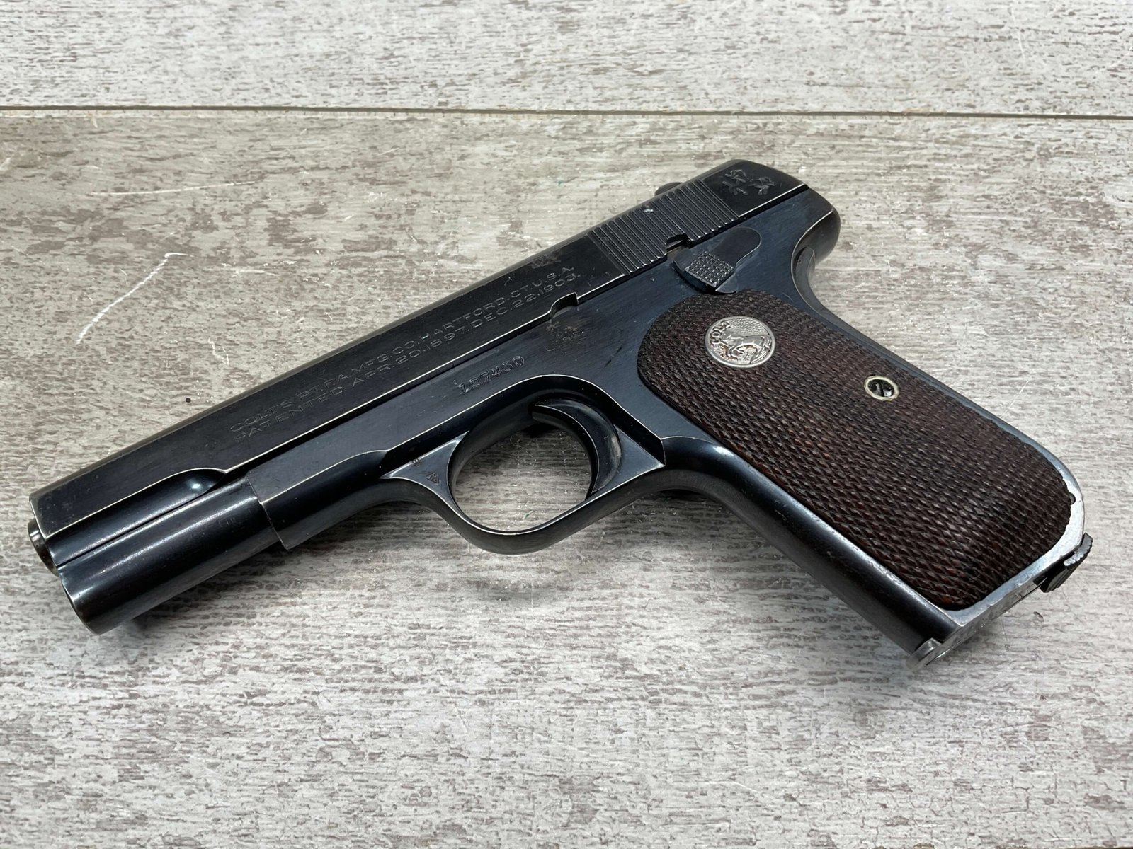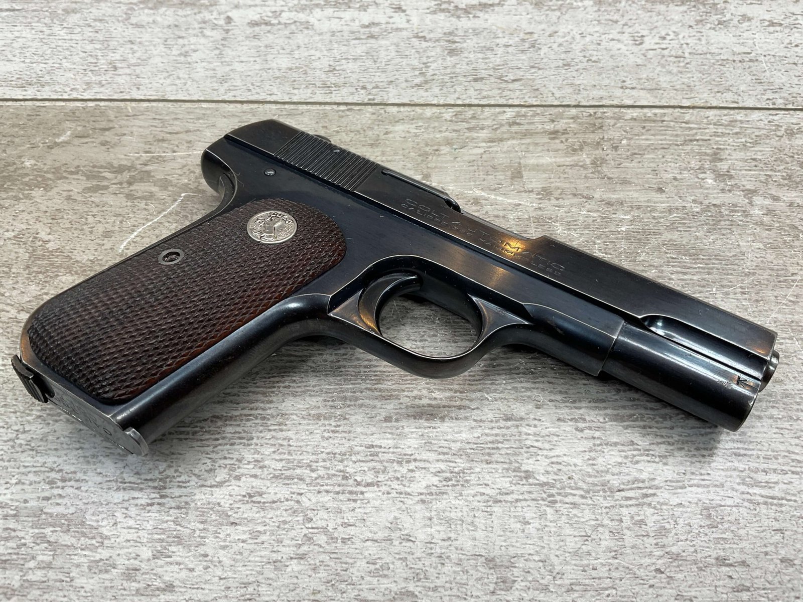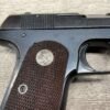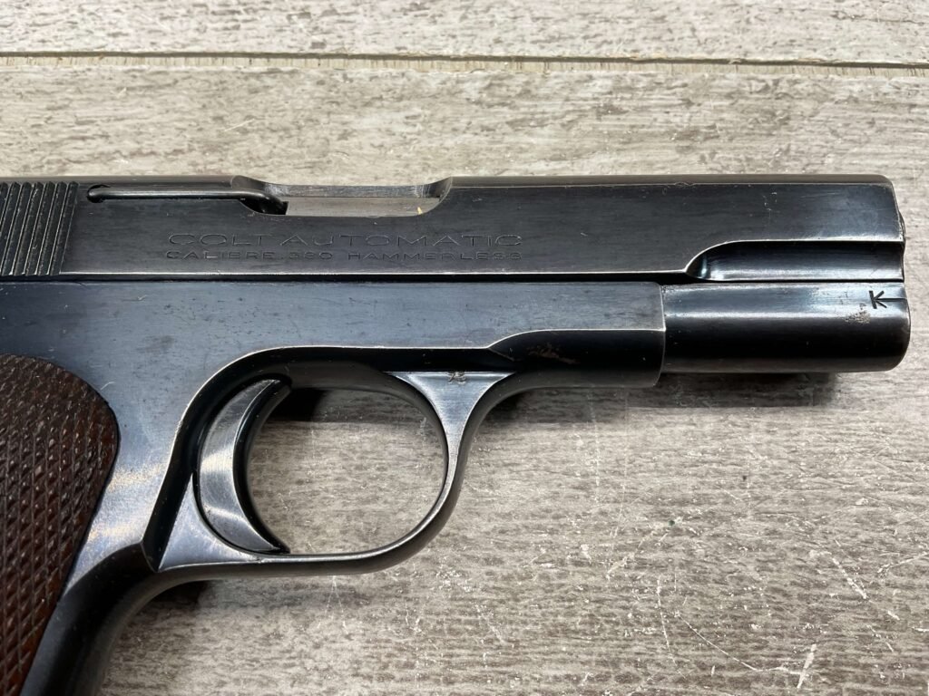 COLT MODEL 1908 HAMMERLESS .380CAL SEMI AUTO PISTOL, 1937 MFR #127450, 94+% BLUE W/LIGHT HIGH EDGE WEAR, VG/EXC BORE & RIFLING W/VERY LIGHT OXIDATION IN GROOVES, 3.75″ BBL, VG-EXC CHECKERED WALNUT GRIPS W/MEDALLION, 1 FACTORY MAGAZINE MARKED “CAL .380/COLT”, EXC OVERALL & HARD TO FIND IN THIS CONDITION!!