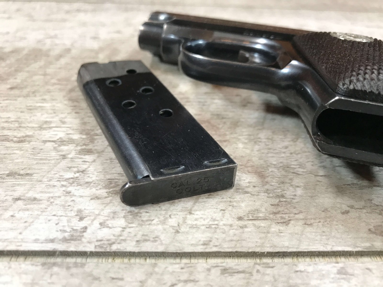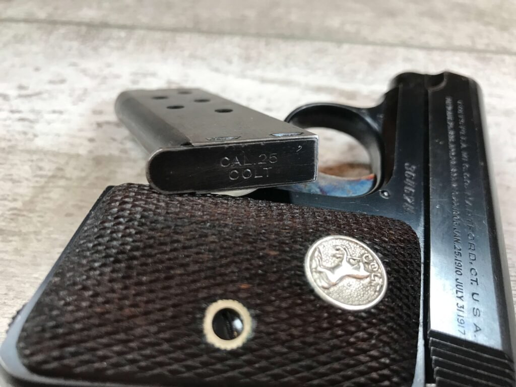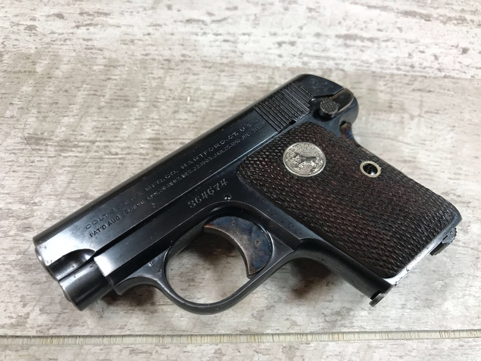 COLT MODEL 1908 POCKET .25 ACP PISTOL, MFR 1927, #364674, LEFT SIDE MARKED “COLT’S PT. F.A. MFG. CO. HARTFORD, CT. USA” OVER “PAT’D AUG.25.1896. APR.20.1897. DEC.22.1903. JAN.25.1910. JULY.31.1917.”, COLT ON SLIDE ABOVE THE SAFETY, RIGHT SIDE OF SLIDE HAS “COLT AUTOMATIC” OVER CALIBRE 25, THE RIGHT SIDE OF THE TRIGGER GUARD HAS “25”, THE MAGAZINE IS MARKED “CAL. 25/COLT”, COMES WITH 1 MAG, BRIGHT BUT FROSTY BORE, EXC BLUE, 95%