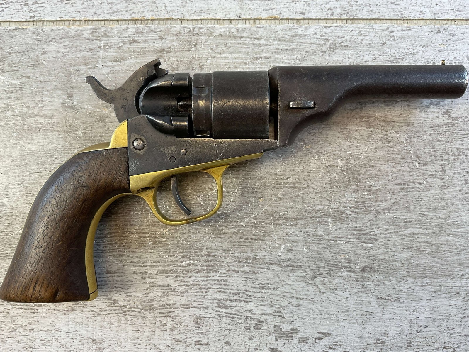 These were converted by cutting off the cylinder, inserting breech block, attaching firing pin to hammer, cutting cartridge groove on right side of frame and attaching barrel without rammer. 3-1/2 inch barrel. Mechanics are good.
