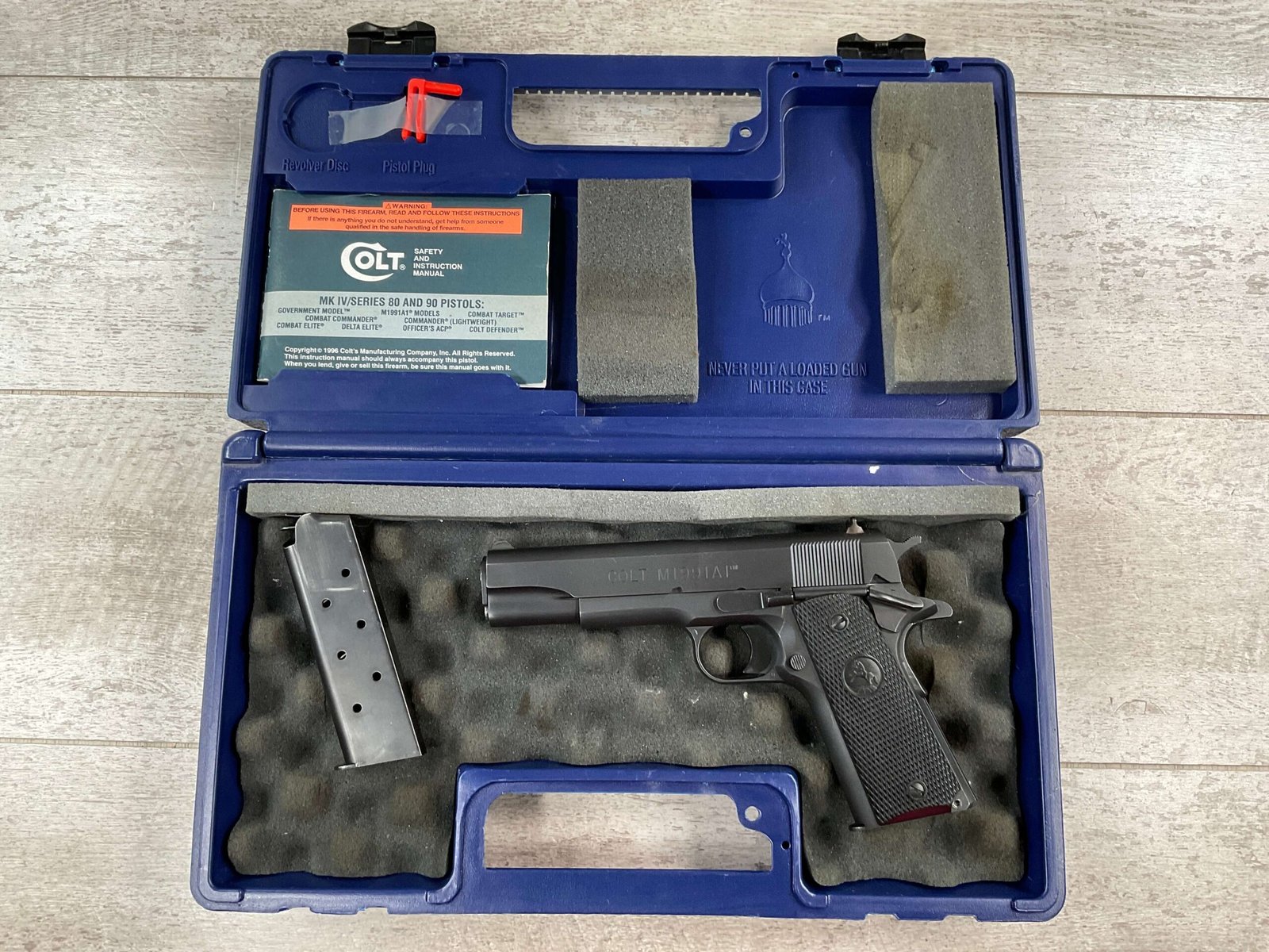 COLT MODEL M1991A1 SERIES 80 45ACP PISTOL #2786063, FACTORY COLT BLUE PLASTIC CASE, USER MANUALS INCLUDED, 2 ORIGINAL COLT SINGLE STACK MAGAZINE, SHOWS VERY LITTLE WEAR (SEE PHOTOS), ALL ORIGINAL, 98+% OVERALL