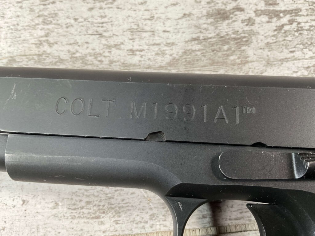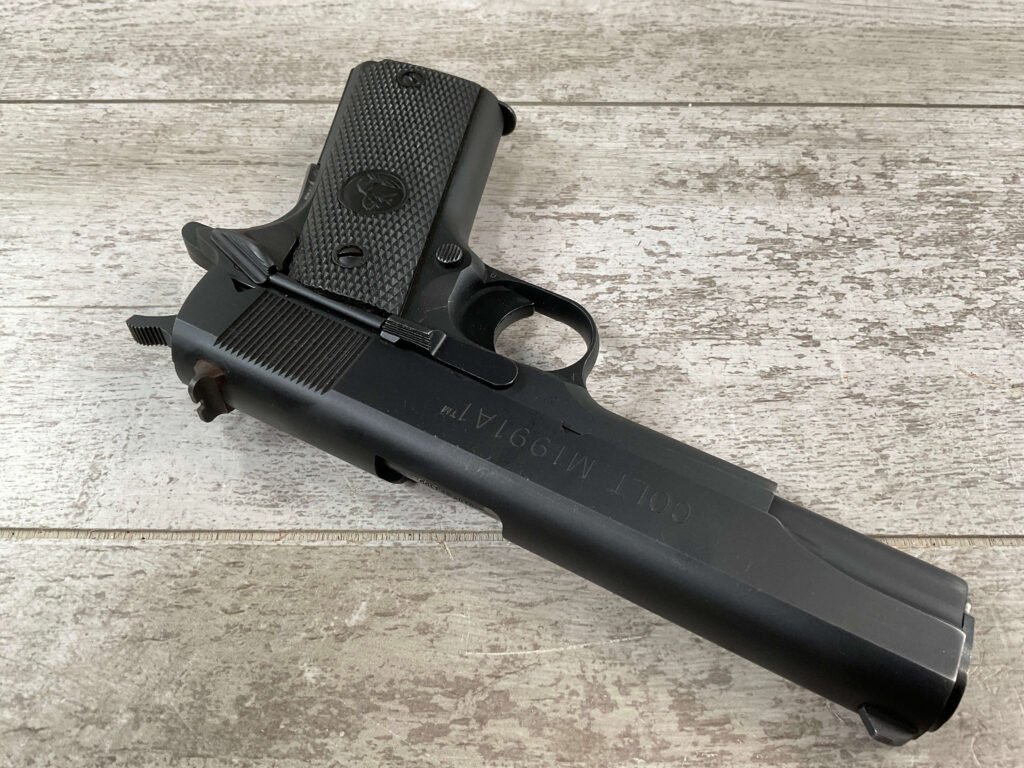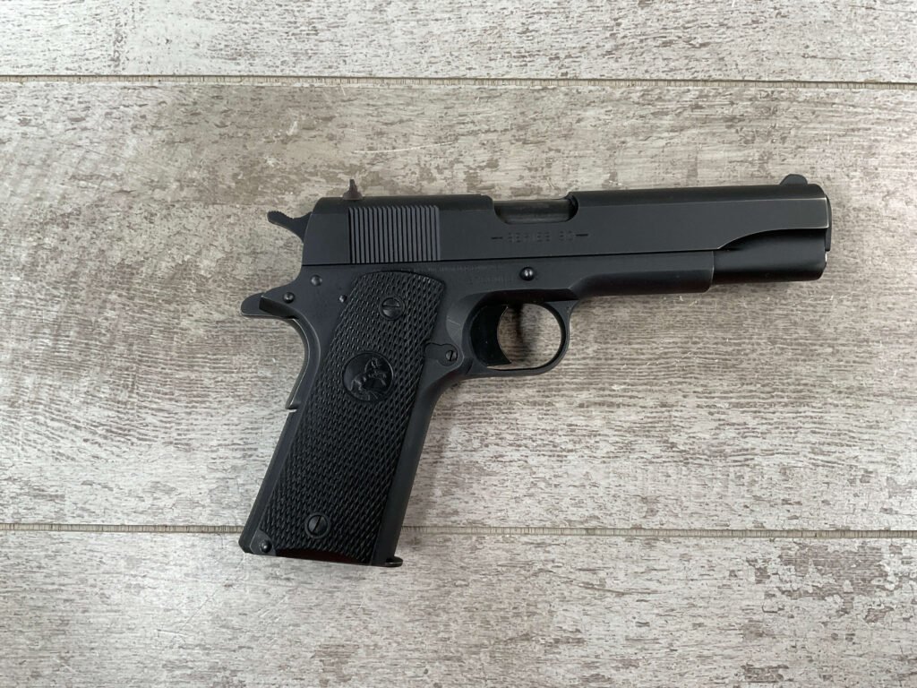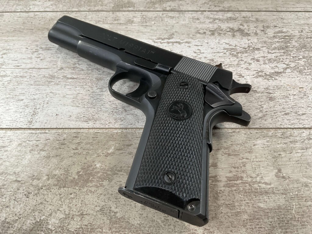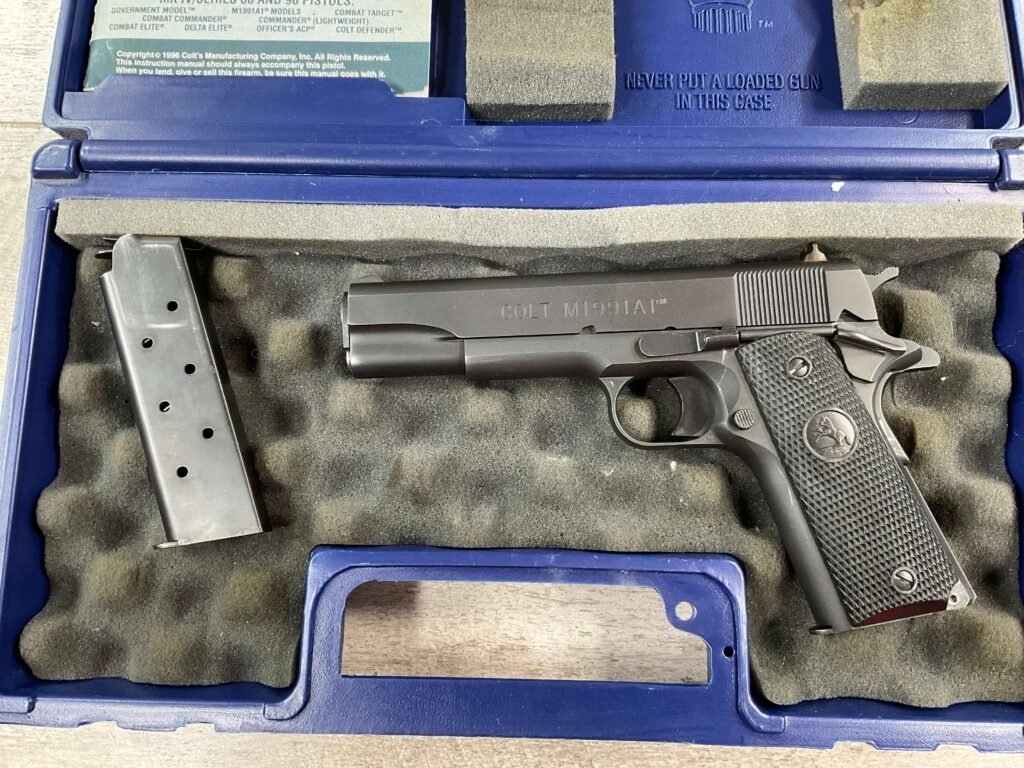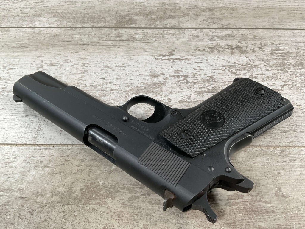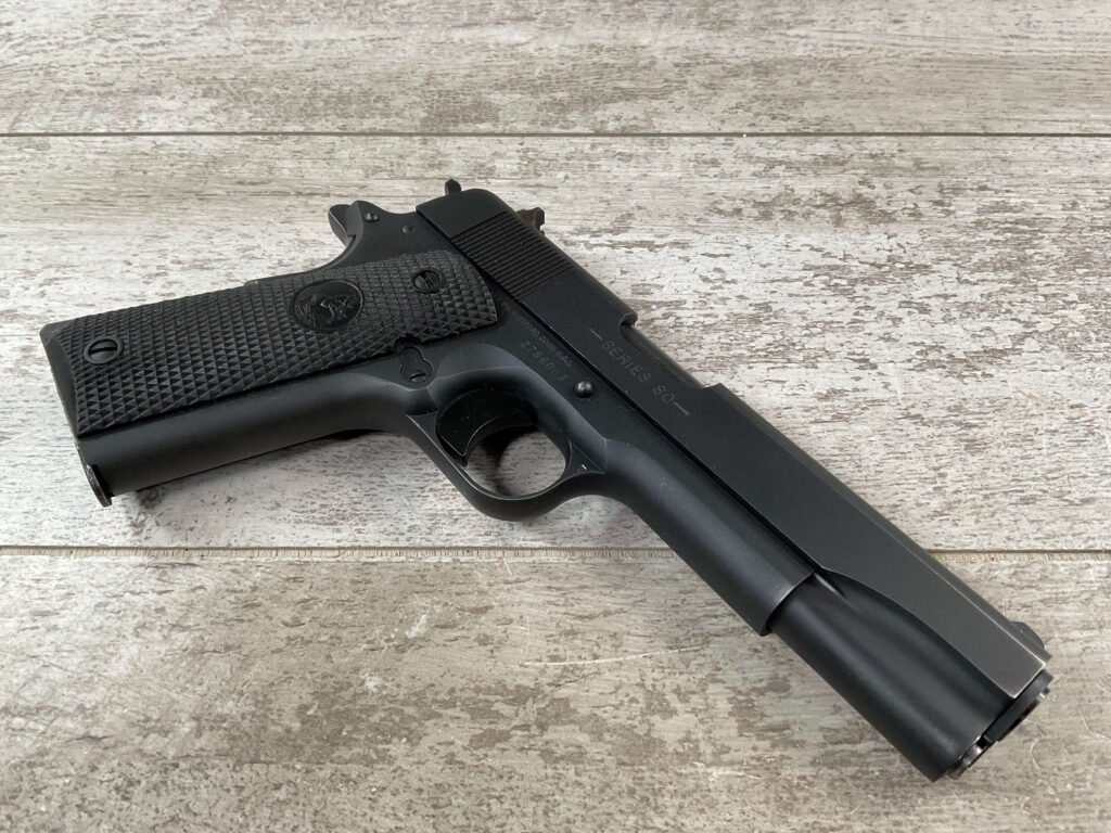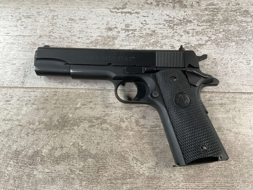 The Colt Model M1991A1 Series 80 .45 ACP is a variant of the classic M1911 pistol manufactured by Colt’s Manufacturing Company. The M1991A1 Series 80 is a modern iteration of the iconic M1911 design, which has been in production for over a century and remains a popular choice among firearms enthusiasts, competitive shooters, and military and law enforcement personnel. The “M1991A1” designation indicates that it is a model produced after 1991, incorporating some modern updates and features while maintaining the classic M1911 design. The “Series 80” refers to a specific internal firing mechanism design introduced by Colt. In the Series 80 design, an additional firing pin safety block is incorporated into the pistol’s internal mechanism to enhance safety and prevent accidental discharges. The M1991A1 is often referred to as the “Government Model” due to its full-size frame and barrel. It typically features a 5-inch barrel and a single-stack magazine with a capacity of 7-8 rounds. The frame of the M1991A1 is typically constructed from carbon steel, offering durability and a solid feel in the hand. Some models may feature stainless steel frames for enhanced corrosion resistance. Like the original M1911, the M1991A1 features traditional controls, including a slide stop, thumb safety, and grip safety, allowing for familiar operation for those accustomed to the M1911 platform.