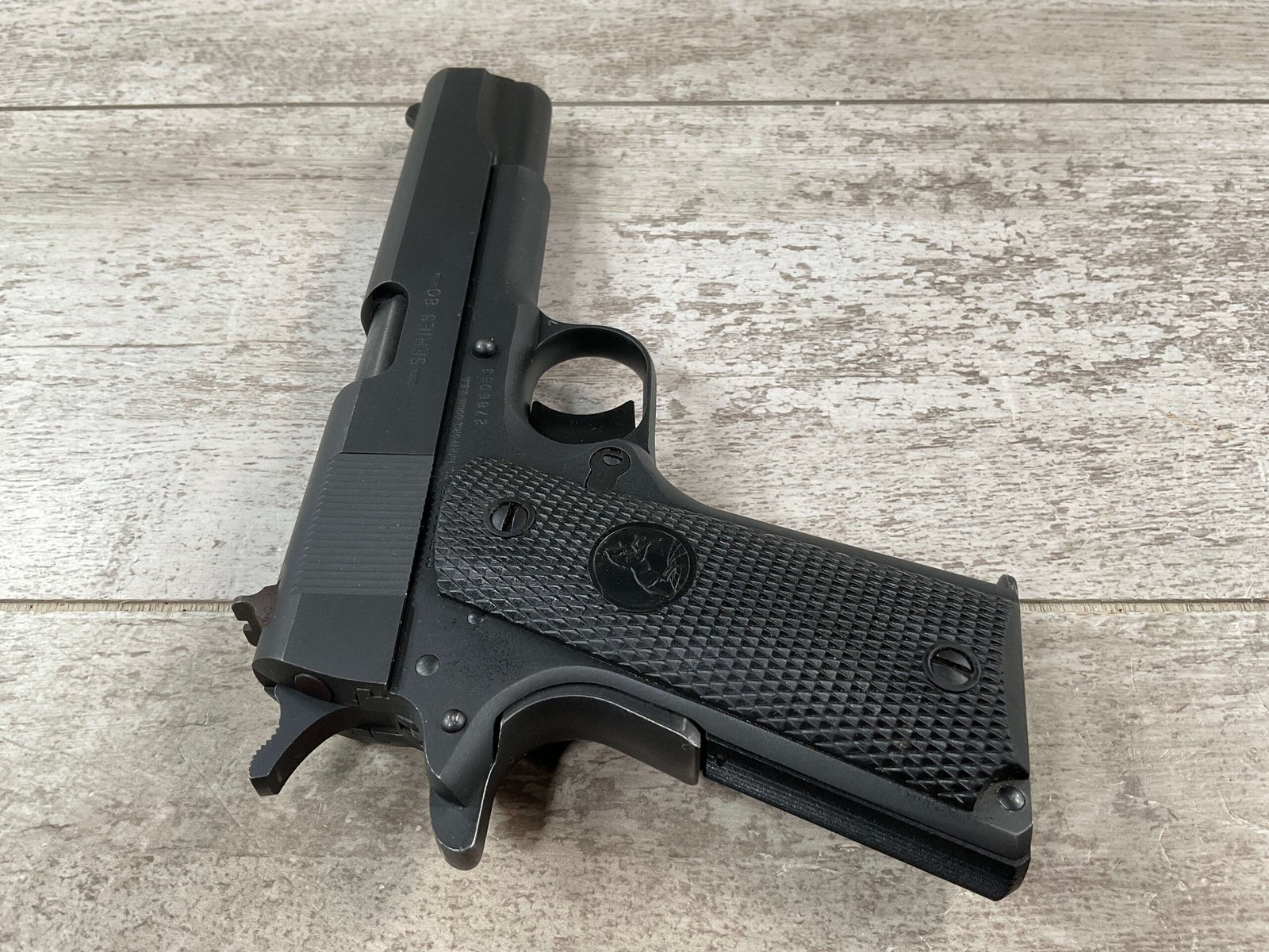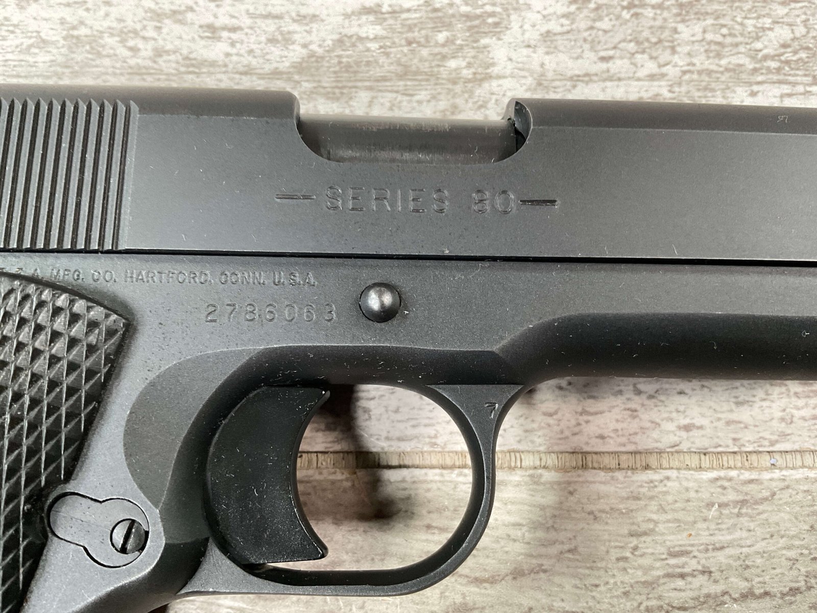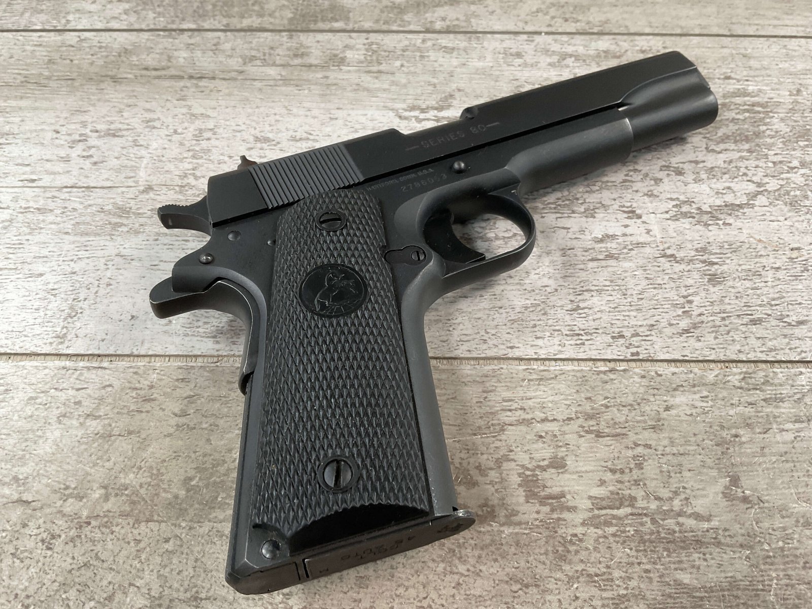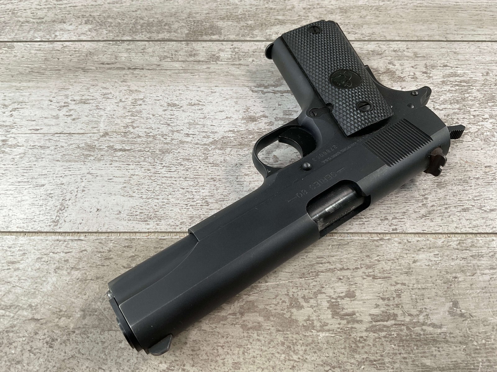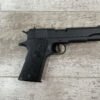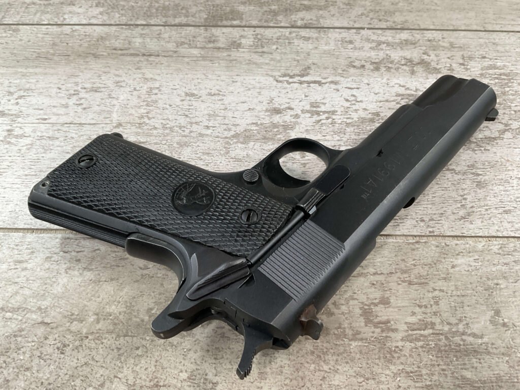 The Colt Model M1991A1 Series 80 .45 ACP is a variant of the classic M1911 pistol manufactured by Colt’s Manufacturing Company. The M1991A1 Series 80 is a modern iteration of the iconic M1911 design, which has been in production for over a century and remains a popular choice among firearms enthusiasts, competitive shooters, and military and law enforcement personnel. The “M1991A1” designation indicates that it is a model produced after 1991, incorporating some modern updates and features while maintaining the classic M1911 design. The “Series 80” refers to a specific internal firing mechanism design introduced by Colt. In the Series 80 design, an additional firing pin safety block is incorporated into the pistol’s internal mechanism to enhance safety and prevent accidental discharges. The M1991A1 is often referred to as the “Government Model” due to its full-size frame and barrel. It typically features a 5-inch barrel and a single-stack magazine with a capacity of 7-8 rounds. The frame of the M1991A1 is typically constructed from carbon steel, offering durability and a solid feel in the hand. Some models may feature stainless steel frames for enhanced corrosion resistance. Like the original M1911, the M1991A1 features traditional controls, including a slide stop, thumb safety, and grip safety, allowing for familiar operation for those accustomed to the M1911 platform.