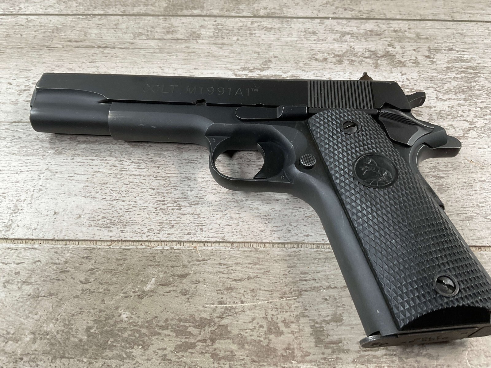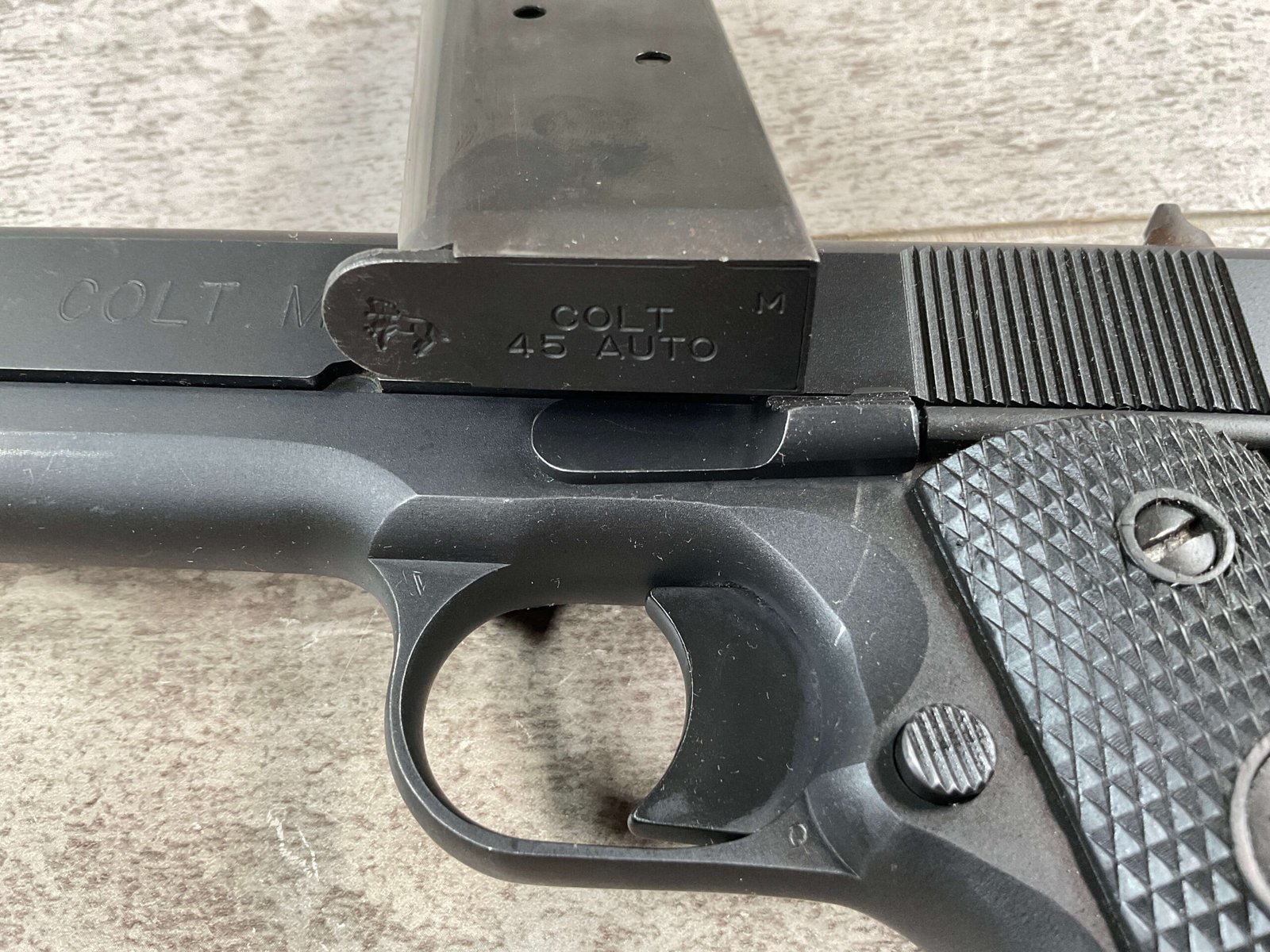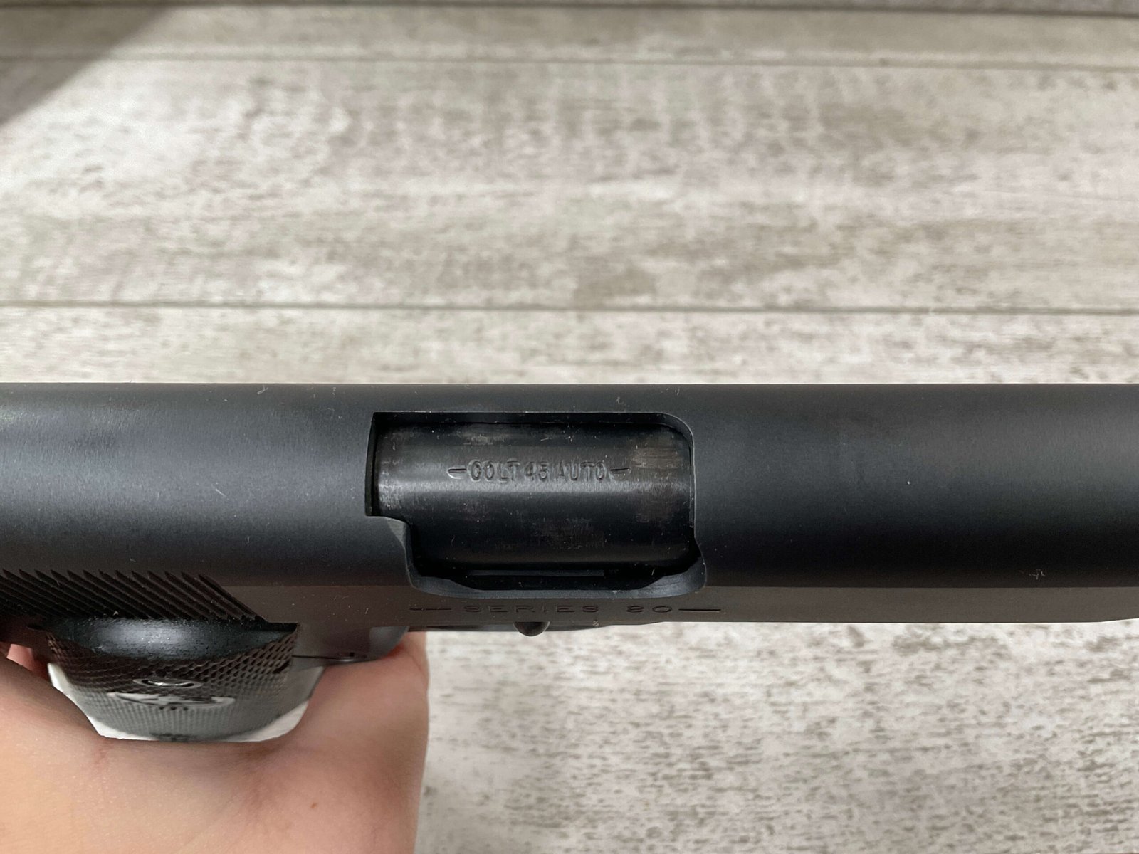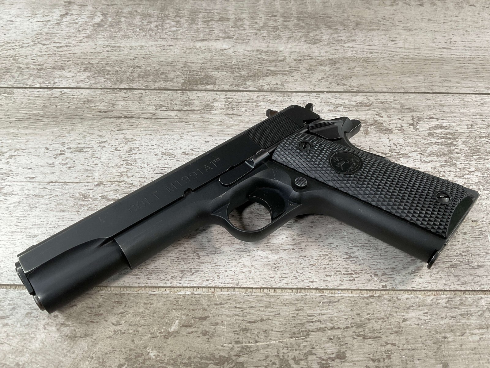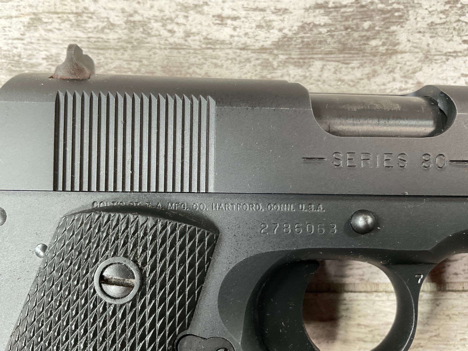 The Colt Model M1991A1 Series 80 .45 ACP is a variant of the classic M1911 pistol manufactured by Colt’s Manufacturing Company. The M1991A1 Series 80 is a modern iteration of the iconic M1911 design, which has been in production for over a century and remains a popular choice among firearms enthusiasts, competitive shooters, and military and law enforcement personnel. The “M1991A1” designation indicates that it is a model produced after 1991, incorporating some modern updates and features while maintaining the classic M1911 design. The “Series 80” refers to a specific internal firing mechanism design introduced by Colt. In the Series 80 design, an additional firing pin safety block is incorporated into the pistol’s internal mechanism to enhance safety and prevent accidental discharges. The M1991A1 is often referred to as the “Government Model” due to its full-size frame and barrel. It typically features a 5-inch barrel and a single-stack magazine with a capacity of 7-8 rounds. The frame of the M1991A1 is typically constructed from carbon steel, offering durability and a solid feel in the hand. Some models may feature stainless steel frames for enhanced corrosion resistance. Like the original M1911, the M1991A1 features traditional controls, including a slide stop, thumb safety, and grip safety, allowing for familiar operation for those accustomed to the M1911 platform.