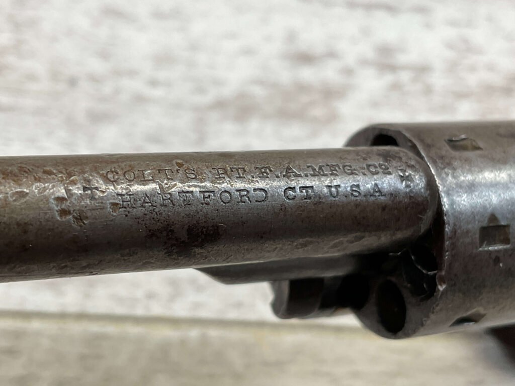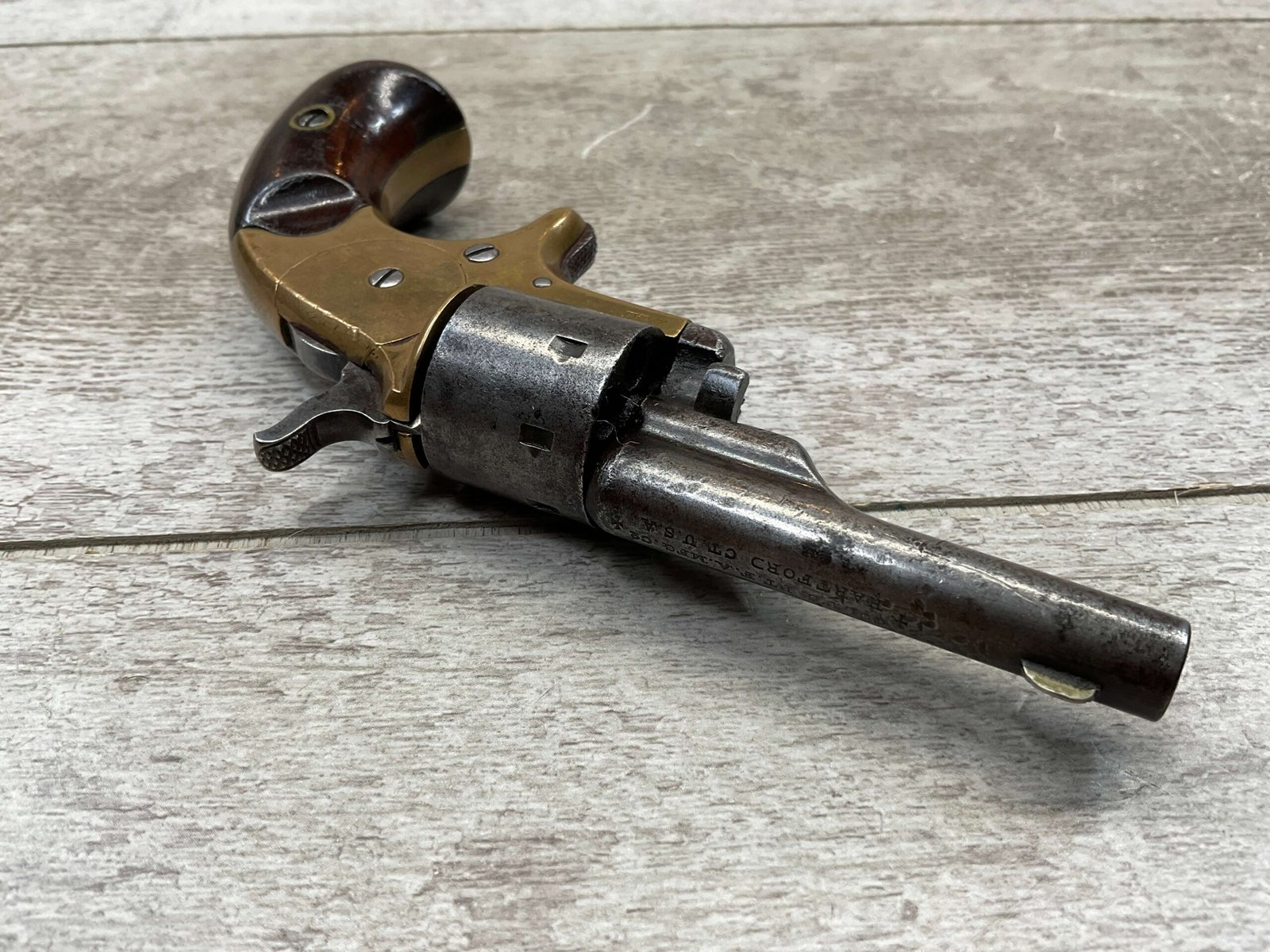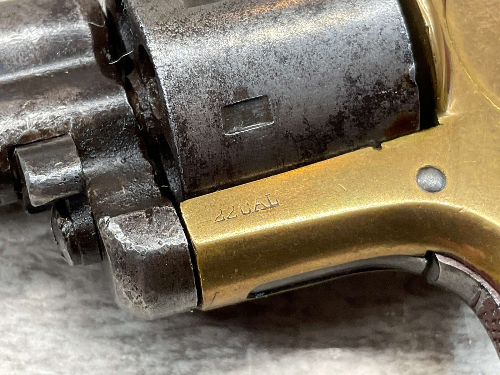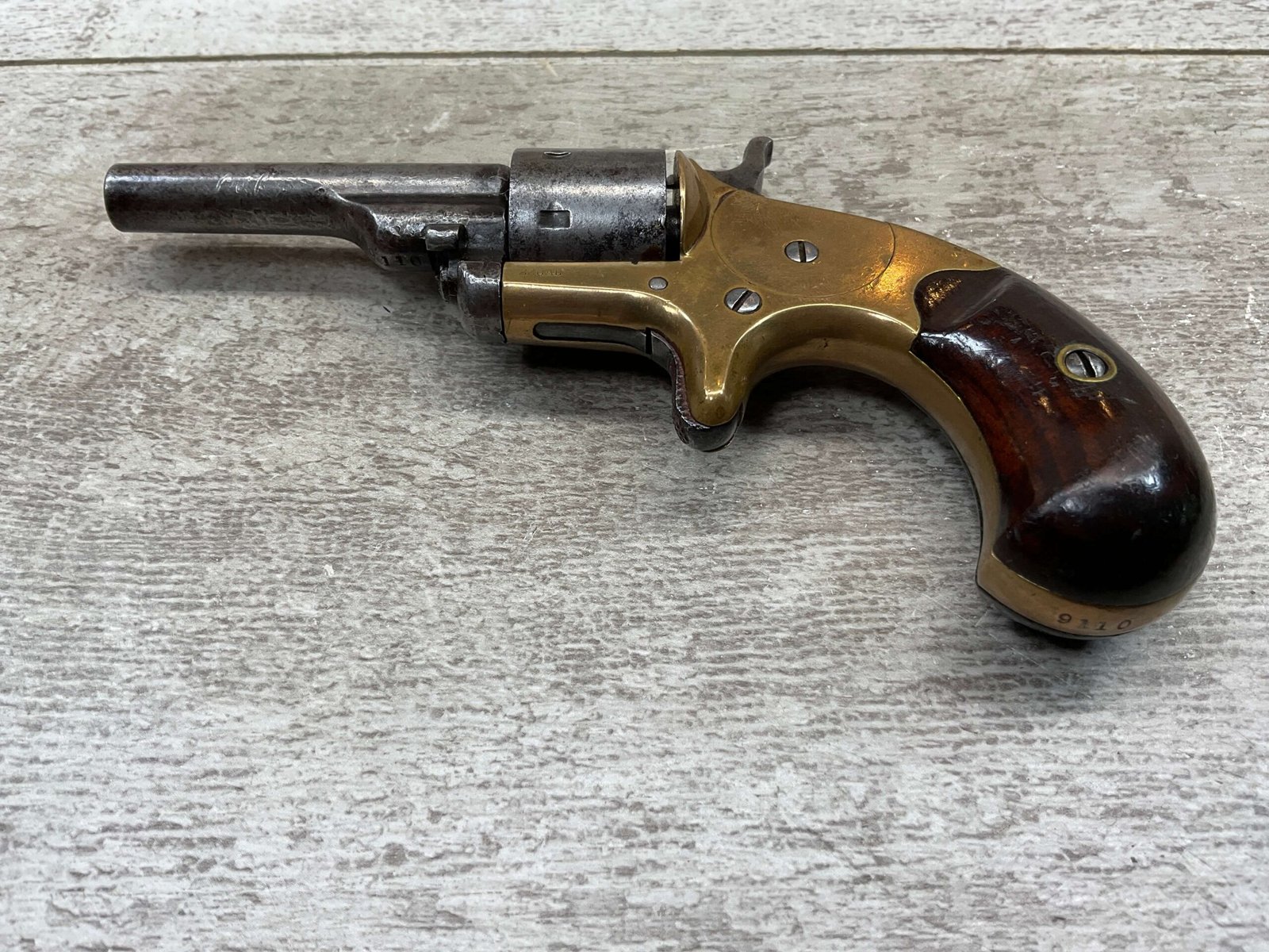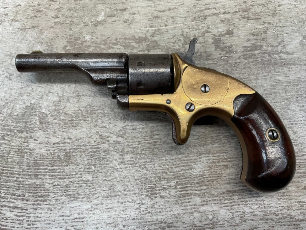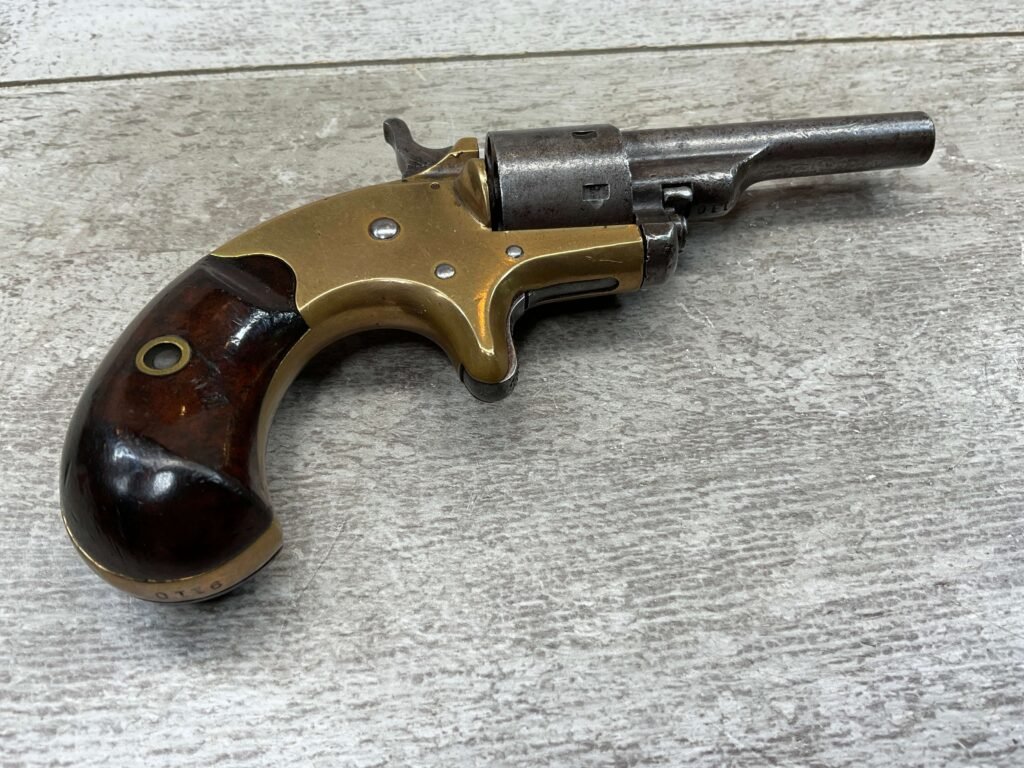 COLT OPEN TOP POCKET MODEL .22 CAL REVOLVER, ANTIQUE #9110, NON WORKING (BARREL DOESN’T ROTATE TO NEXT CHAMBER, ALL PARTS APPEAR TO BE INTACT AS I CAN GET IT TO ROTATE WHEN I PULL THE HAMMER BACK W/ THE COVER OFF), VERY NICE BRASS FRAME, EXC MATCHING SMOOTH WALNUT GRIPS, BLUE HAS TURNED GREY PATINA W/ LIGHT PITTING IN AREAS, DARKER FROSTED BORE W/ VERY STRONG RIFLING, NOT A REPRODUCTION, OVERALL CONDITION AS SEEN IN PHOTOS